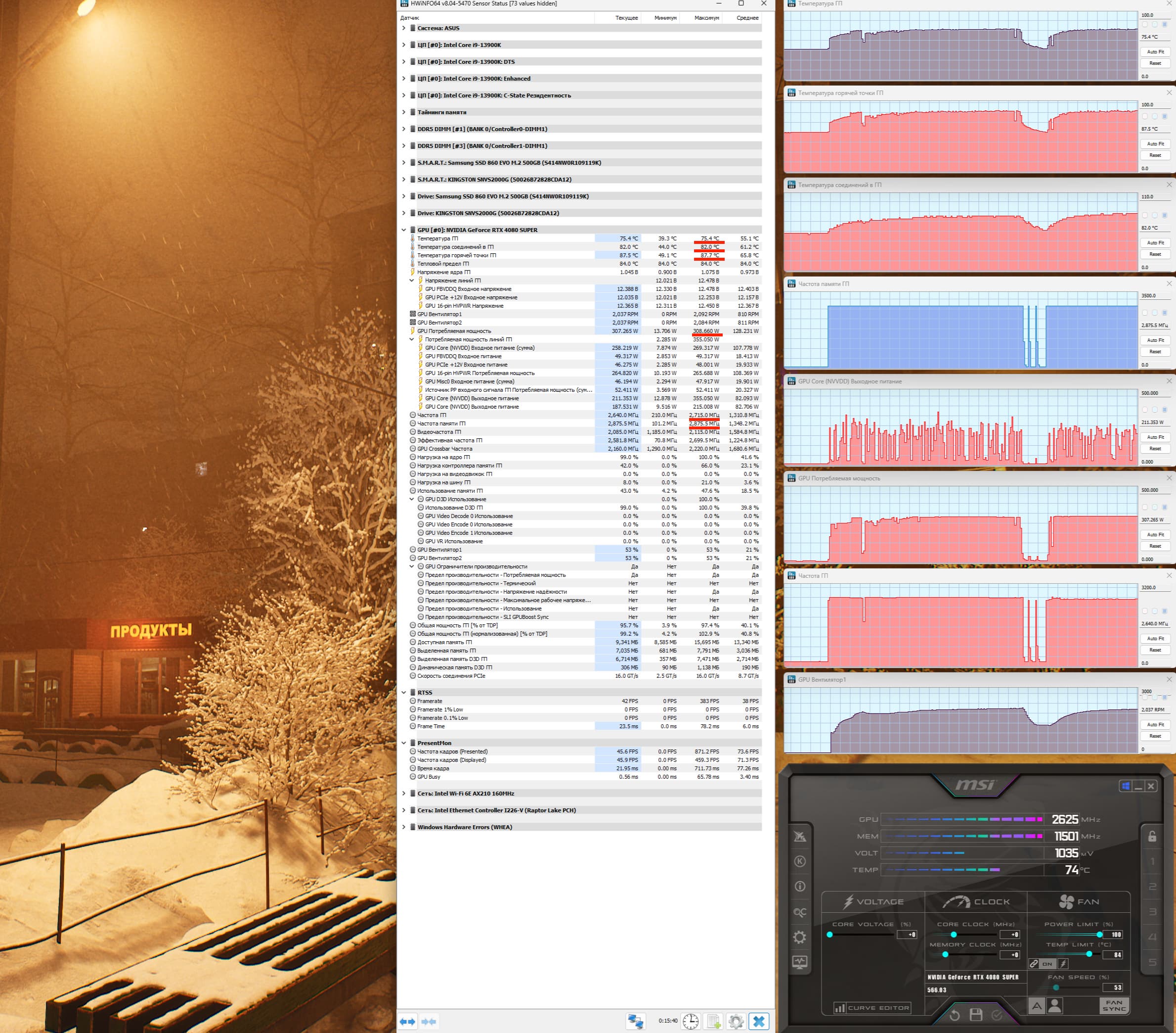 После прогона под нагрузкой максимальная температура ядра не превысила 75 градусов (самой горячей точки — 88 °C), а температура микросхем памяти — 82 градусов, что является приемлемым результатом для видеокарт топового уровня (с учетом относительно компактной СО). Энергопотребление карты доходило до 309 Вт. Напомним, что безопасный предел нагрева памяти GDDR6X — 105 °C.
