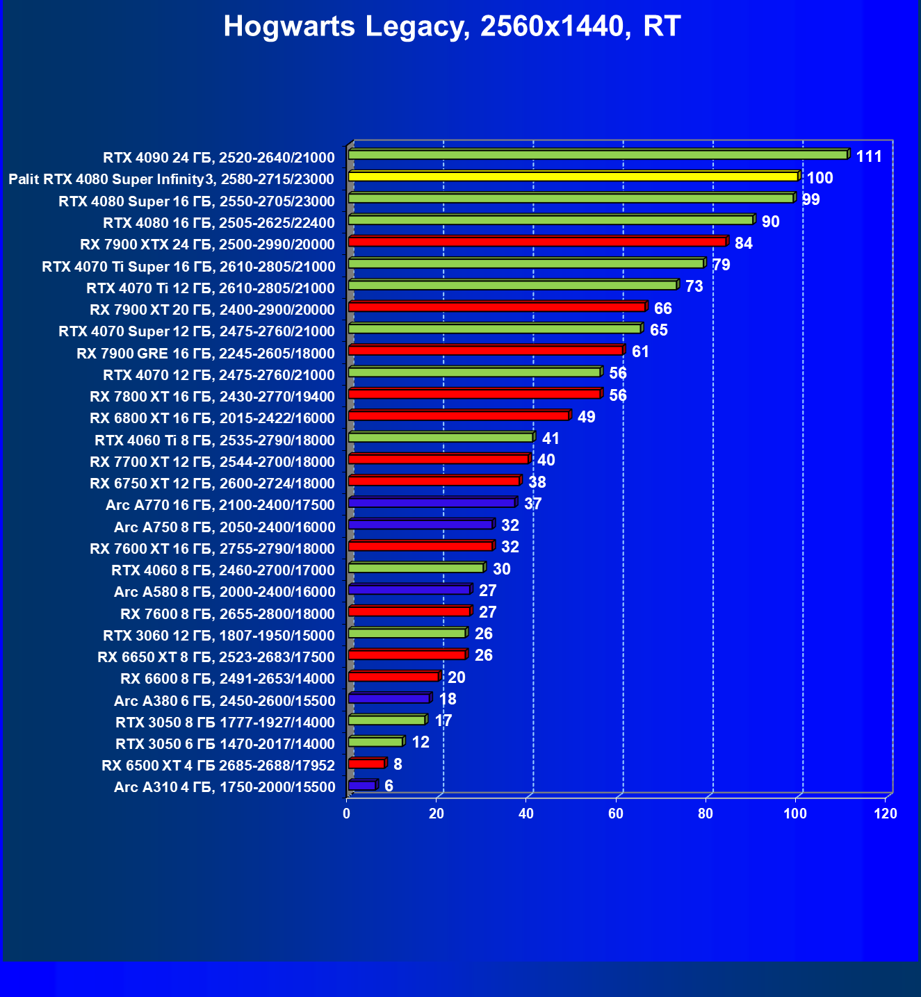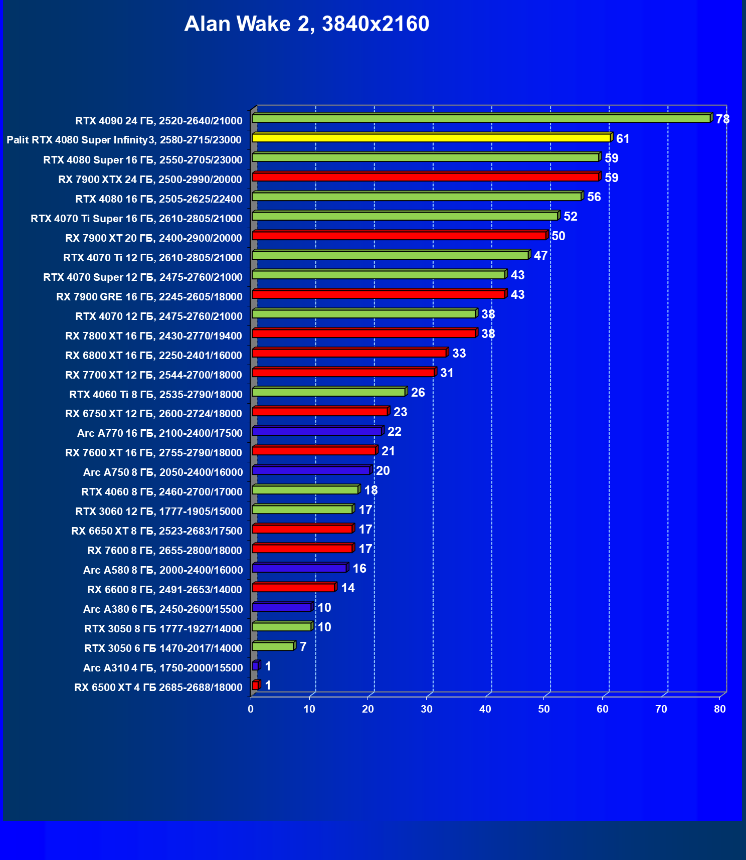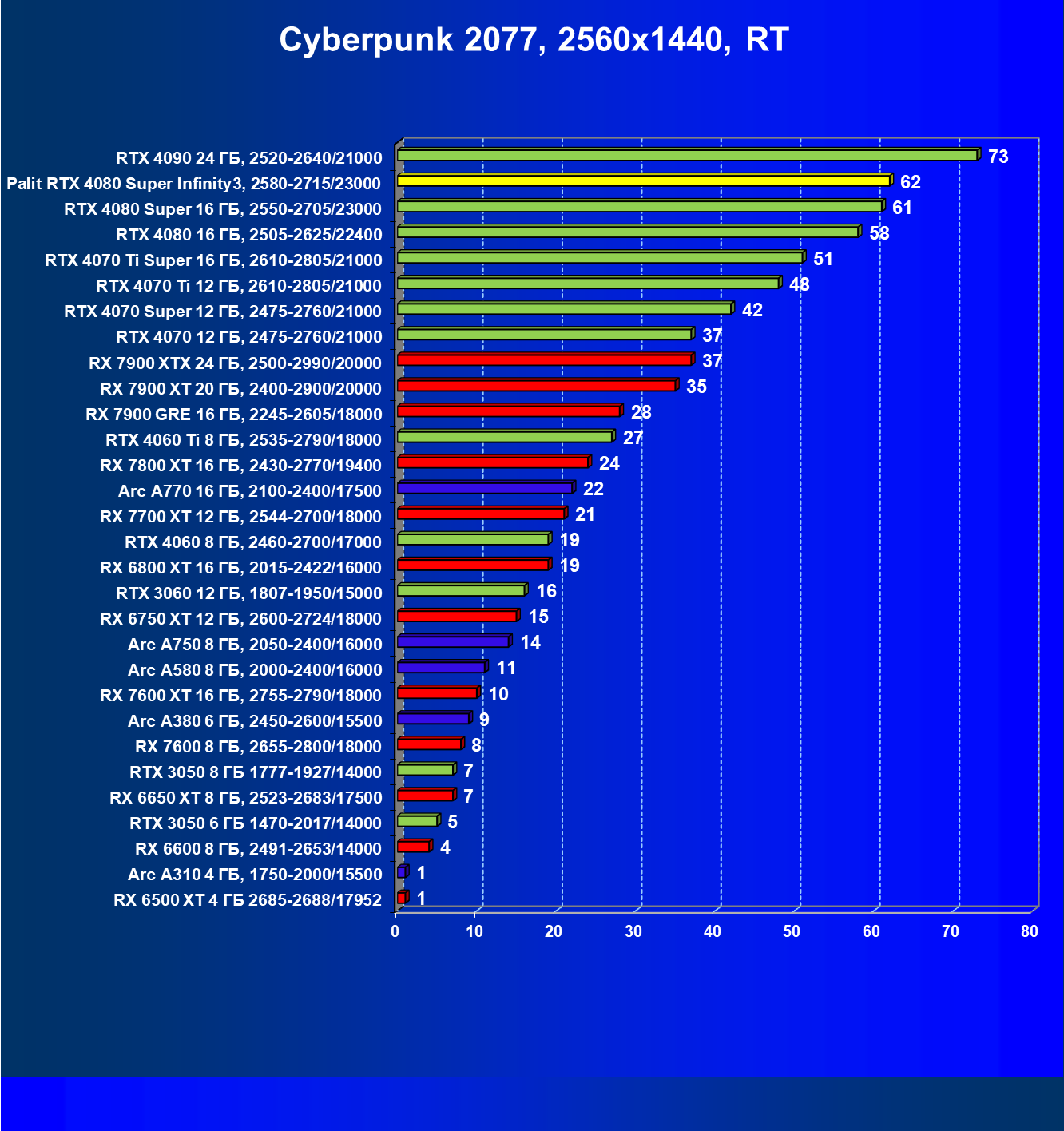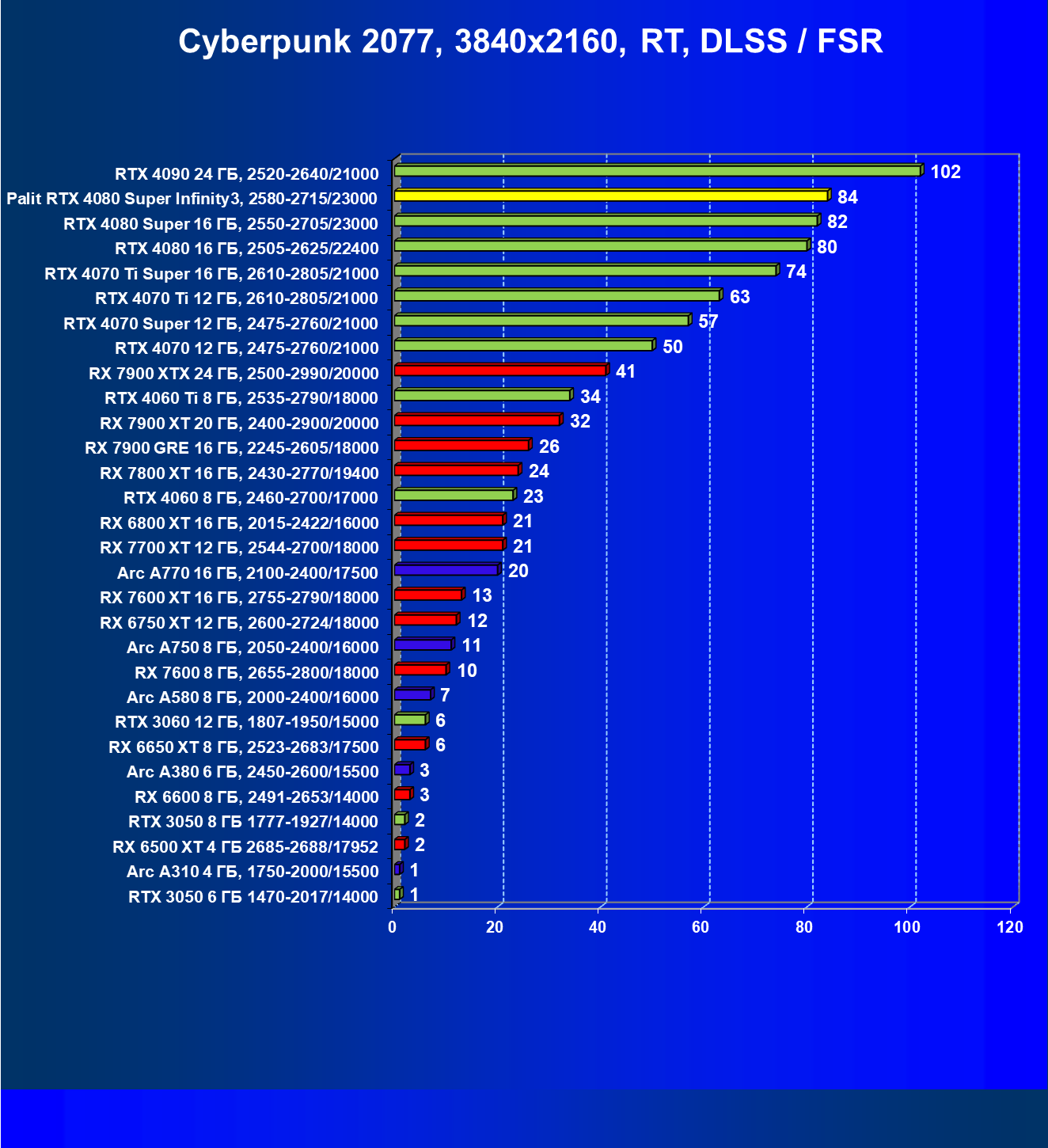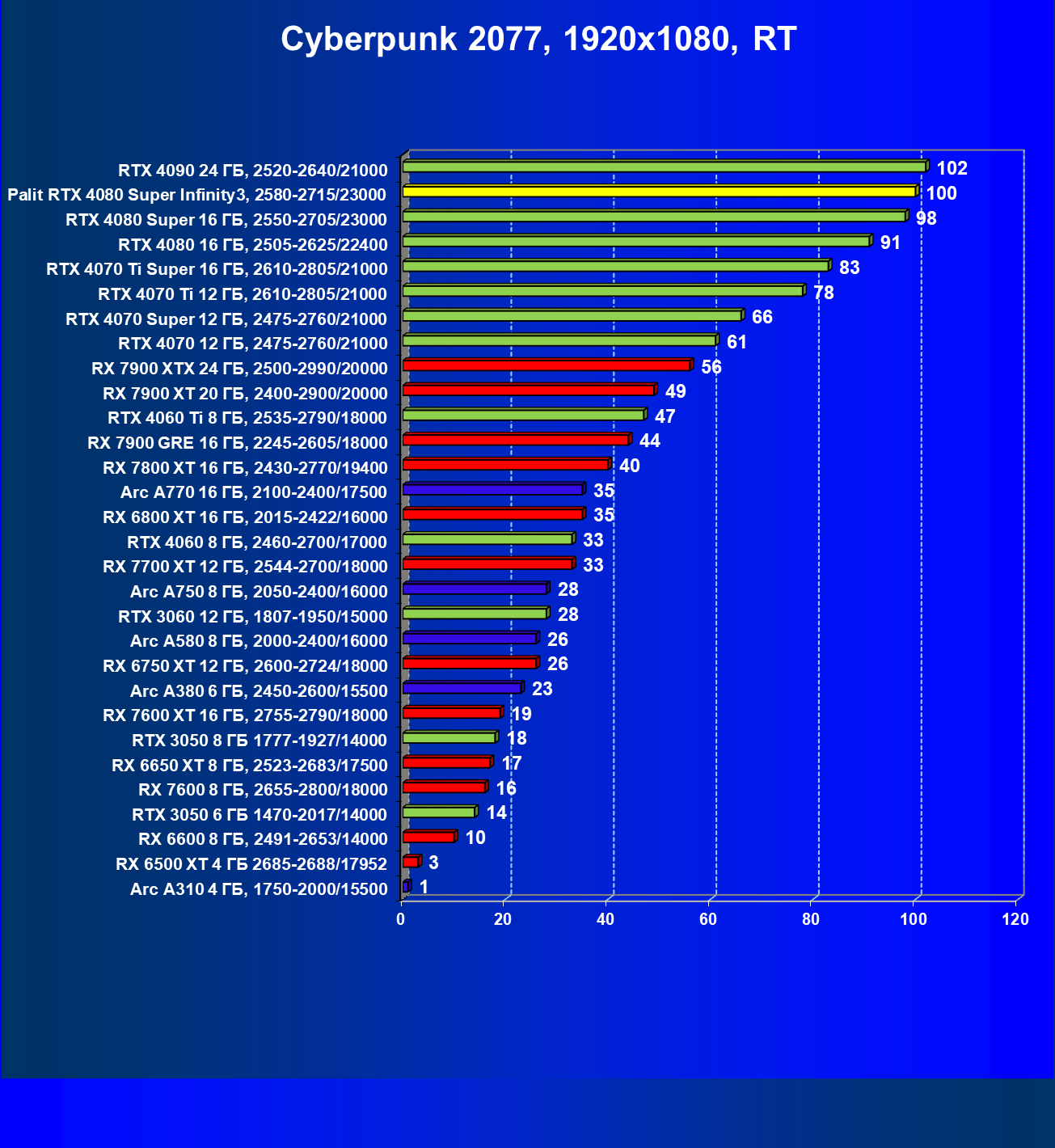 | 03 | Palit RTX 4080 Super Infinity3, 2580—2715/23000 | 628 | 7290 | 116 000 |