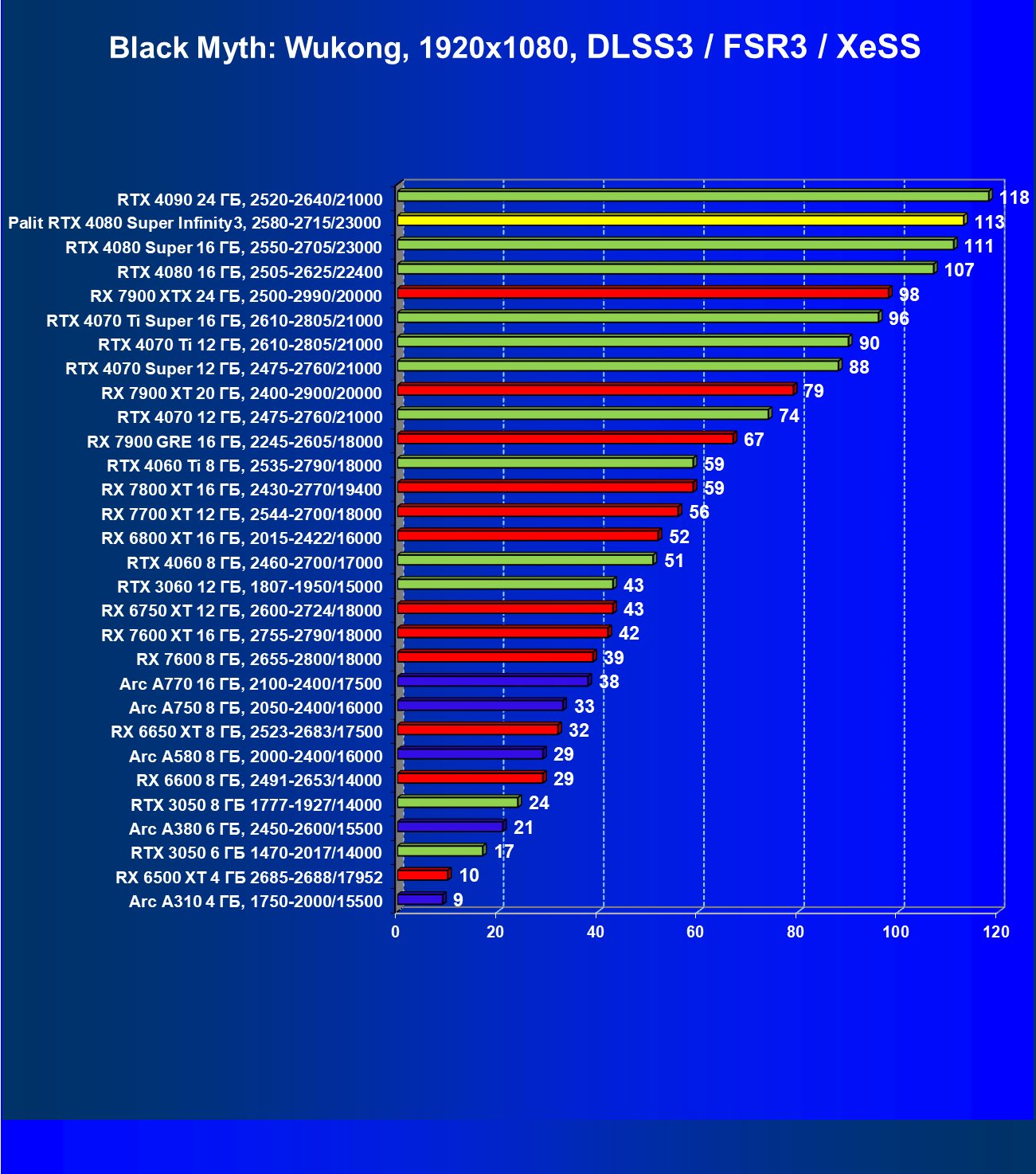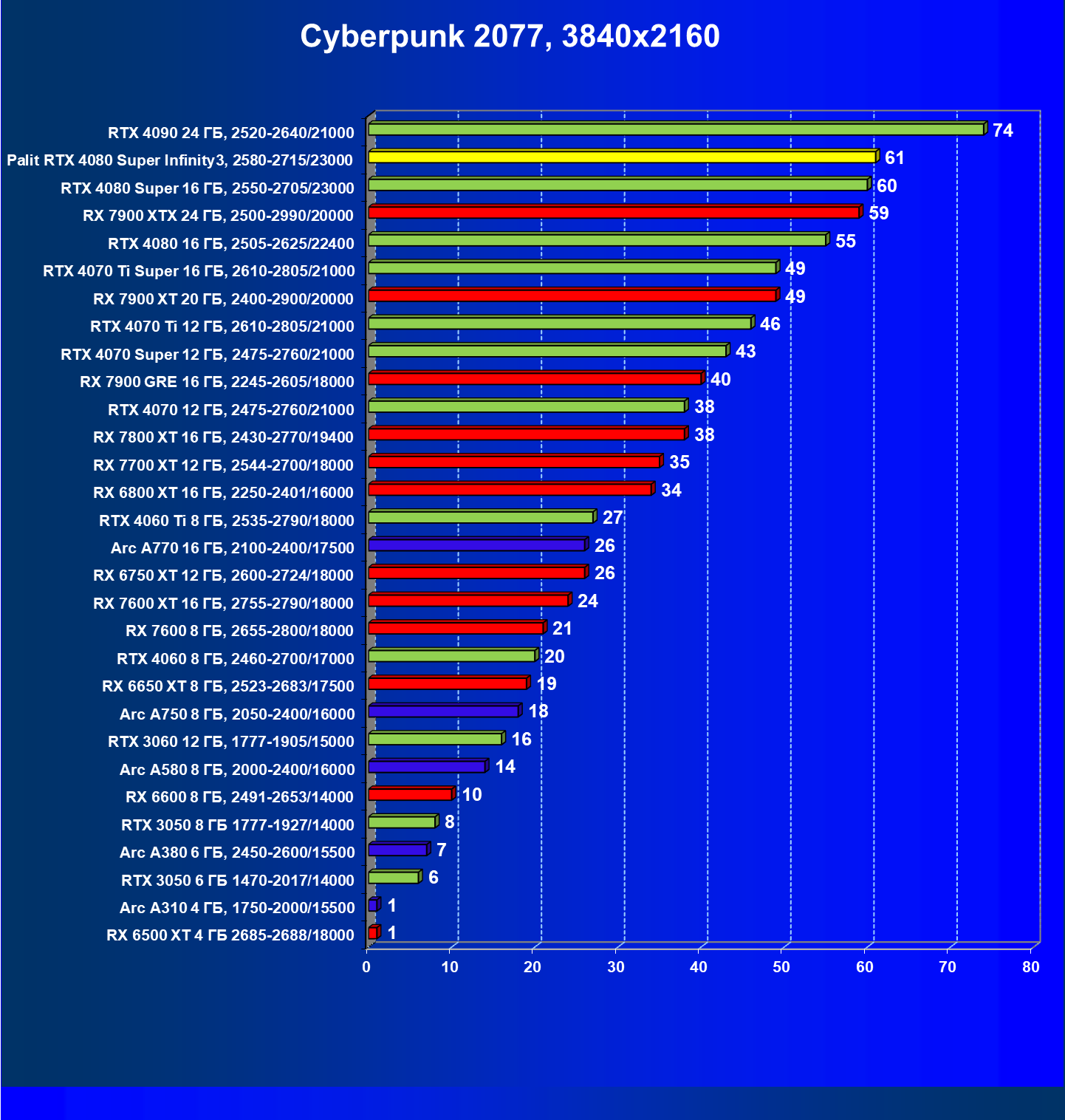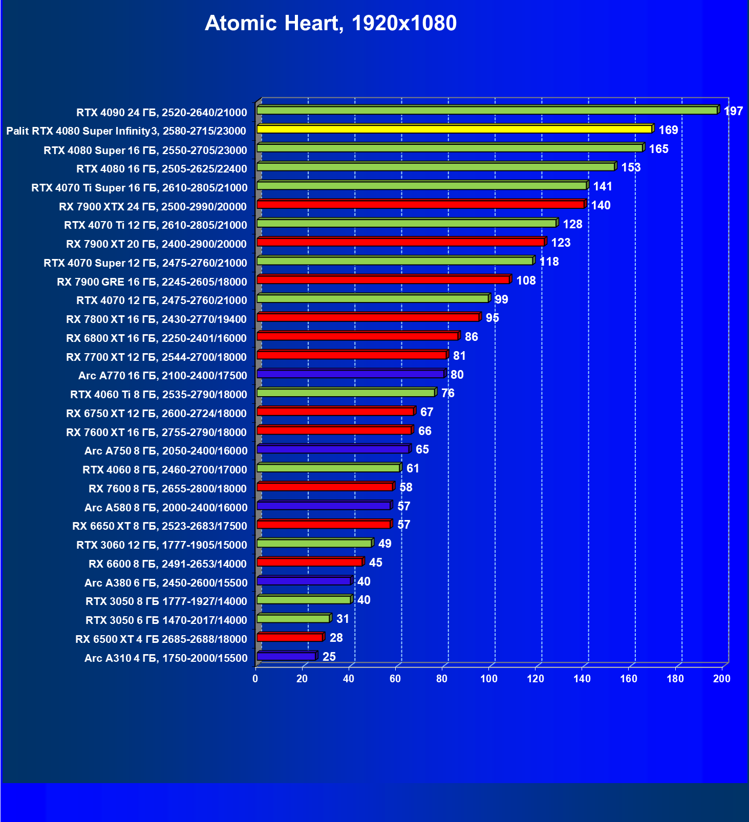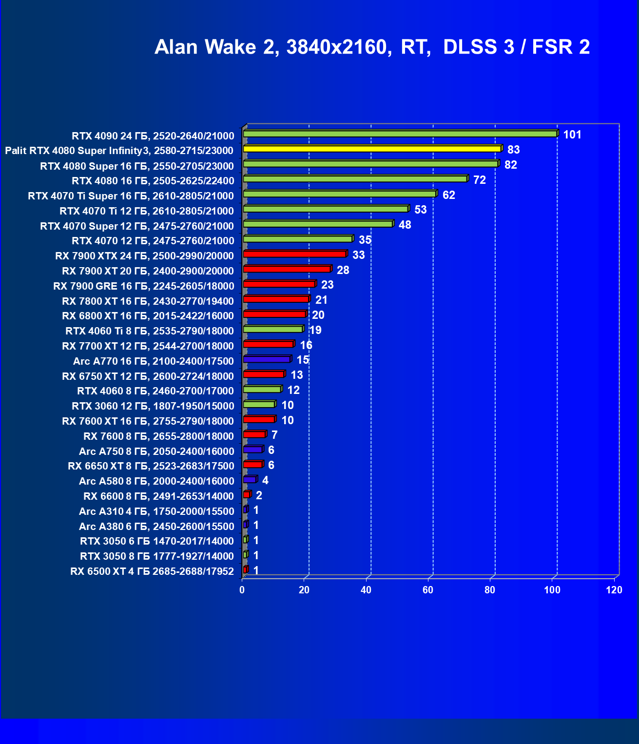 | 03 | Palit RTX 4080 Super Infinity3, 2580—2715/23000 | 628 | 7290 | 116 000 |