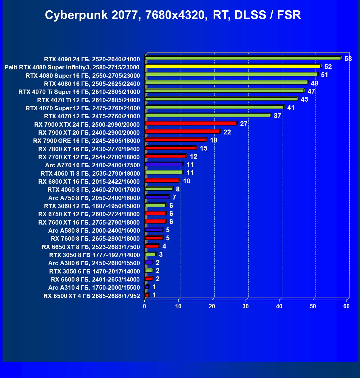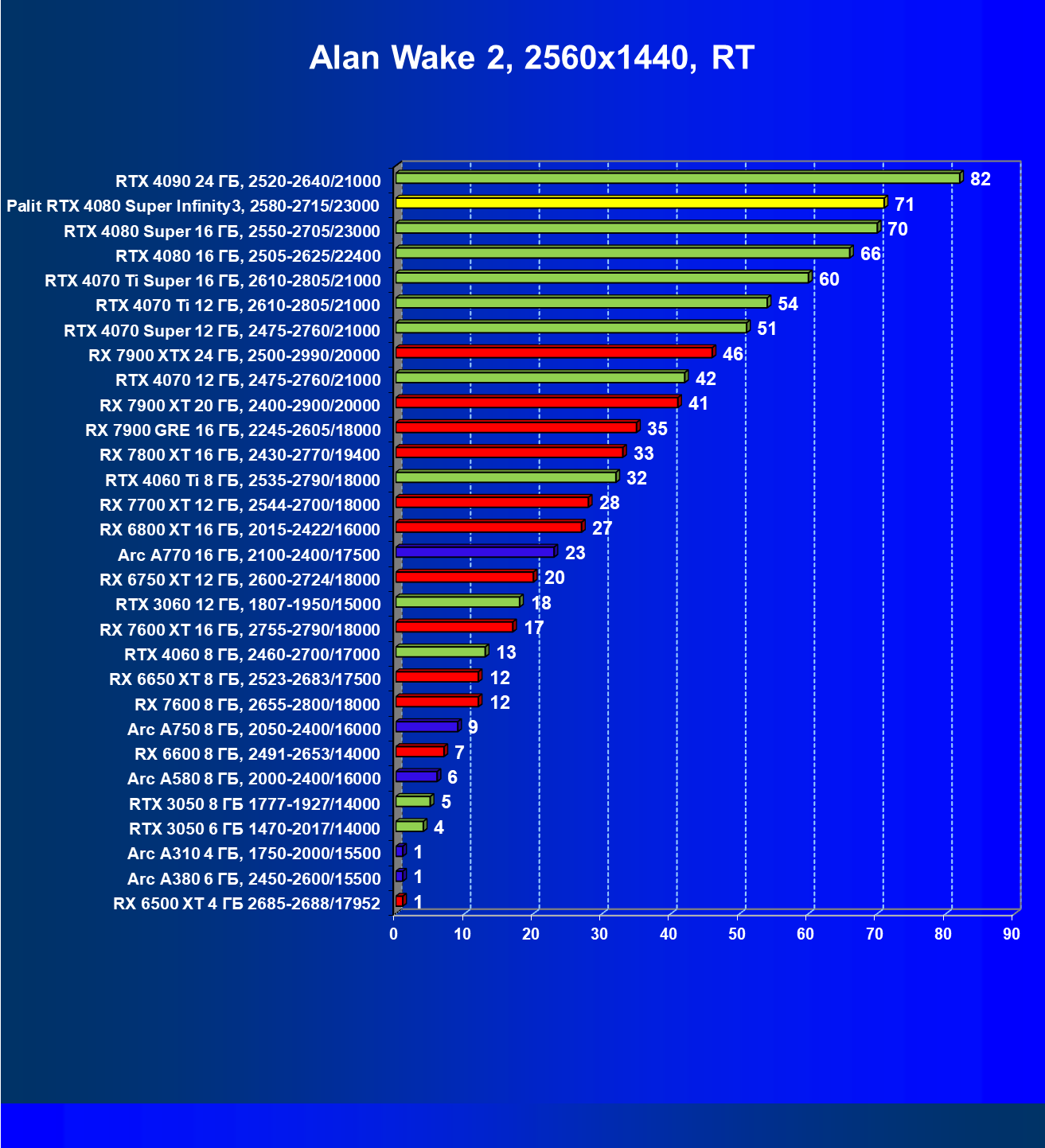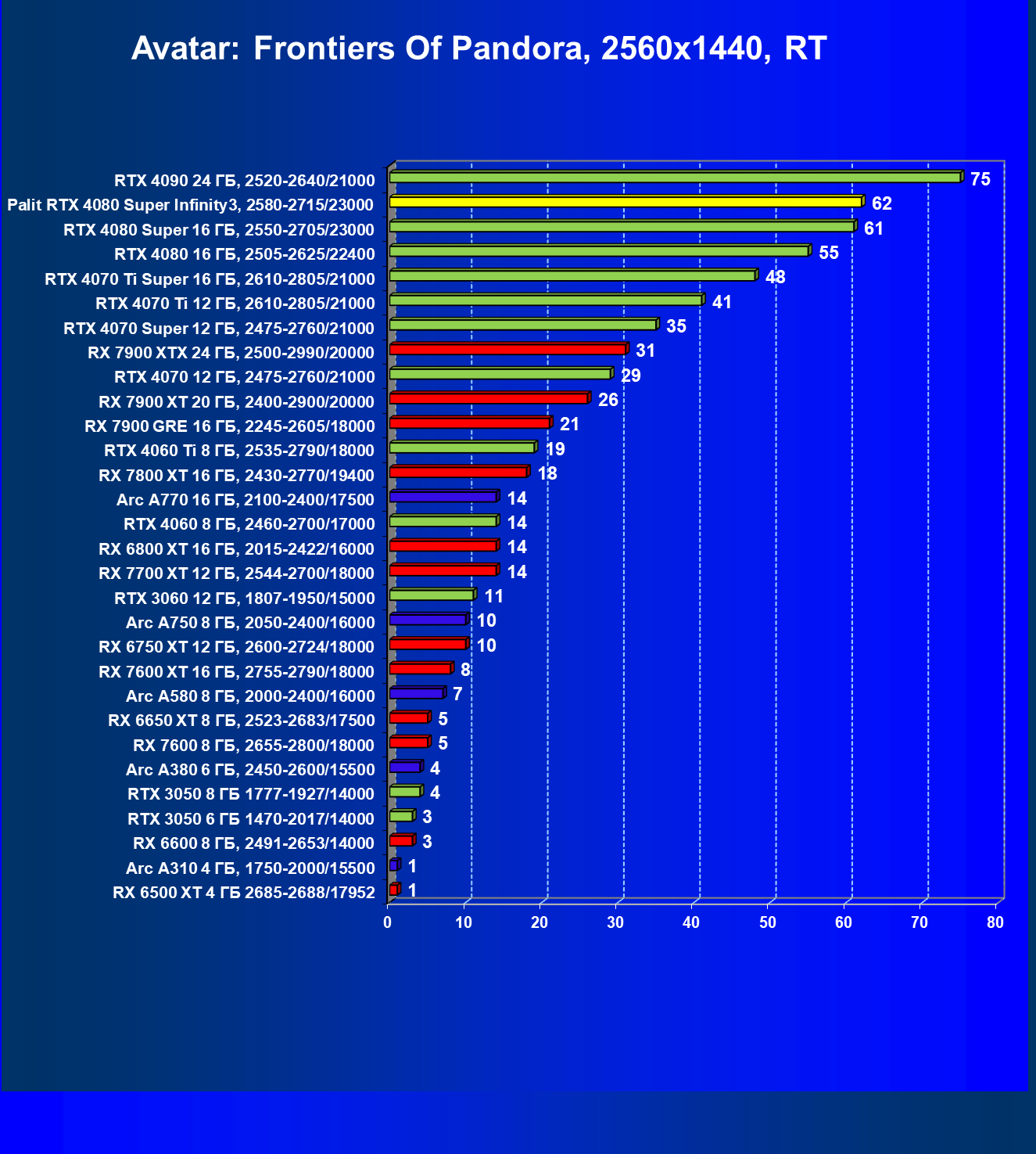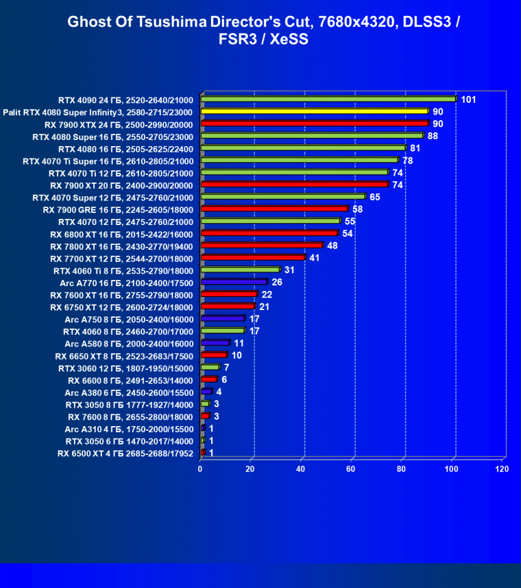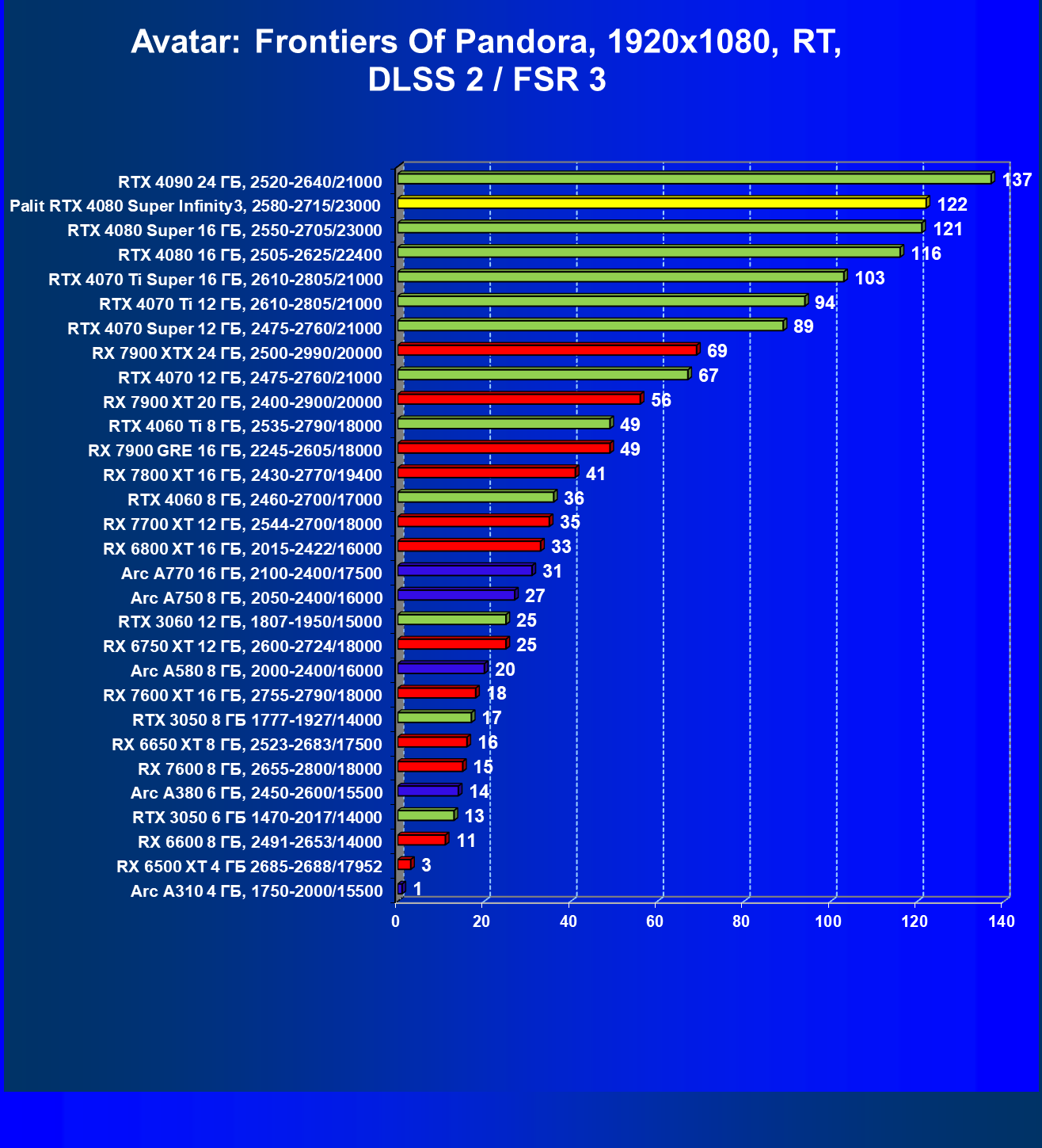 | 03 | Palit RTX 4080 Super Infinity3, 2580—2715/23000 | 628 | 7290 | 116 000 |