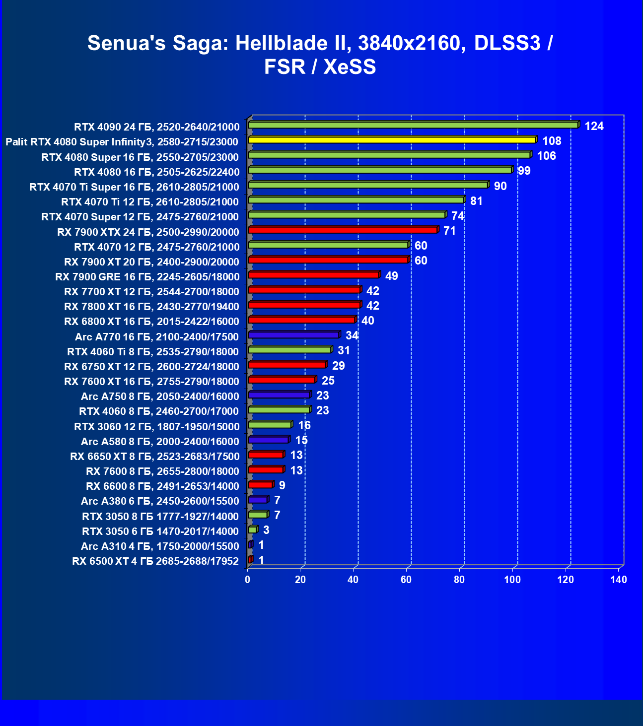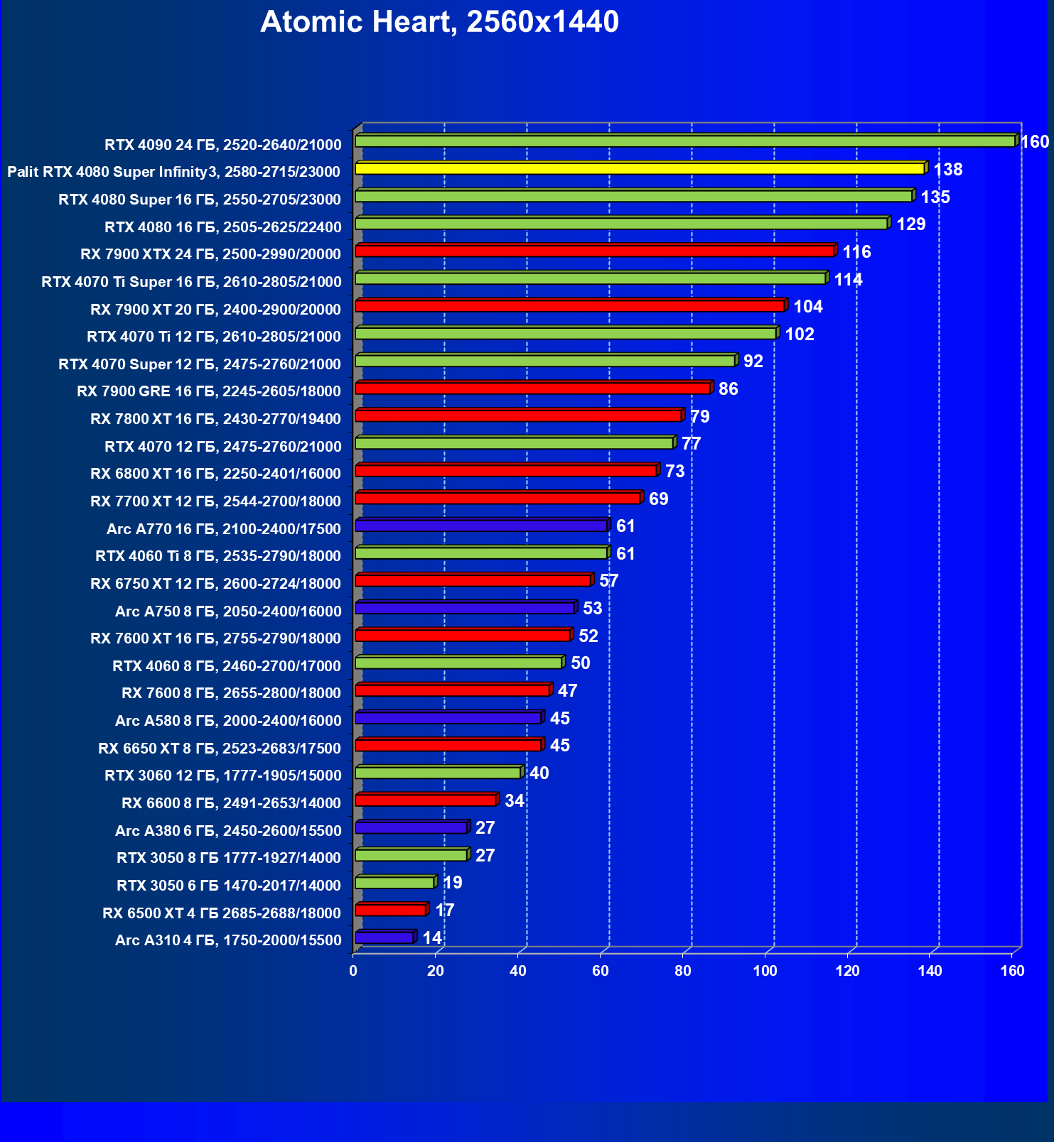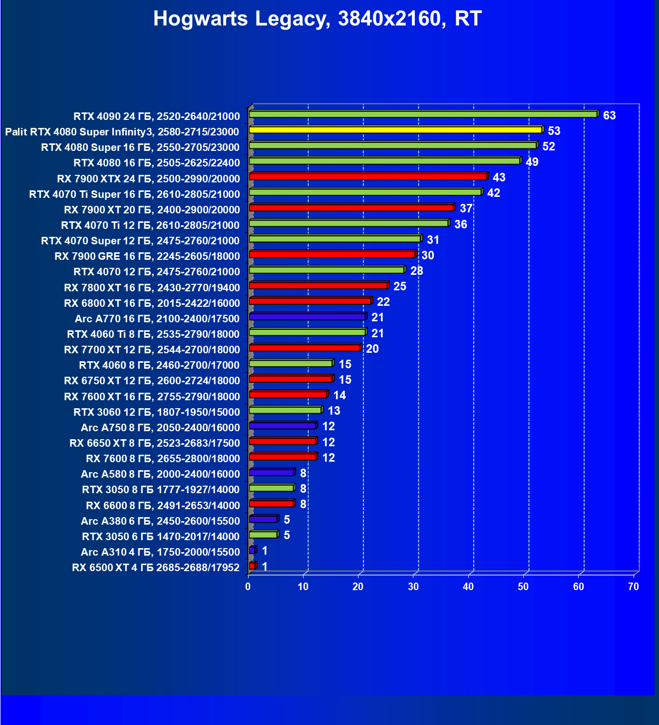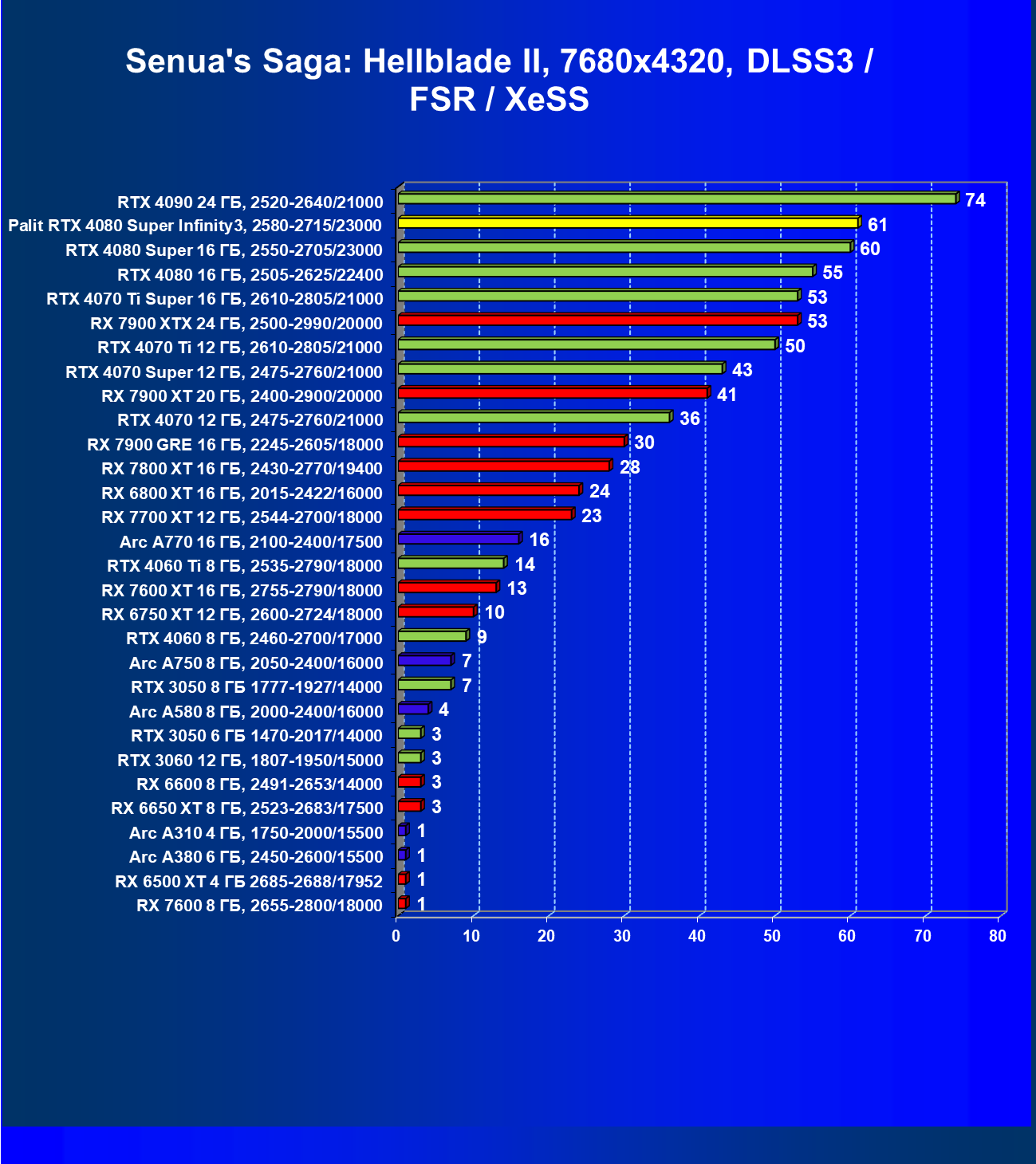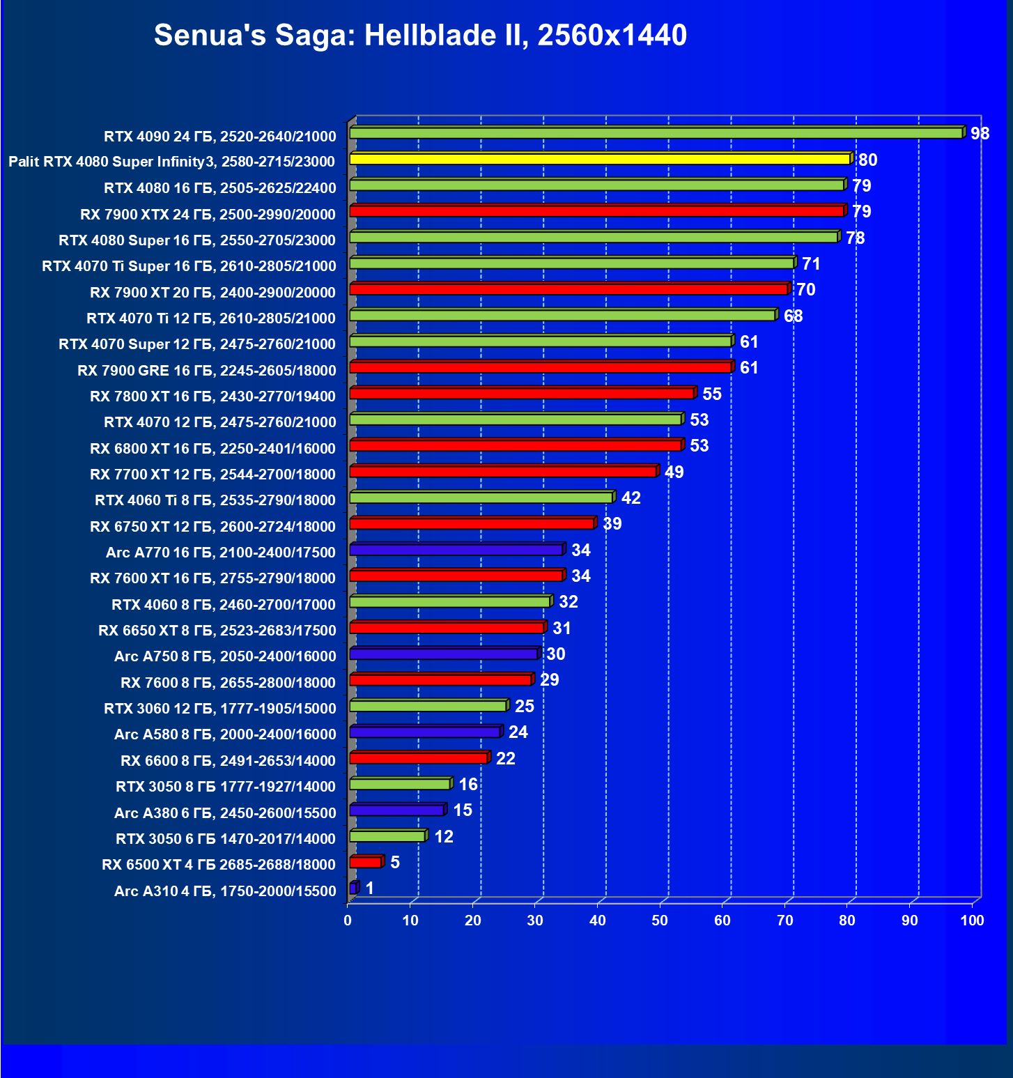 | 03 | Palit RTX 4080 Super Infinity3, 2580—2715/23000 | 628 | 7290 | 116 000 |