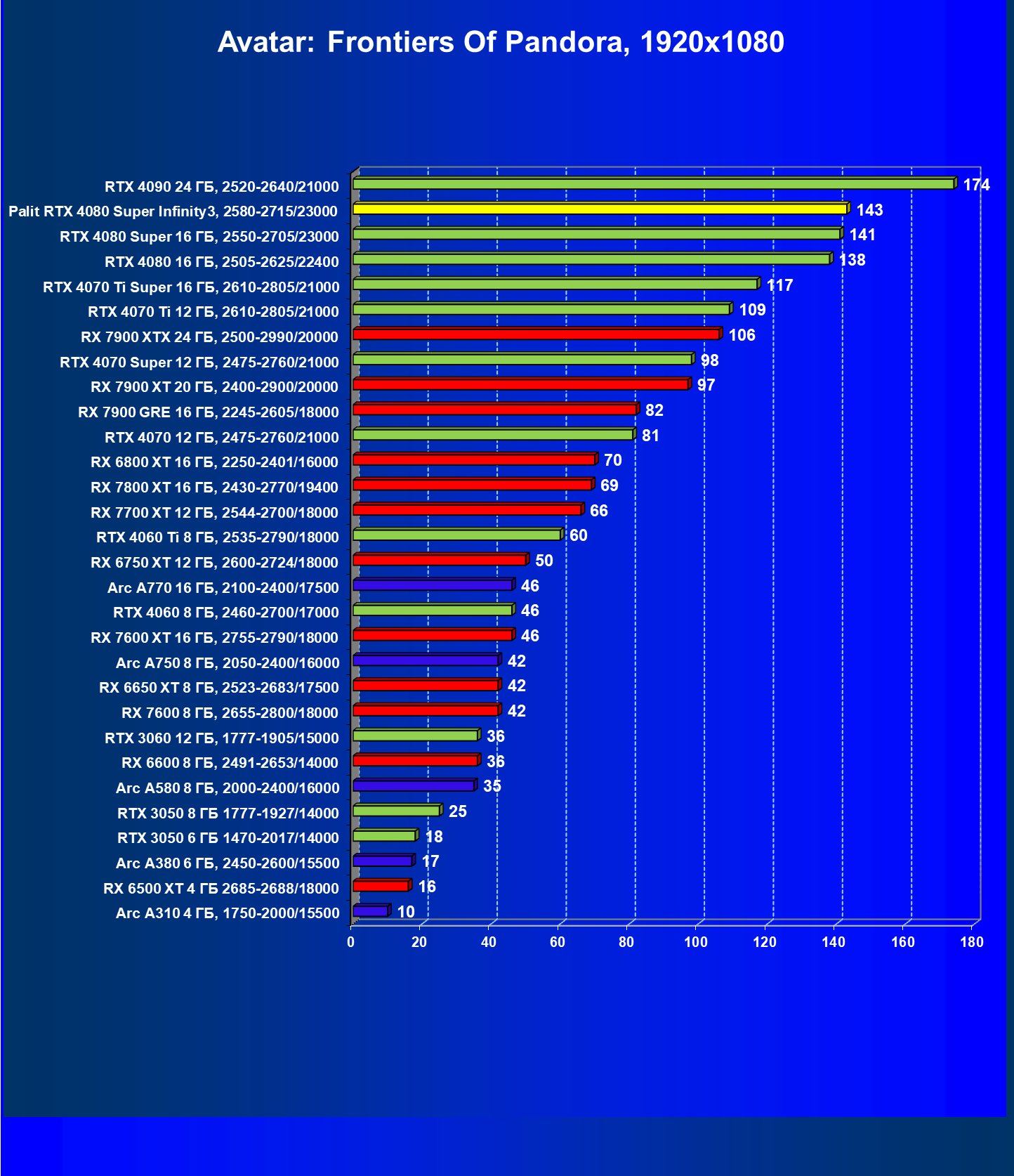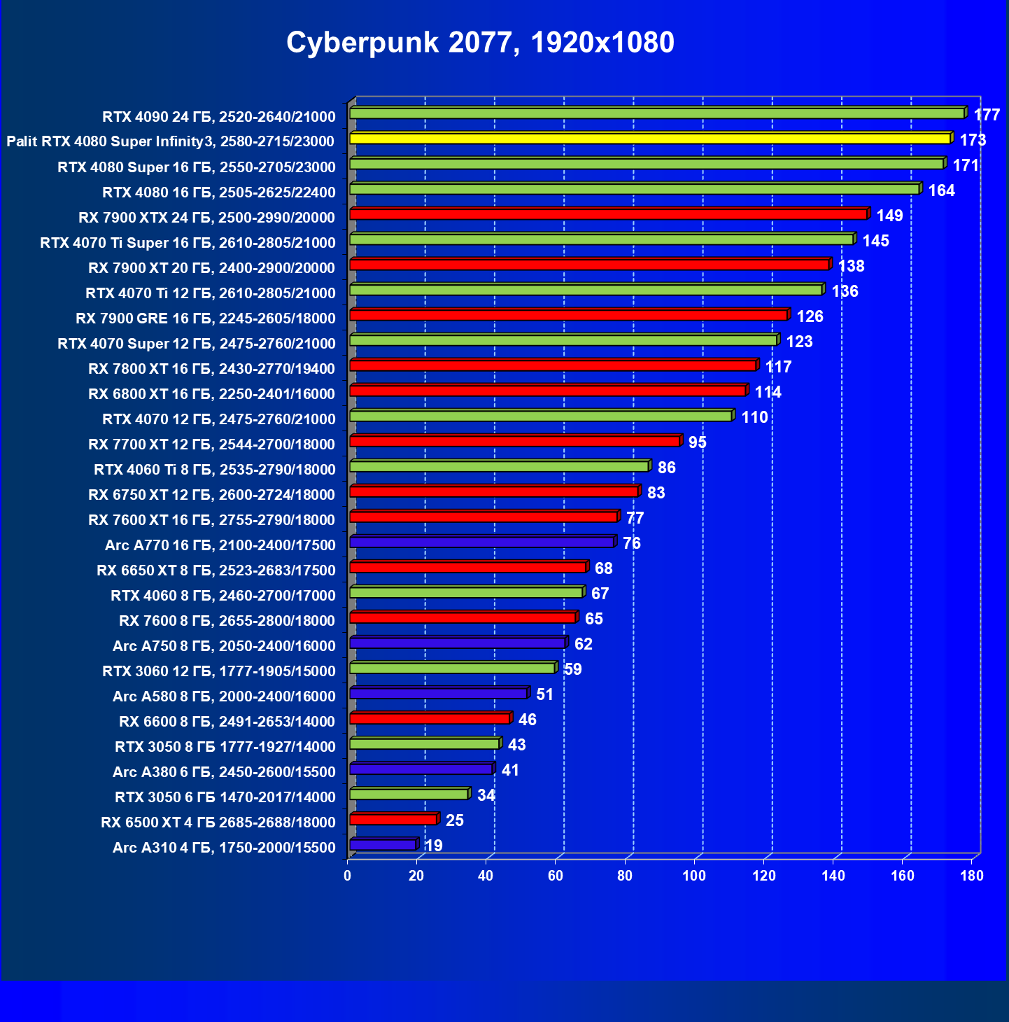 | 02 | Palit RTX 4080 Super Infinity3, 2580—2715/23000 | 4317 | 372 | 116 000 |