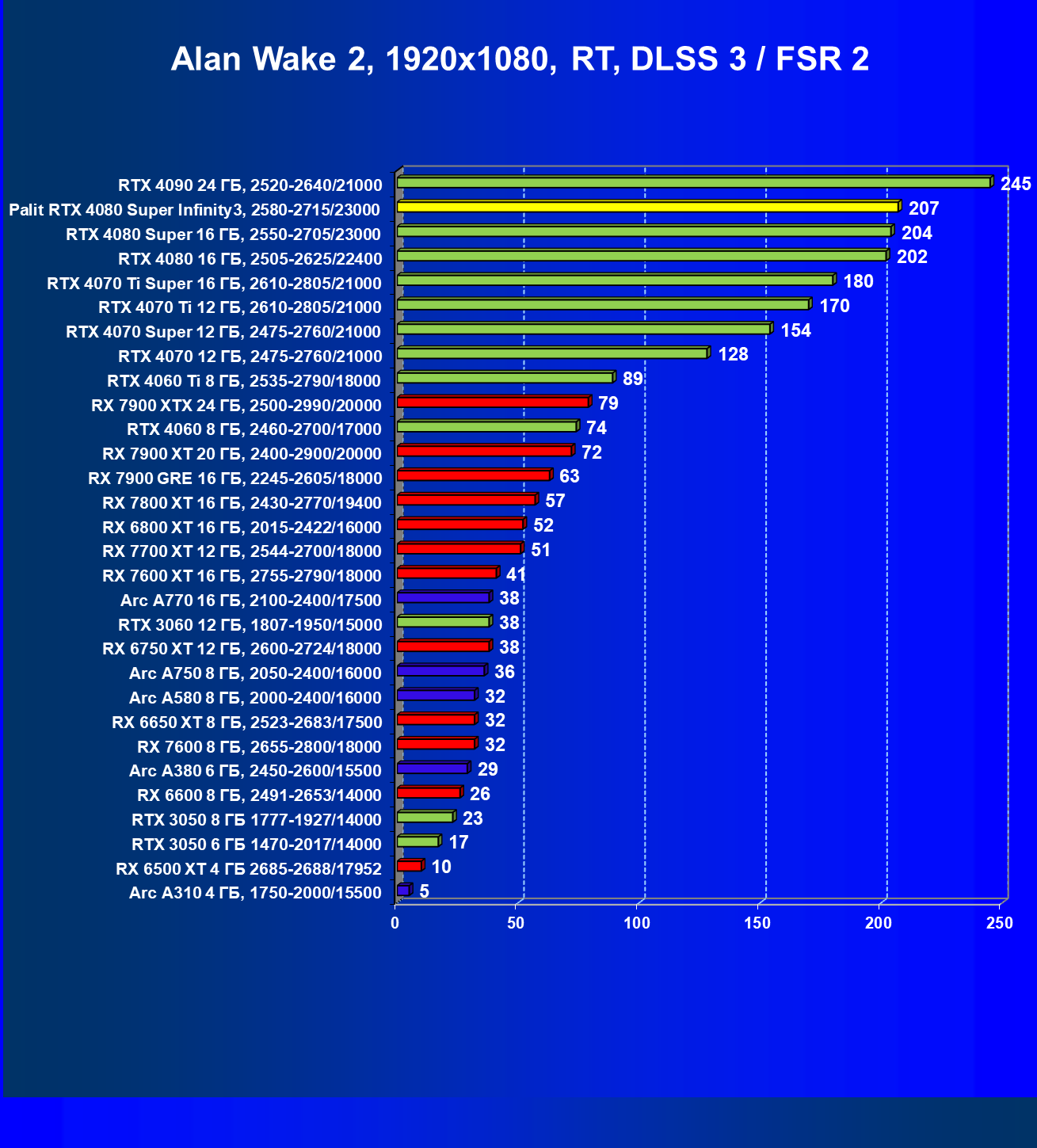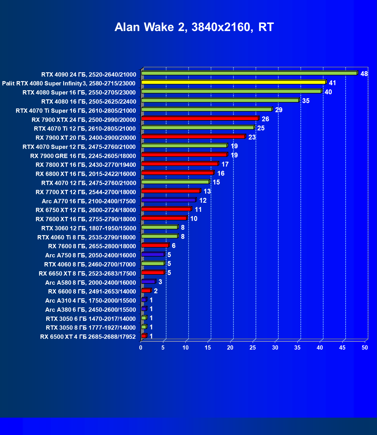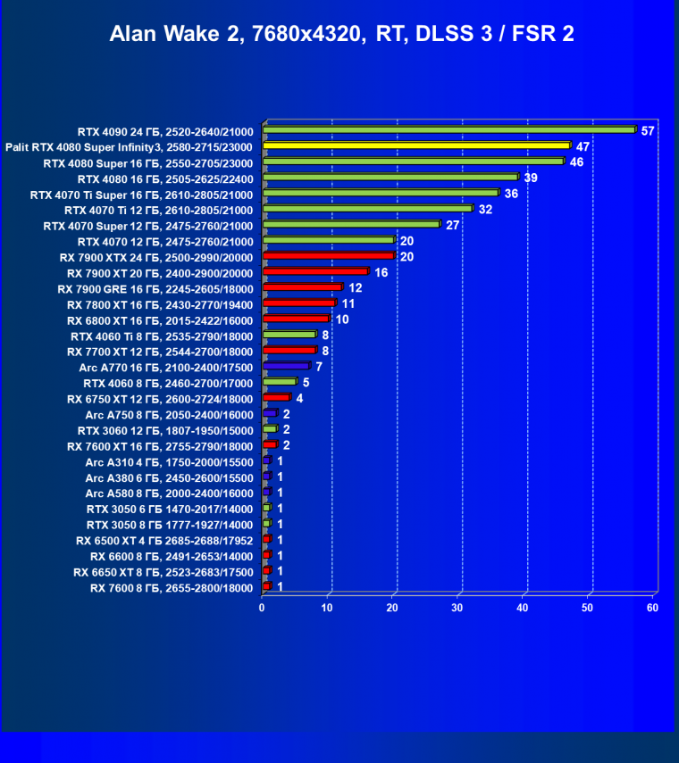 Безусловно, когда мы имеем дело с играми с RT, решения AMD сильно проседают в рейтинге: Radeon RX 7900 XTX весьма существенно уступает даже GeForce RTX 4080, не говоря уже о GeForce RTX 4080 Super.