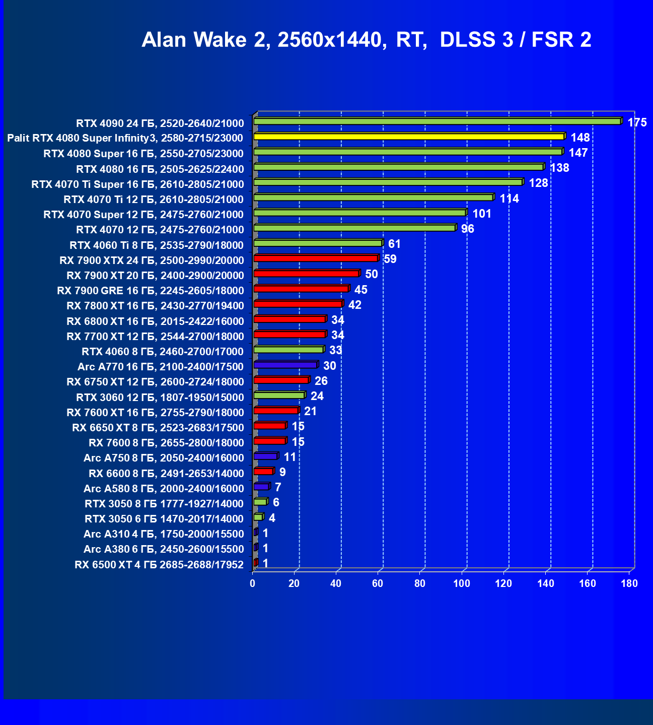 | 02 | Palit RTX 4080 Super Infinity3, 2580—2715/23000 | 7290 | 628 | 116 000 |