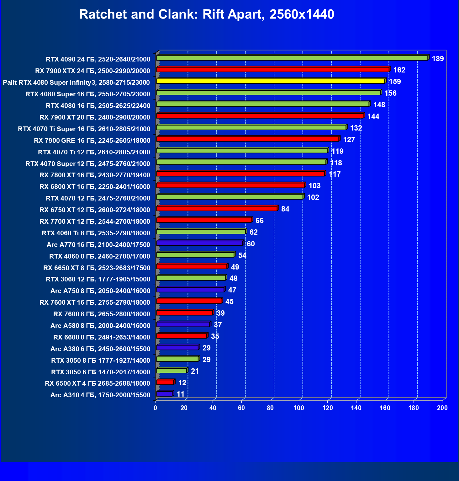 Рейтинг составлен по всем тестам без использования технологии трассировки лучей. Этот рейтинг нормирован по наиболее слабому ускорителю — Arc A310 (то есть сочетание скорости и функций Arc A310 приняты за 100%). Рейтинги ведутся по 30 регулярно исследуемым нами ускорителям в рамках проекта Лучшая видеокарта месяца. В данном случае из общего списка выбрана группа карт для анализа, в которую входят GeForce RTX 4080 Super и его конкуренты.