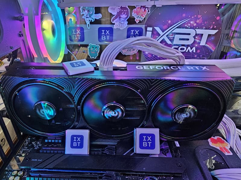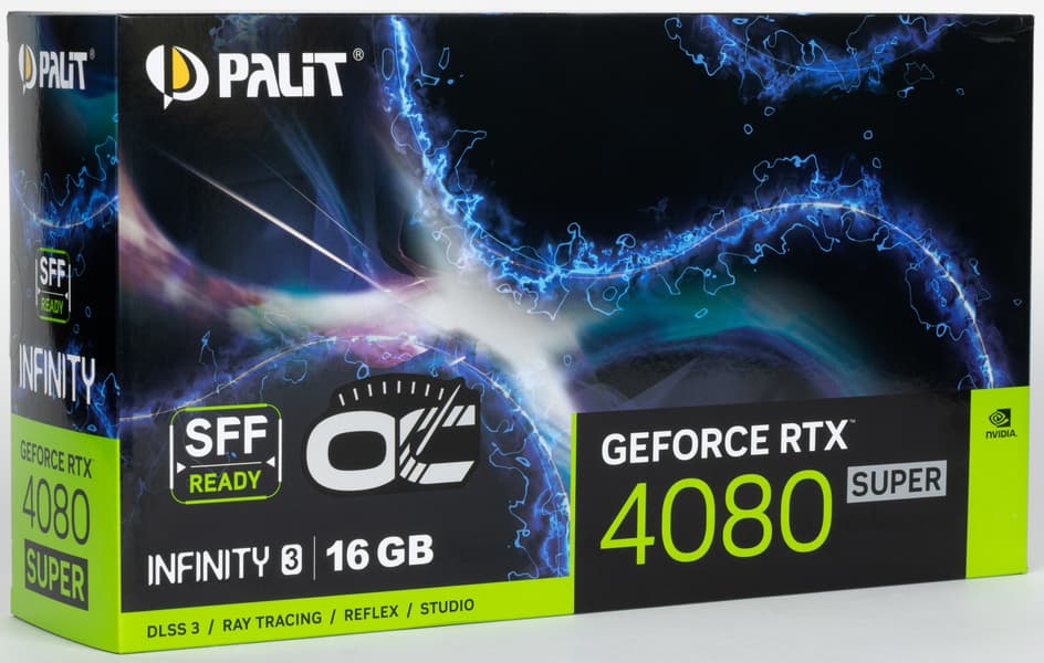 Palit GeForce RTX 4080 Super Infinity3 OC (16 ГБ) — своеобразный вариант топового ускорителя (формально это второй по производительности GPU в линейке GeForce RTX 40). Официально заявляется, что он создан для небольших ПК (SFF). И это действительно интересное направление, ведь совсем недавно такие карты имели огромные размеры и могли уместиться только в очень просторных системных блоках. Однако назвать протестированную модель по-настоящему компактной, конечно, невозможно, она лишь чуть менее громоздкая, чем типовые решения на том же GeForce RTX 4080 Super, и всё равно займет три слота в системном блоке. Так что выигрыш по толщине в 10-15 мм она обеспечивает, но в какой компактной системе вы сможете этим воспользоваться — большой вопрос. По сути, это просто GeForce RTX 4080 Super с более компактным кулером. Что ж, как минимум производителю такая карта обходится дешевле :)