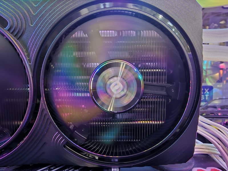Поверх радиатора установлен кожух с тремя вентиляторами ∅90 мм, имеющими по 9 лопастей и работающими на единой частоте вращения (по умолчанию, но через программу ThunderMaster можно настроить их работу раздельно для двух групп: для центрального и для двух крайних вентиляторов).