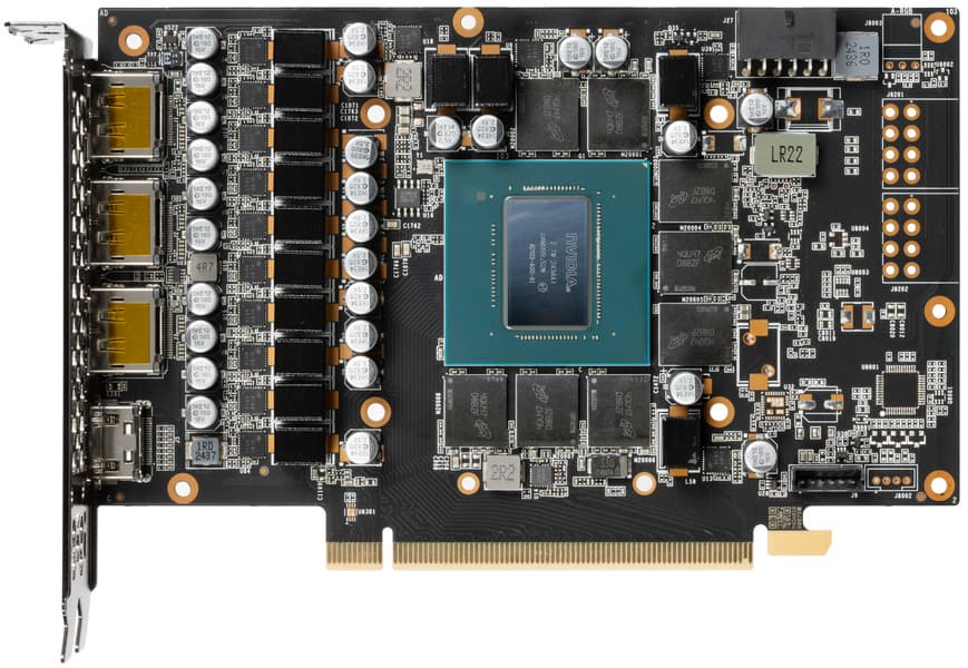 Также отметим поддержку стандарта HDMI 2.1, позволяющего выводить 4K-изображение со 120 FPS или 8K-разрешение при помощи одного кабеля, поддержку аппаратного декодирования видеоданных в формате AV1, технологию RTX IO, способную обеспечить быструю передачу и распаковку данных с накопителей прямо в GPU, а также технологию снижения задержек Reflex, полезную для киберспортсменов.