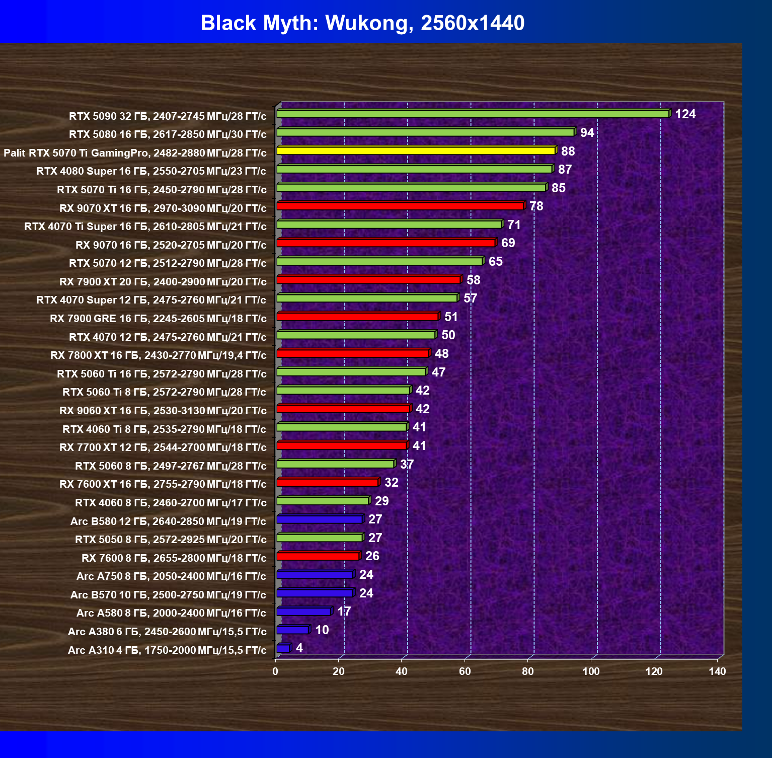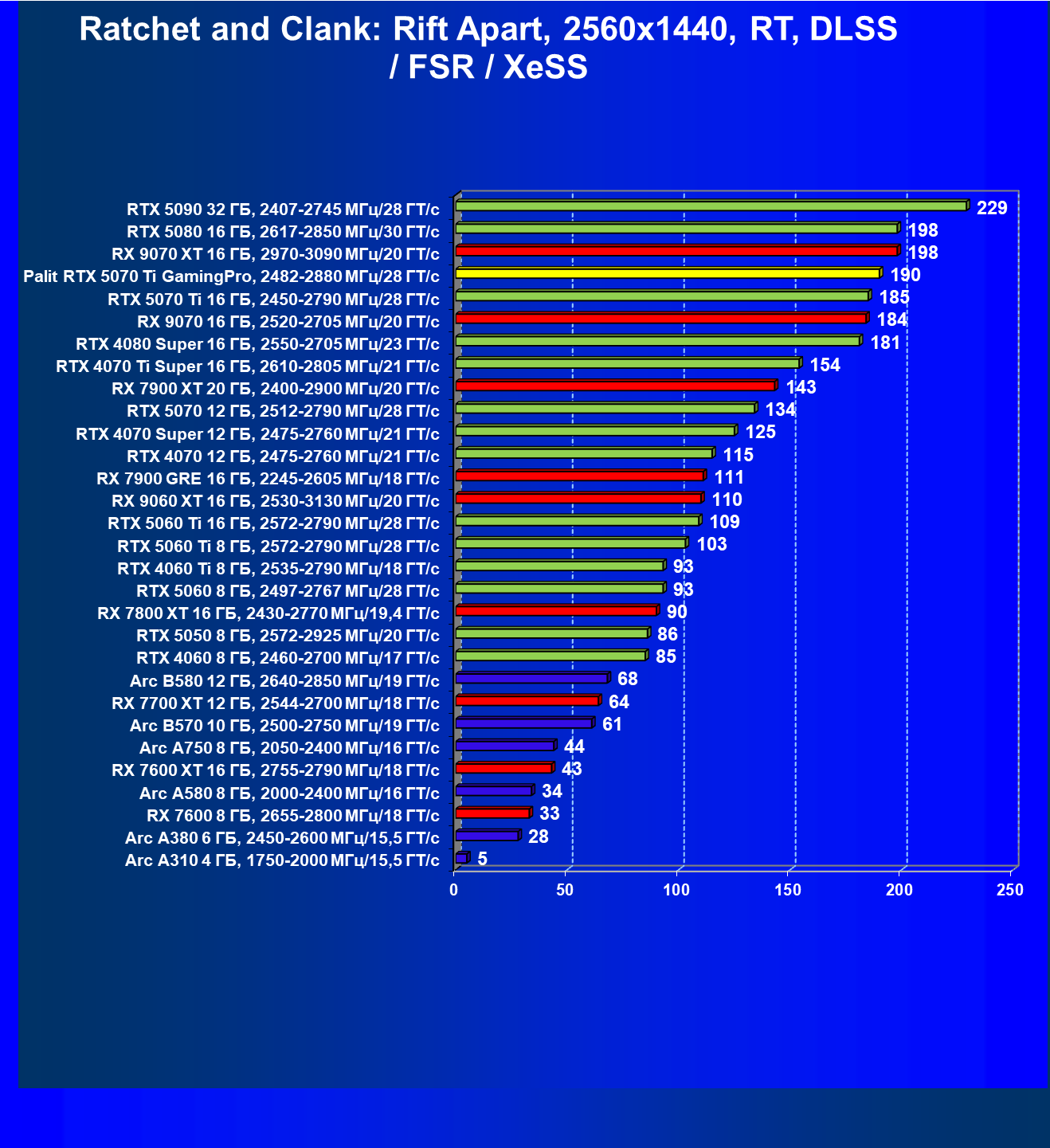 | 01 | Palit RTX 5070 Ti GamingPro, 2482—2880 МГц/28 ГТ/с | 1391 | 11960 | 86 000 |