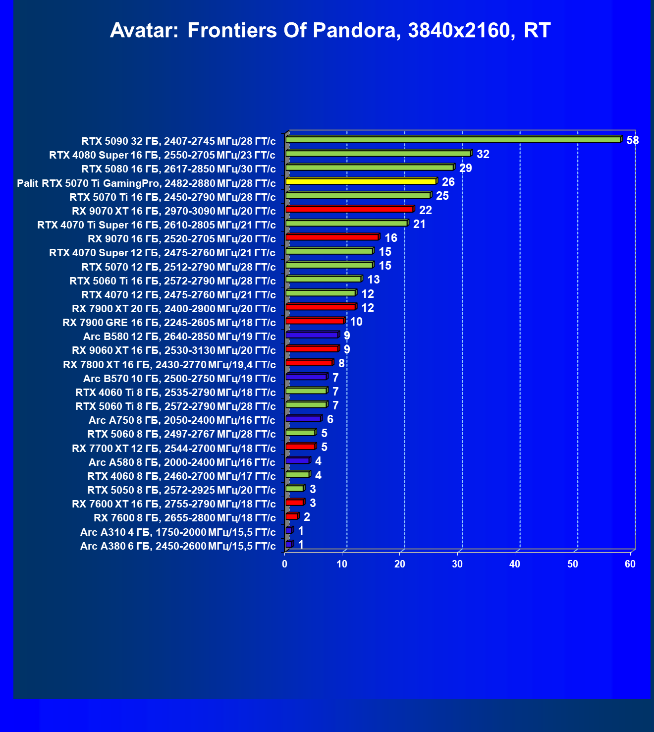 В таких играх GeForce RTX 5070 Ti занимает 6-е место в списке протестированных нами карт (после GeForce RTX 5090, 5080 и 4090, а также Radeon RX 9070 XT) и находится примерно на уровне GeForce RTX 4080 Super, опережая всех остальных соперников из стана AMD. При этом мы уже не раз говорили, что подобные решения очень высокого уровня порой не могут раскрыть свой потенциал в классических играх даже в разрешении 4K — общая игровая производительность ограничивается системными ресурсами, в основном производительностью CPU. Поэтому вывод прост: можно играть на самых высоких настройках графики в любом разрешении, включая 4K (2160p), а в некоторых играх — даже в 8K.