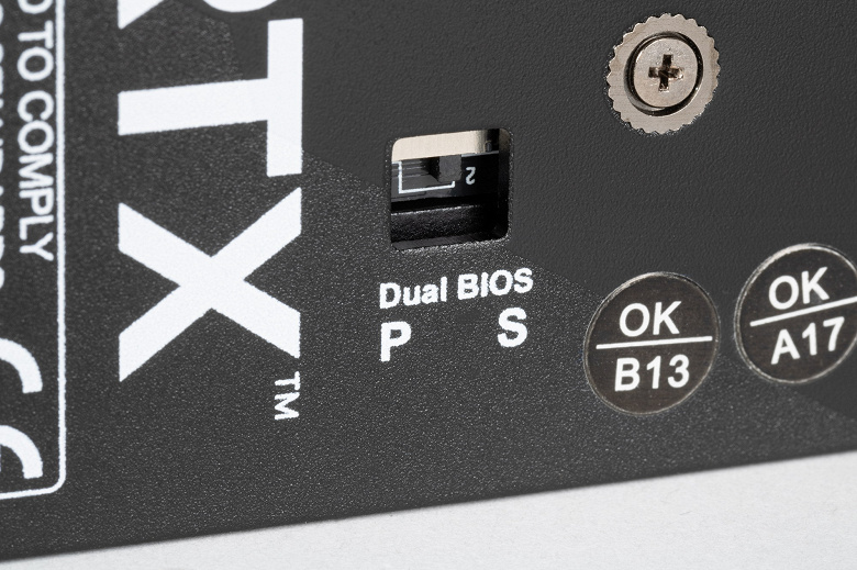 Карта имеет два режима работы, они заложены в двух вариантах BIOS, которые переключаются с помощью переключателя на переднем торце карты: P (performance / производительный, он же 1) и S (silent / тихий, он же 2). Разница между режимами заключается, по сути, только в оборотах вентиляторов, предел энергопотребления в обоих случаях составляет 300 Вт.