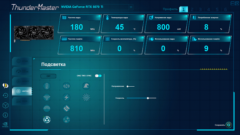 Управление режимами подсветки, в том числе и ее отключением, осуществляется той же утилитой ThunderMaster. Имеется возможность сохранения выбранного режима в самой карте, то есть при желании можно настроить подсветку один раз и больше не запускать программу.