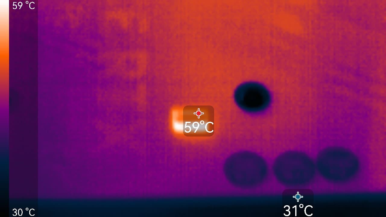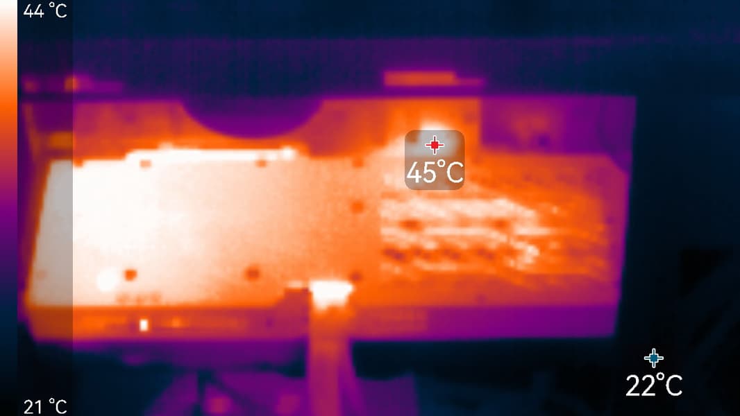 Максимальный нагрев наблюдался в нижней части PCB около разъема PCIe, а также около разъема питания карты.
