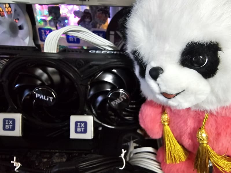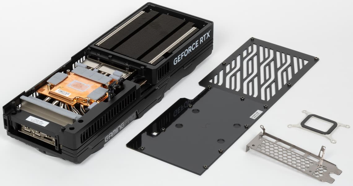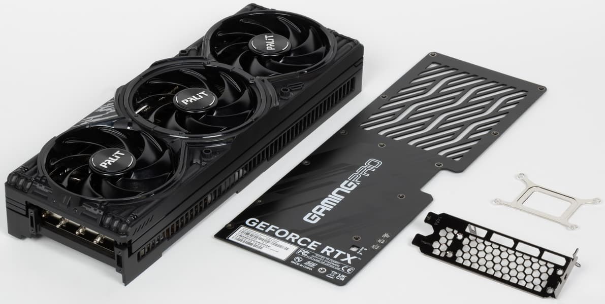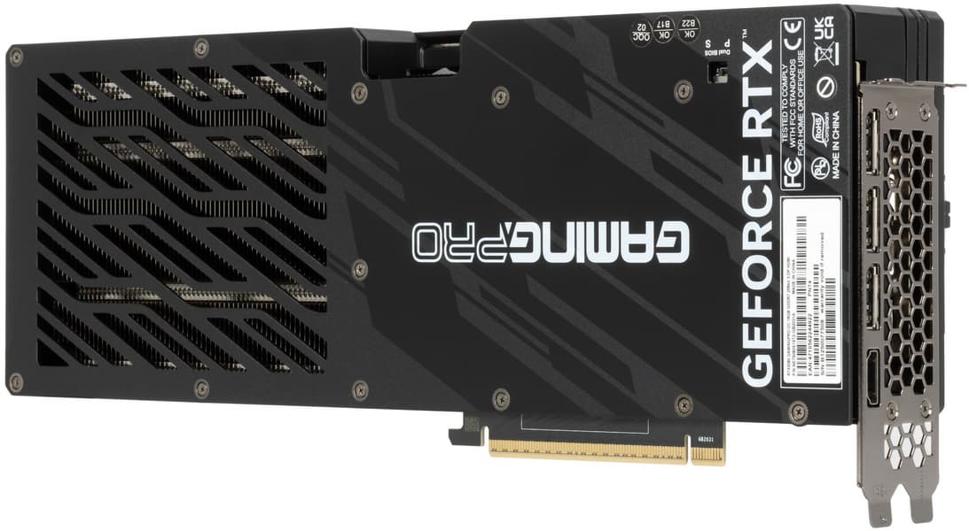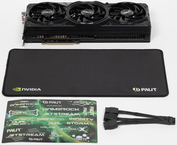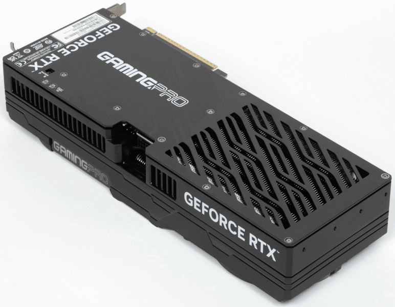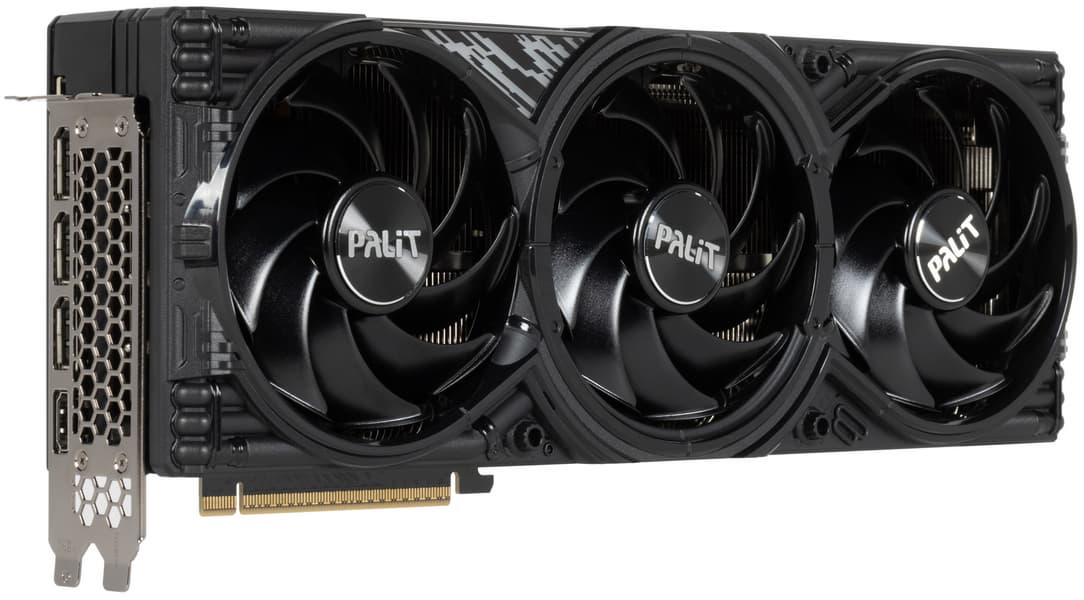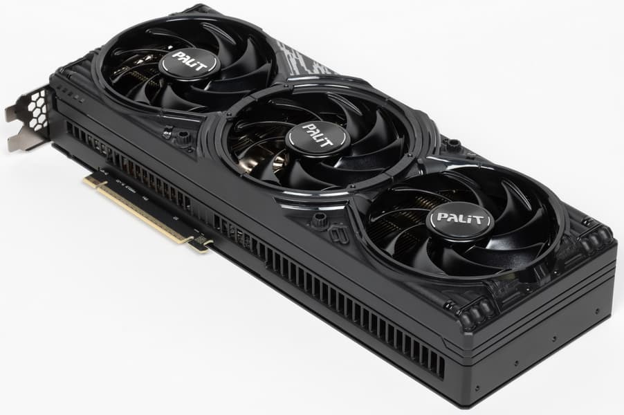 Карта Palit способна потреблять до 361 Вт. Система охлаждения весьма мощная и не слишком шумная (но есть звенящий призвук при работе вентиляторов — возможно, это проблема конкретного экземпляра). Из-за возможности поднять лимит потребления ручной разгон может обеспечить прирост скорости до 5,5% (в разрешении 4K), однако карта и по умолчанию имеет фабрично повышенные частоты работы, демонстрируя на 2,5%-3% более высокую производительность, чем референсная. Габариты этой модели составляют 33 см в длину и 13 см в высоту, а по толщине видеокарта занимает 3 слота в корпусе. Набор видеовыходов стандартный: 3 DP 2.1b и 1 HDMI 2.1b. Карта обладает скромной подсветкой, способной синхронизироваться с материнской платой (при самостоятельном приобретении кабеля для подключения).