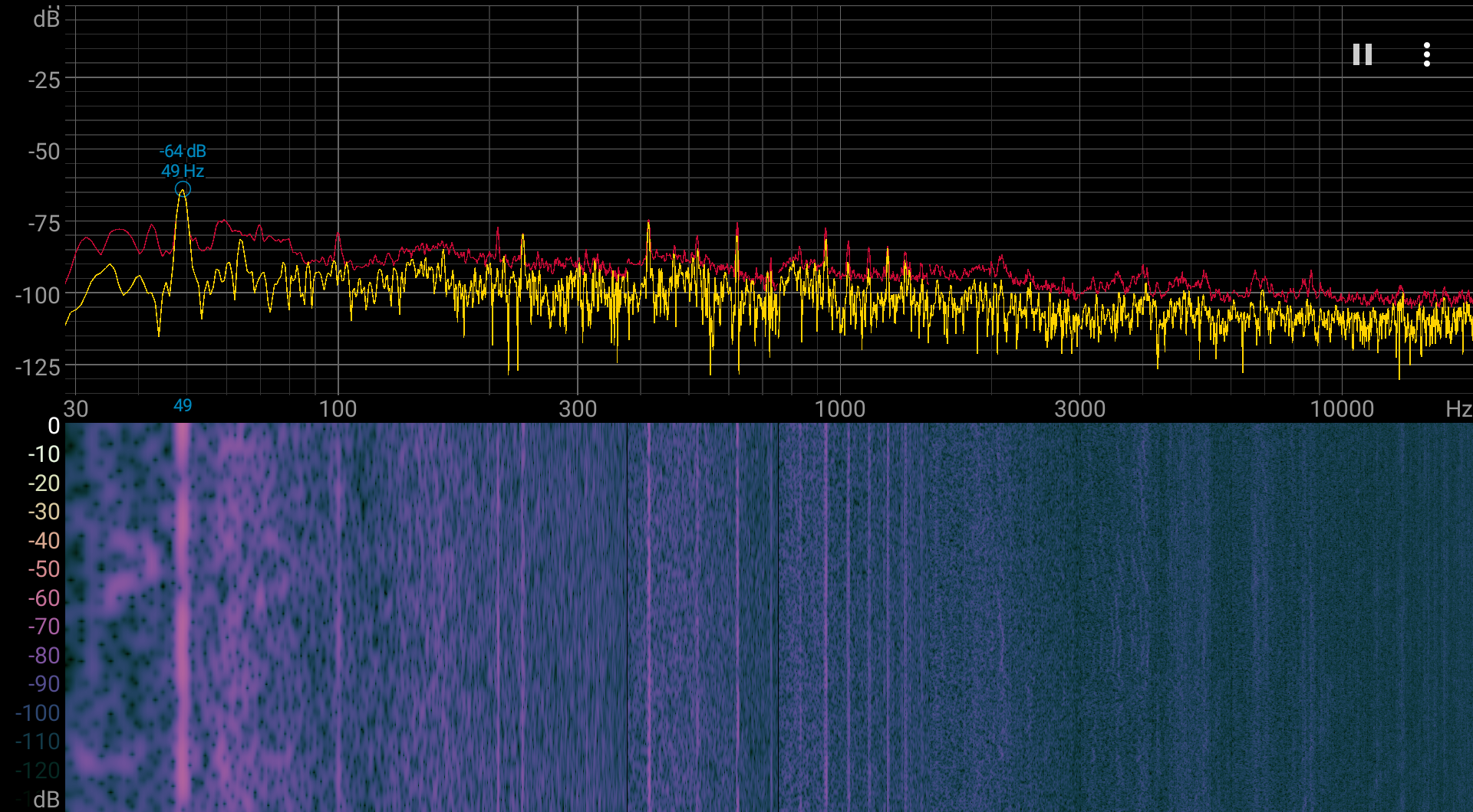 Аудиозапись шума — здесь. К сожалению, в шуме прослеживается небольшой дребезжащий призвук, который слышно в аудиозаписи и видно на спектрограмме:
