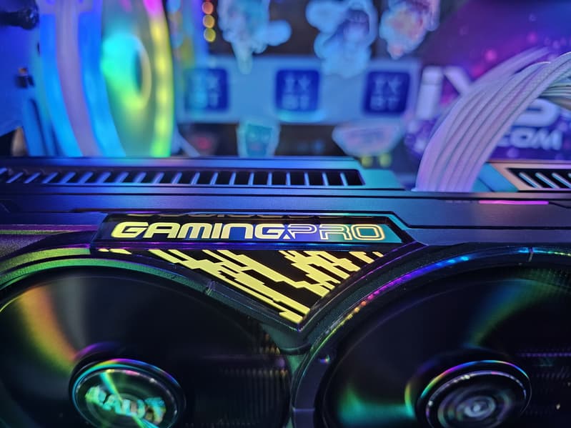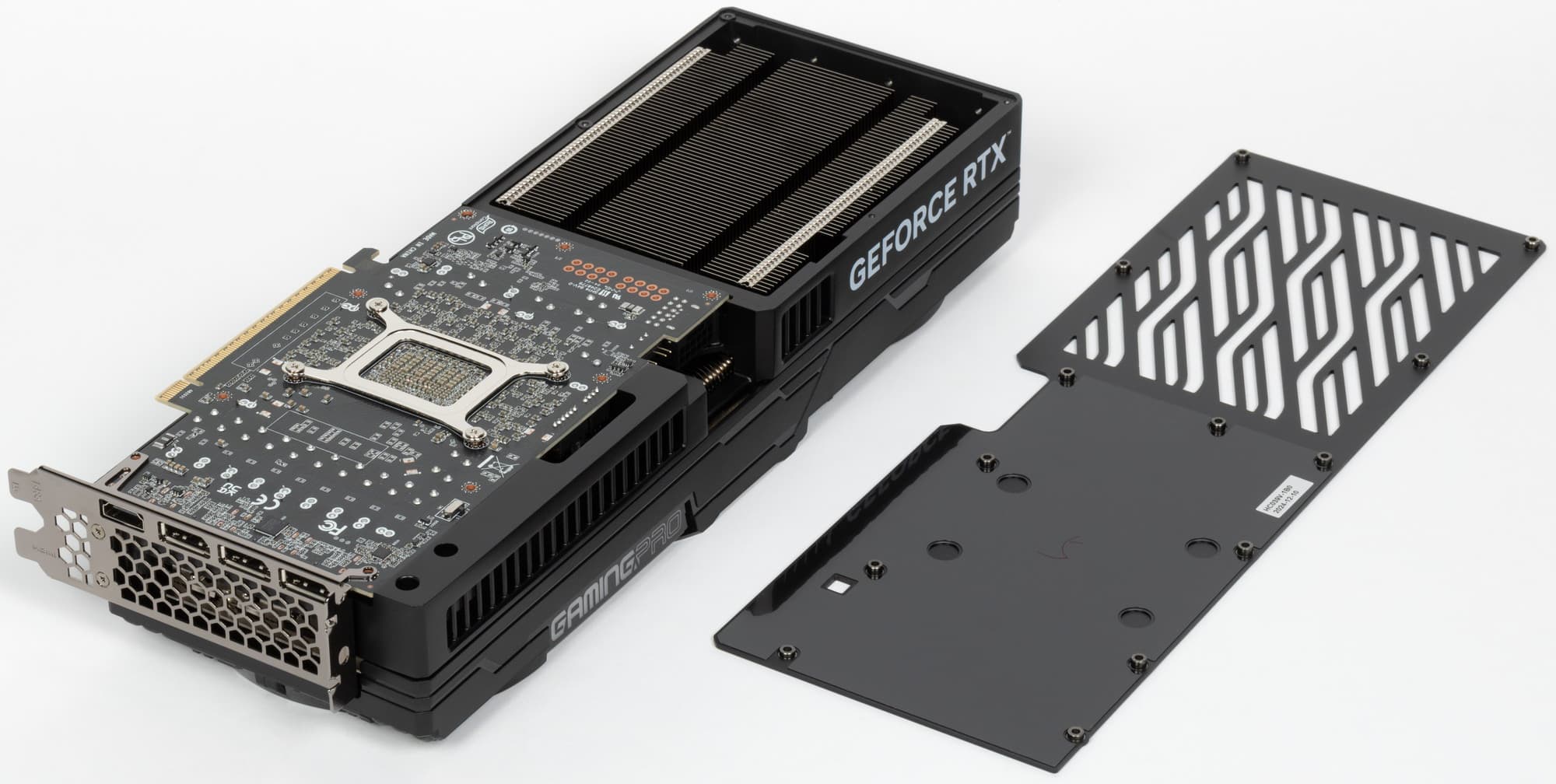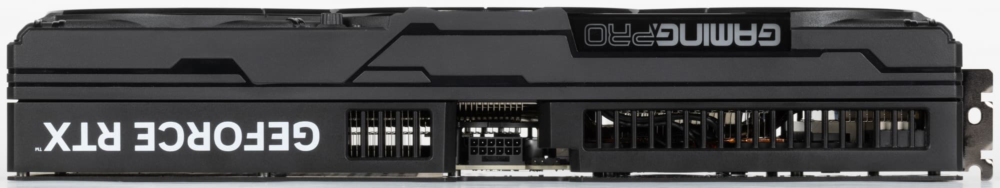 Карта имеет очень скромную подсветку: угол между вентиляторами и логотип серии на верхнем торце. По сравнению с предыдущими моделями серии GamingPro это явная деградация: ранее были 2 широкие диагональные полосы. Мы помним, что у Palit имеется еще серия JetStream, особенностью которой является полное отсутствие подсветки у совершенно черной карты. Зачем же GamingPro двигать туда же?