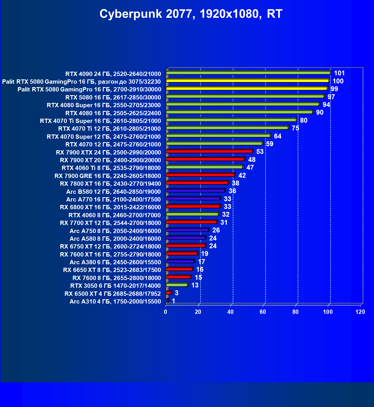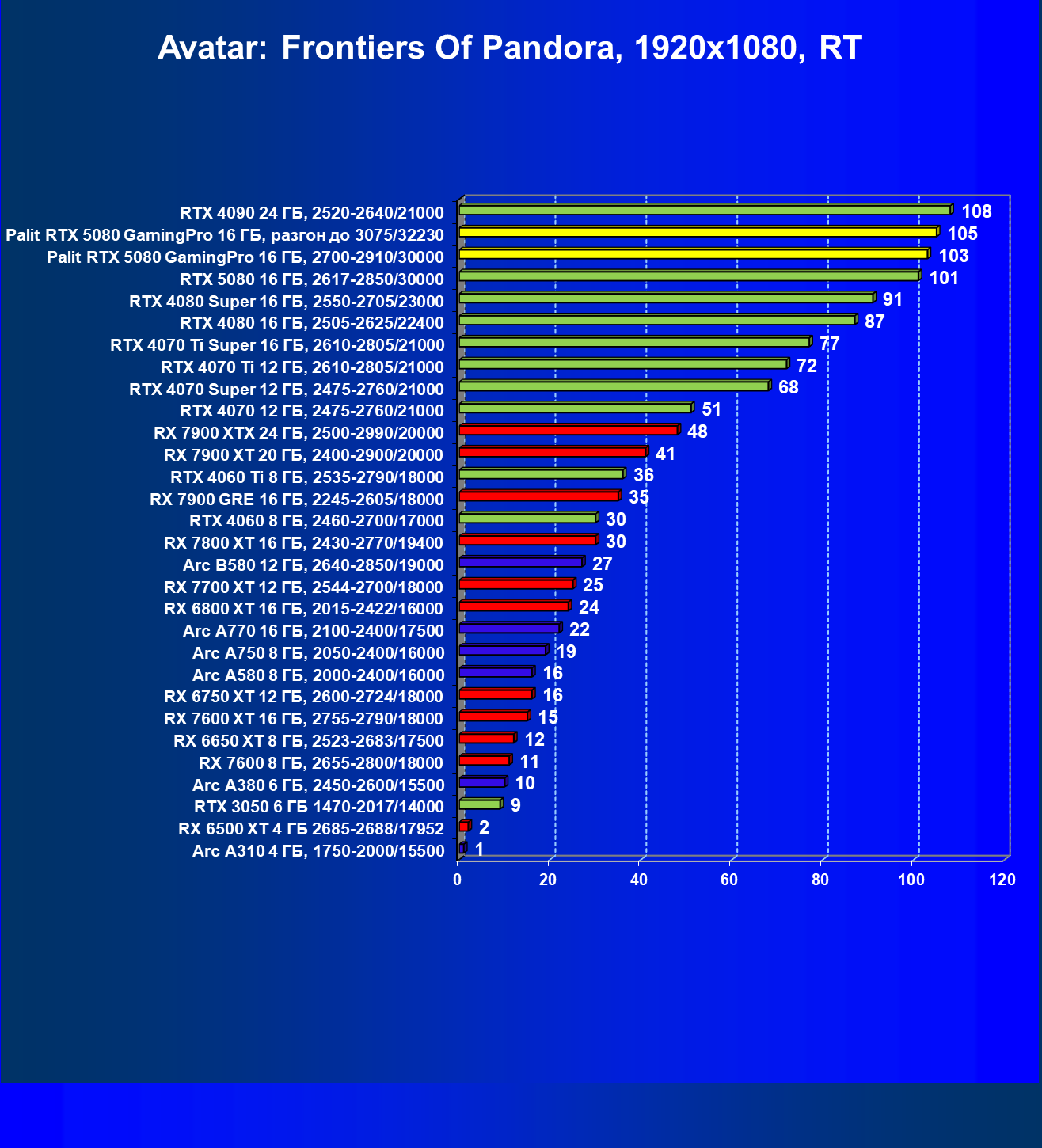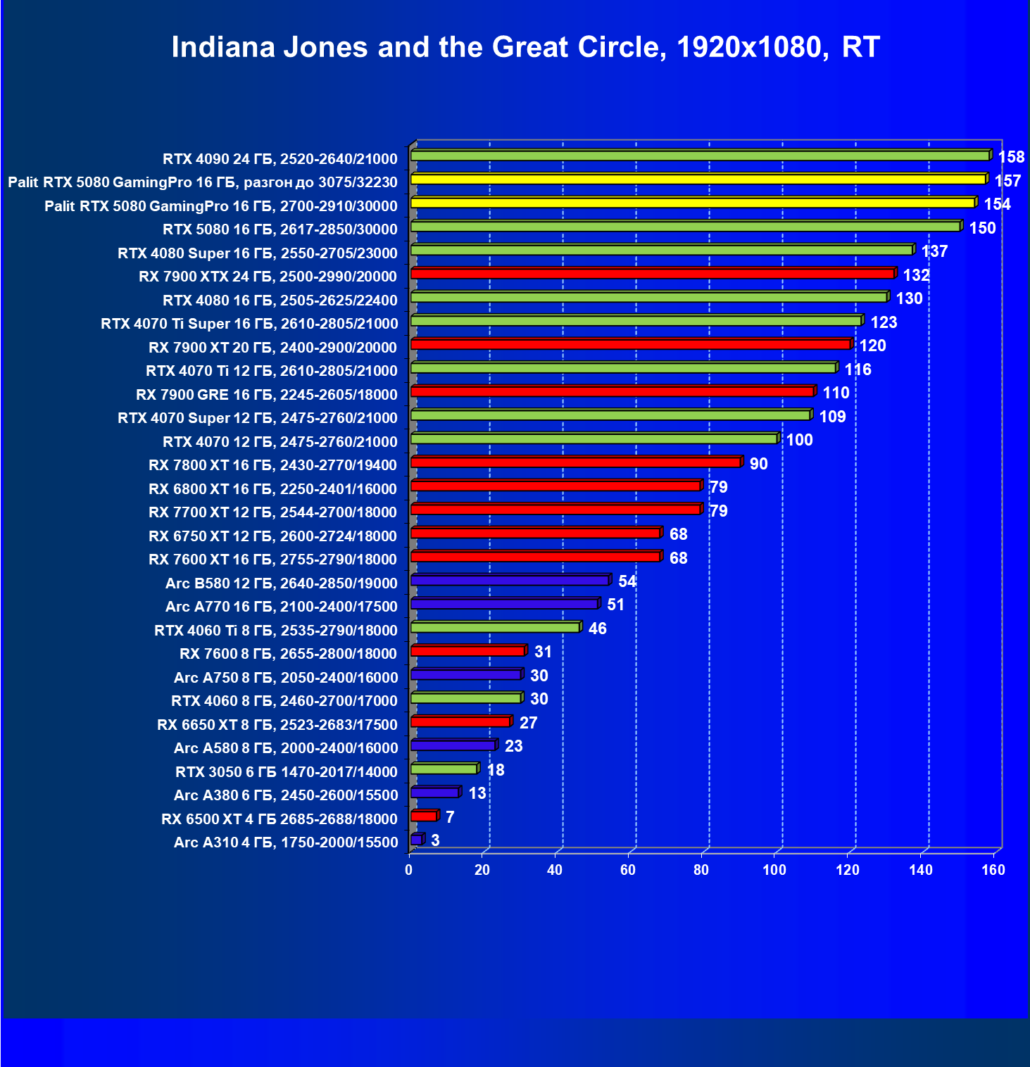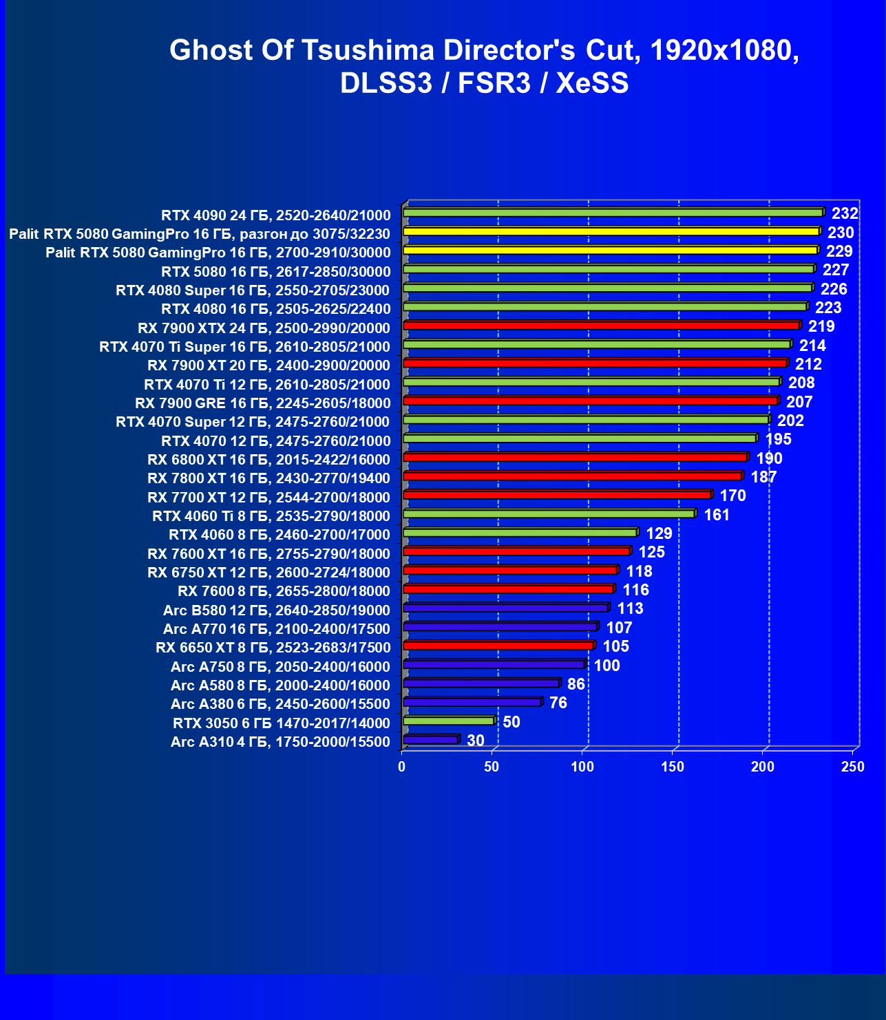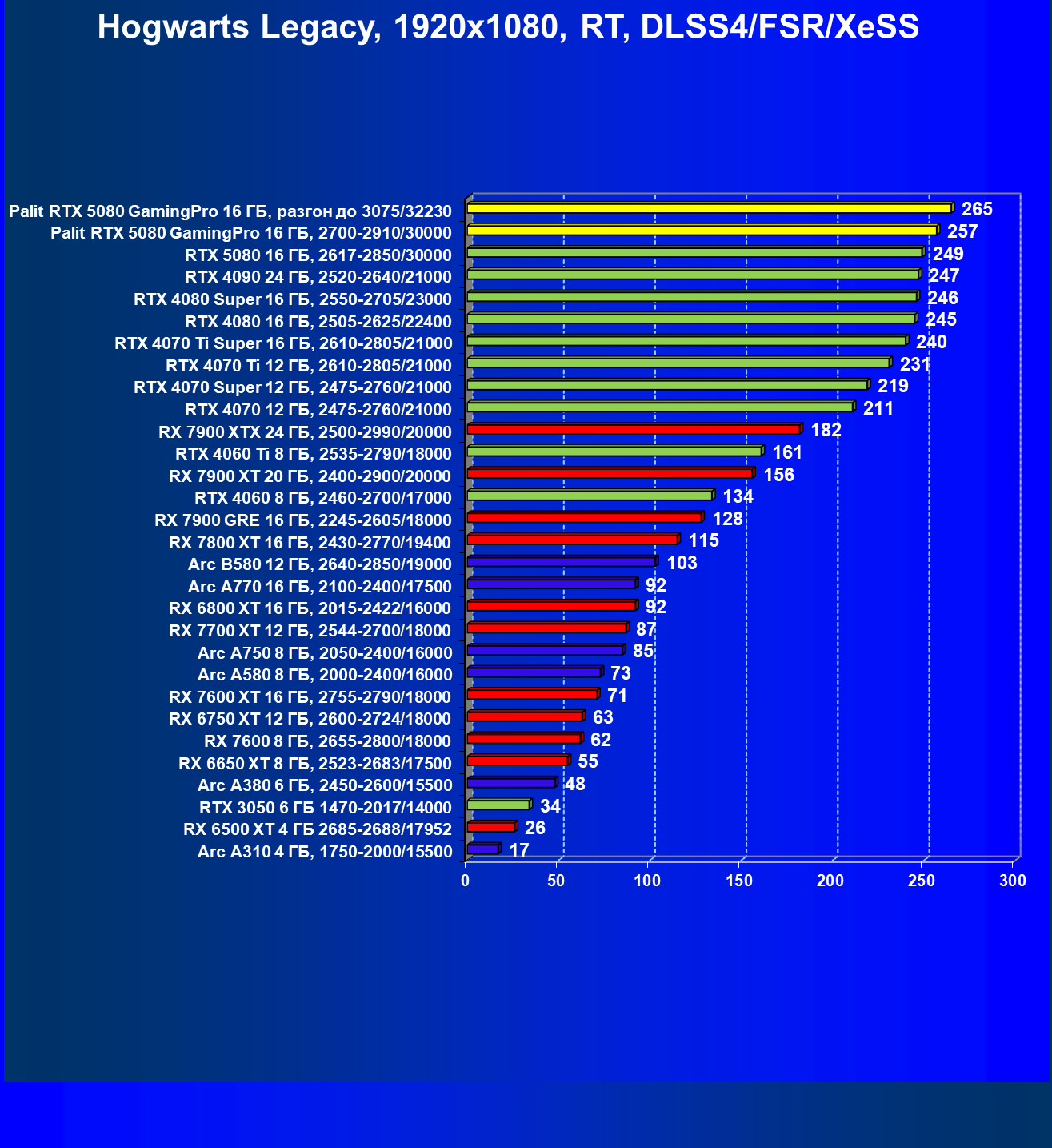 | 23 | Palit RTX 5080 GamingPro 16 ГБ, разгон до 3075/32230 | 309 | 5255 | 170 000 |