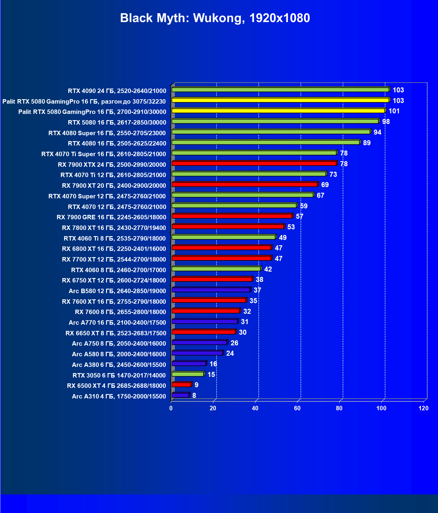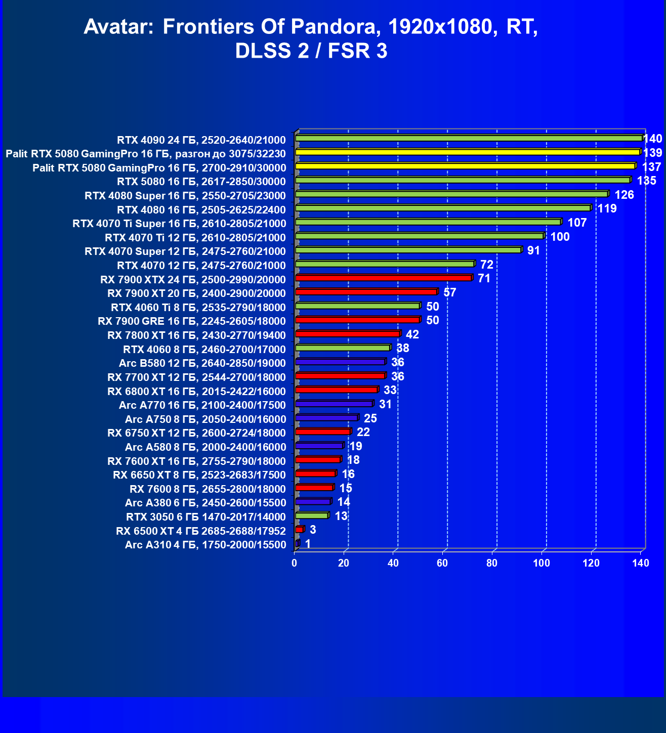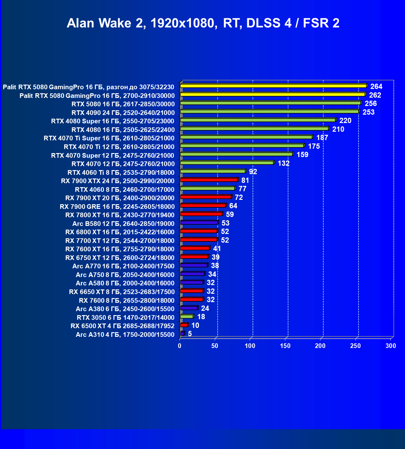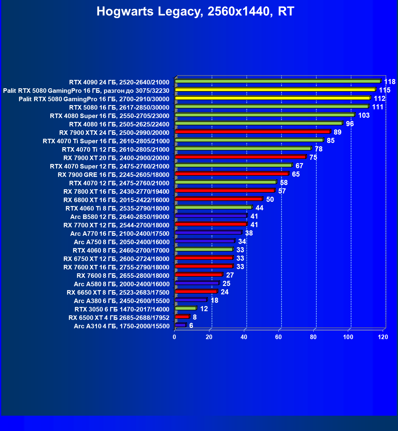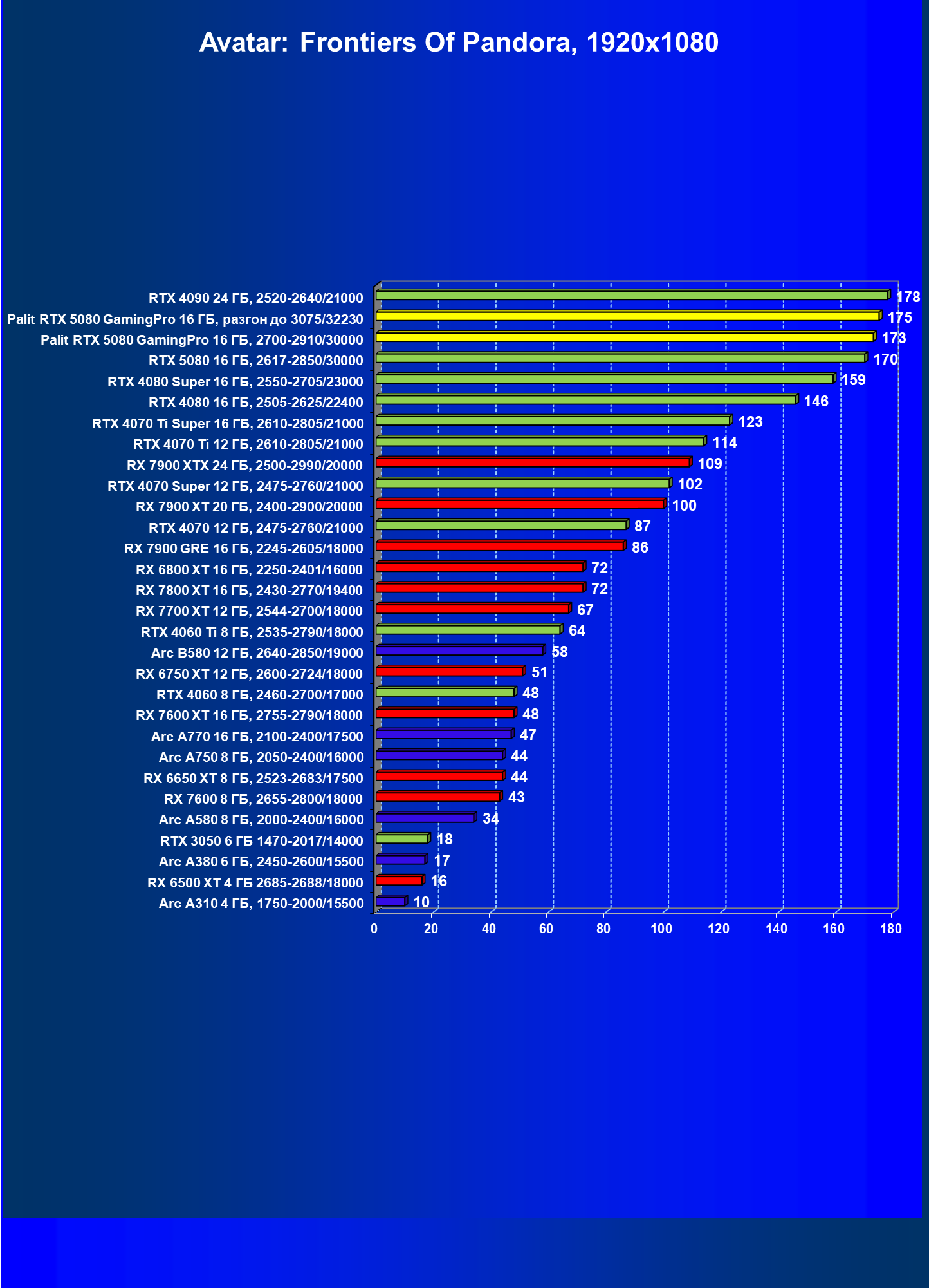 | 23 | Palit RTX 5080 GamingPro 16 ГБ, разгон до 3075/32230 | 309 | 5255 | 170 000 |