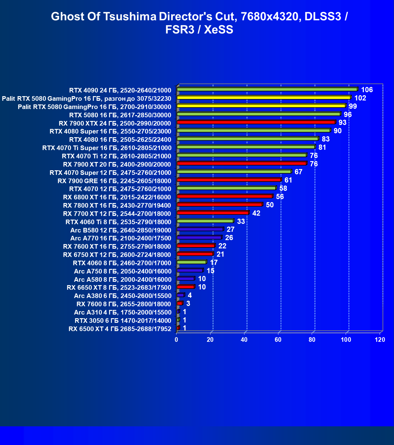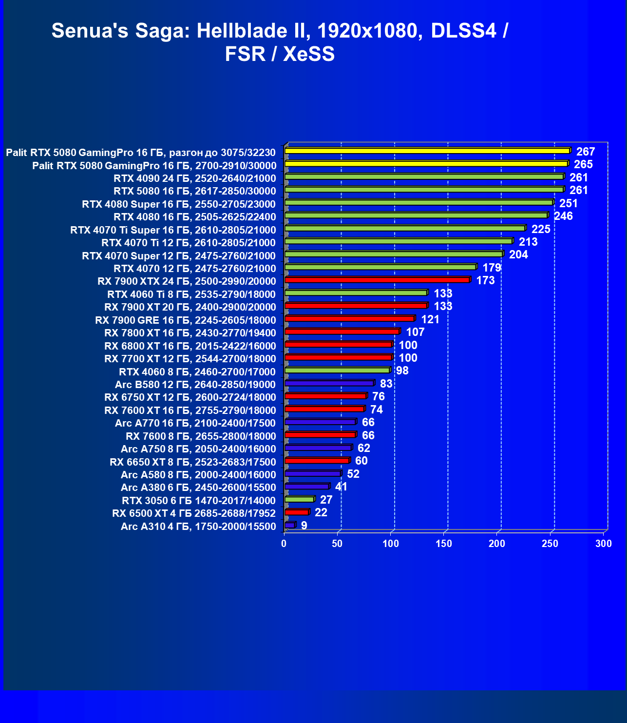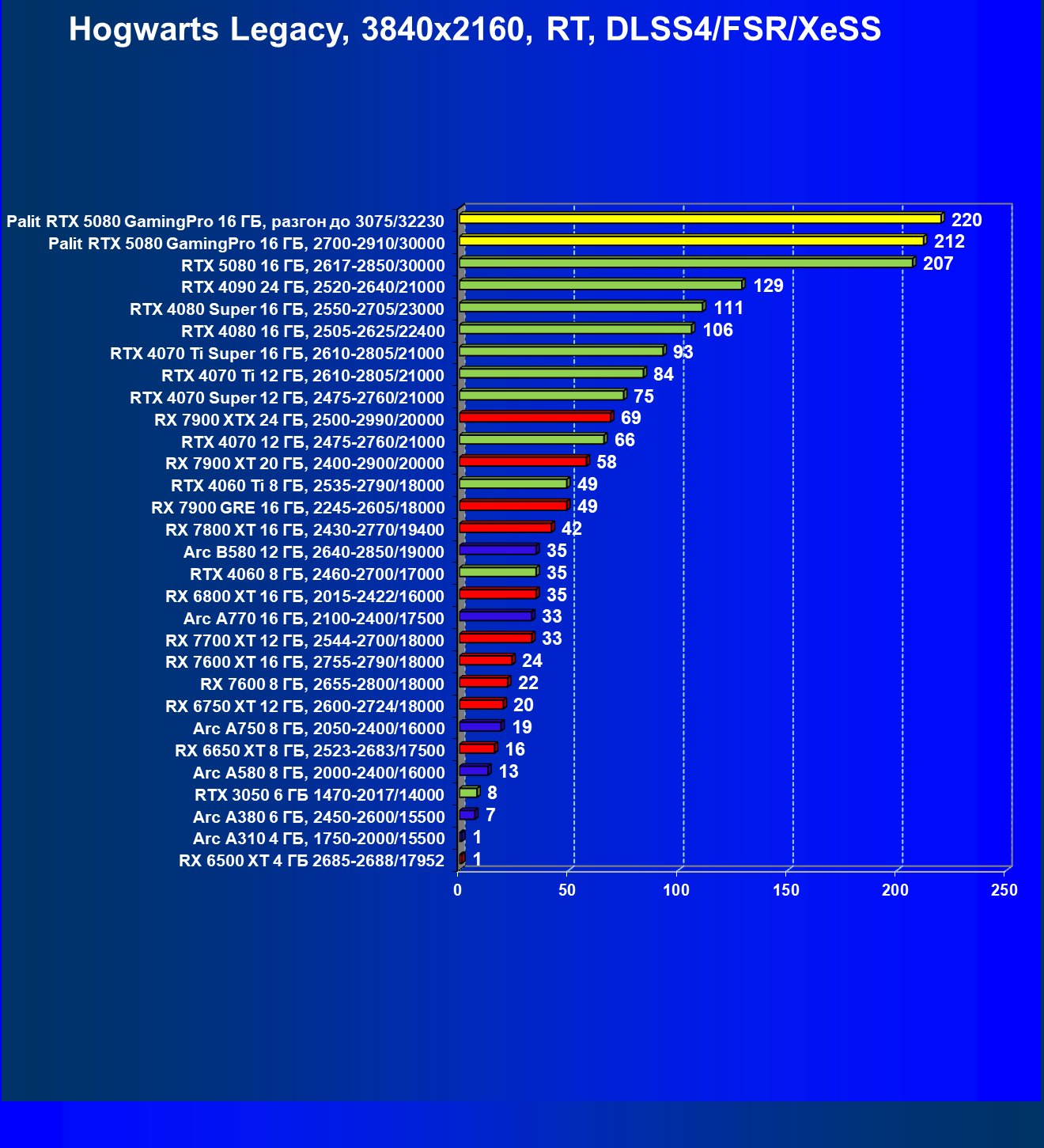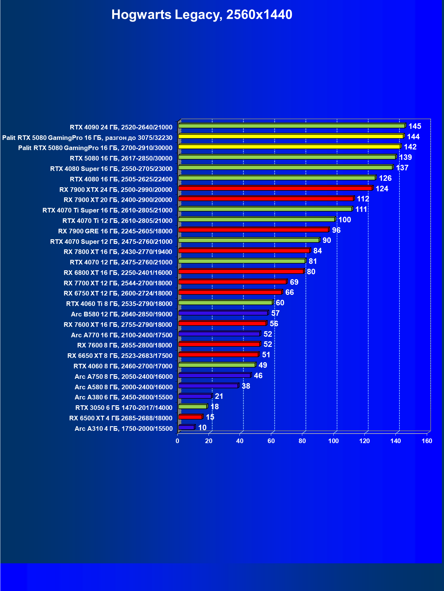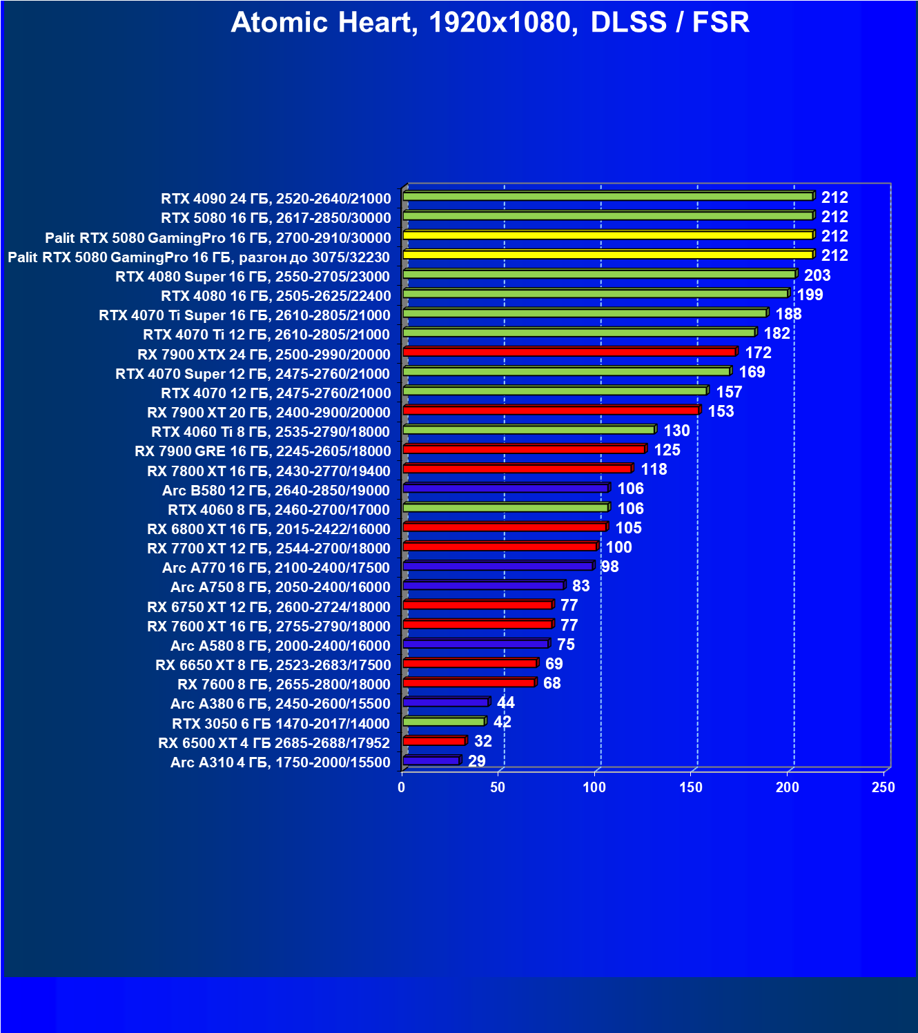 | 23 | Palit RTX 5080 GamingPro 16 ГБ, разгон до 3075/32230 | 309 | 5255 | 170 000 |