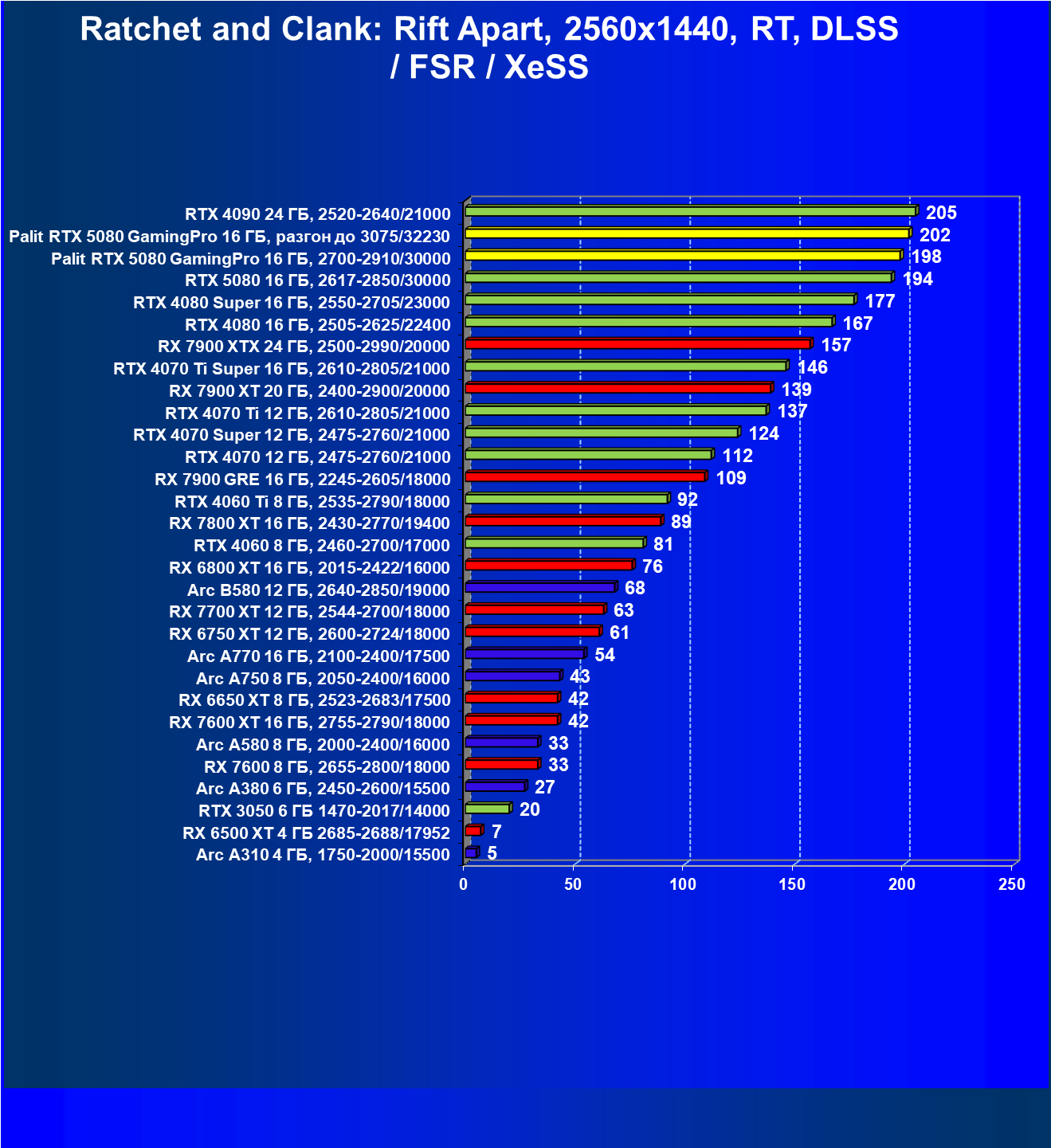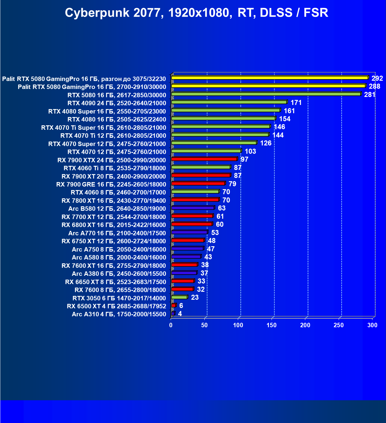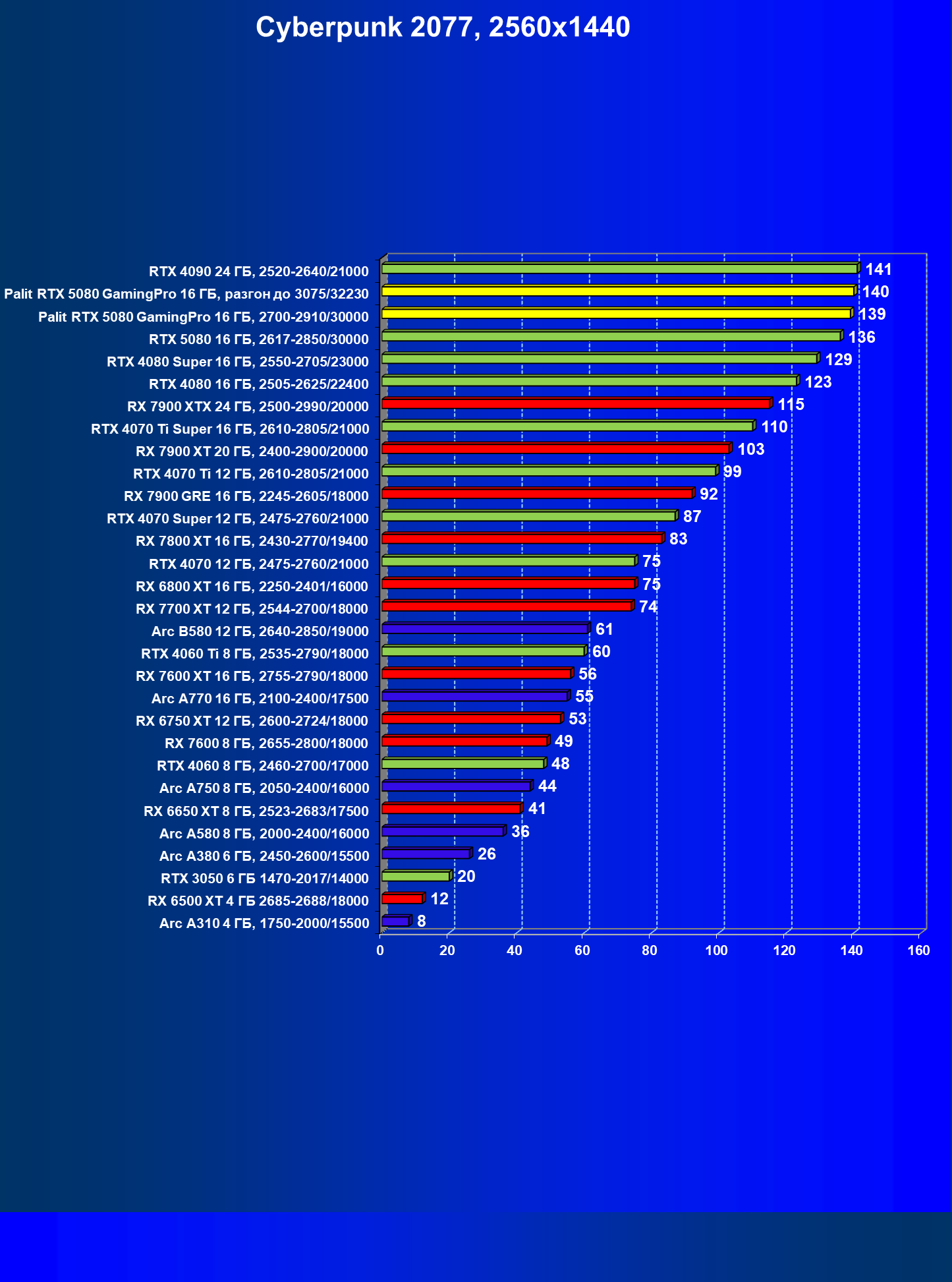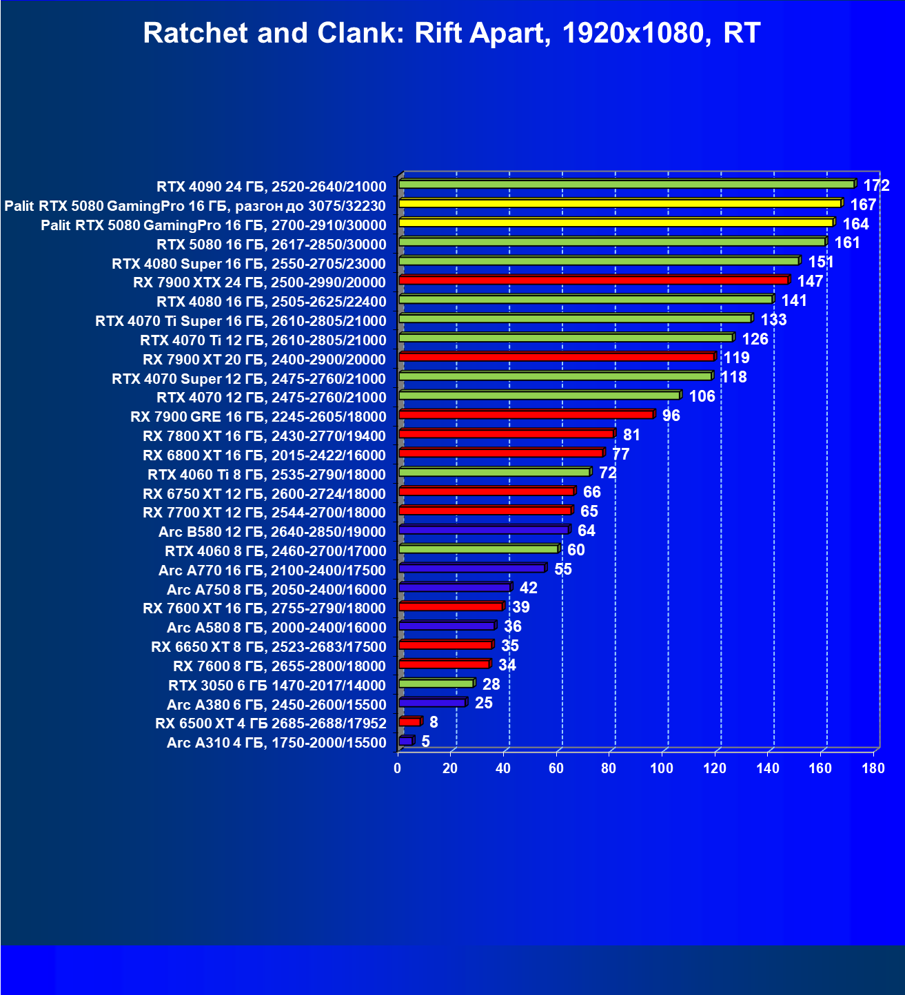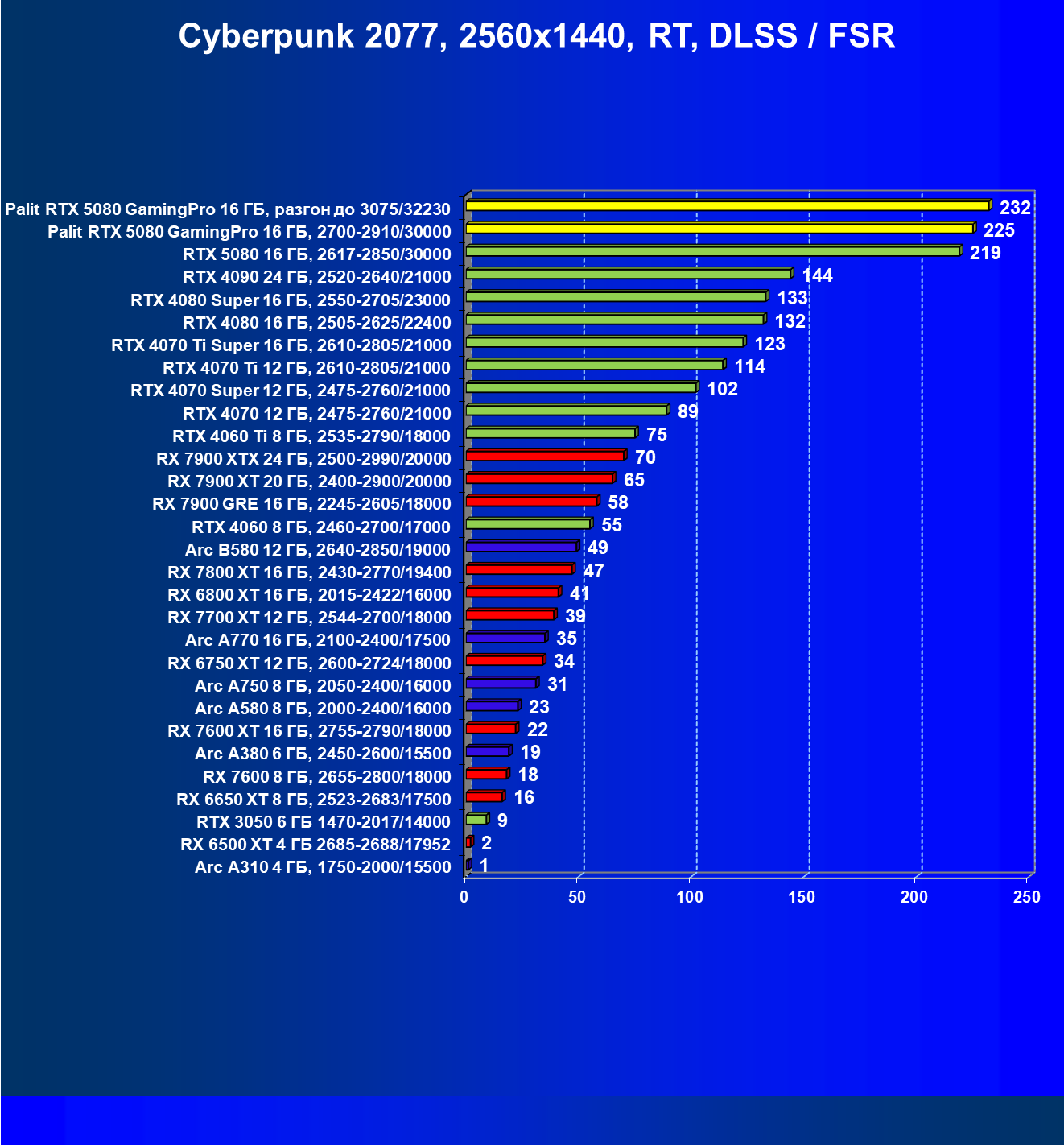 С учетом новизны GeForce RTX 5080, а также приличного дефицита таких карт их цены сильно завышены (напомним, что рекомендованная цена Nvidia — 1000 долларов). К тому же, большинство продвинутых пользователей, отдавших огромные деньги за такую видеокарту для игр, при наличии поддержки RT и/или технологий динамического масштабирования в игре обязательно будут использовать эти технологии, так что сейчас обращать внимание на этот рейтинг, наверное, не имеет смысла.