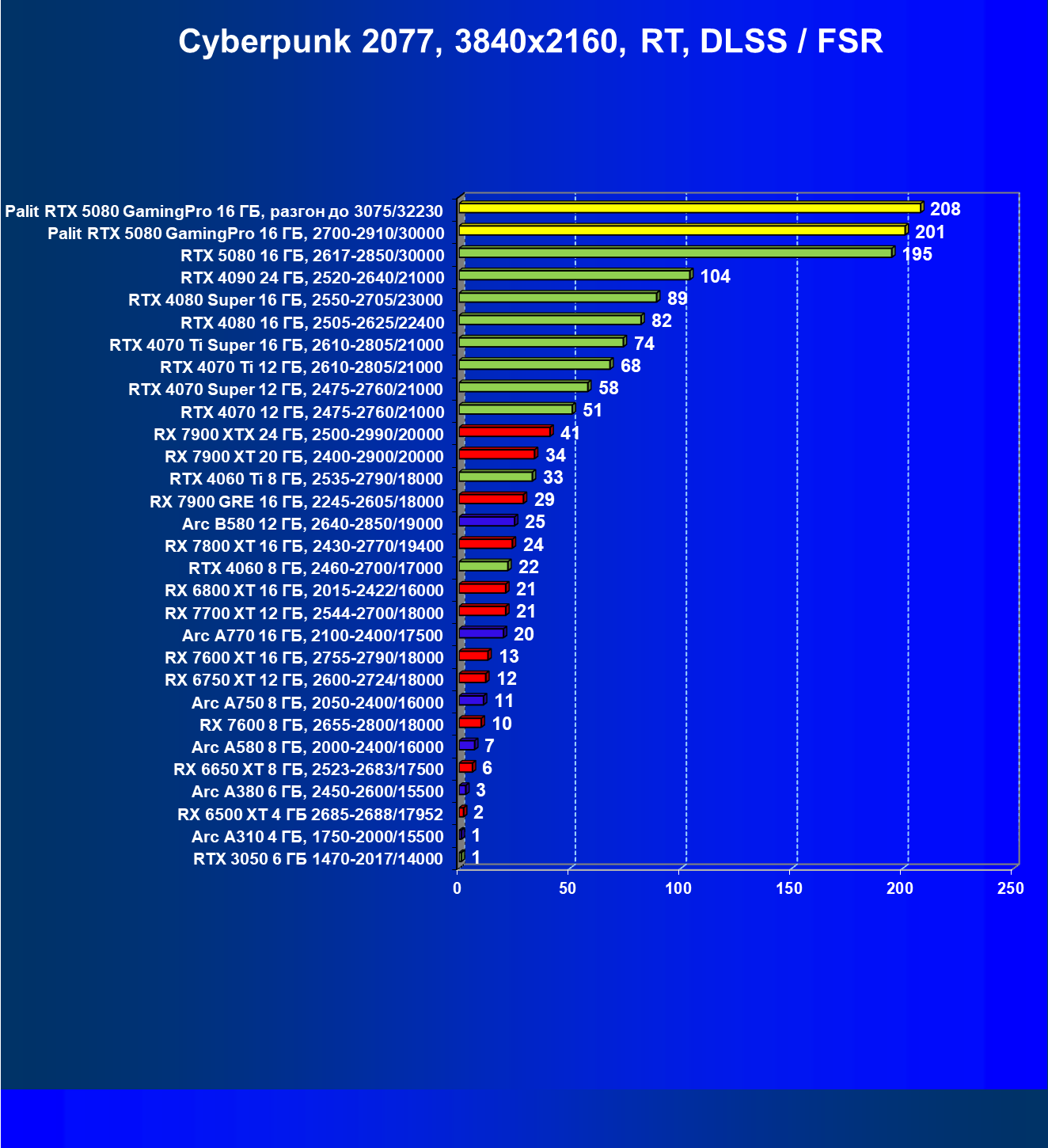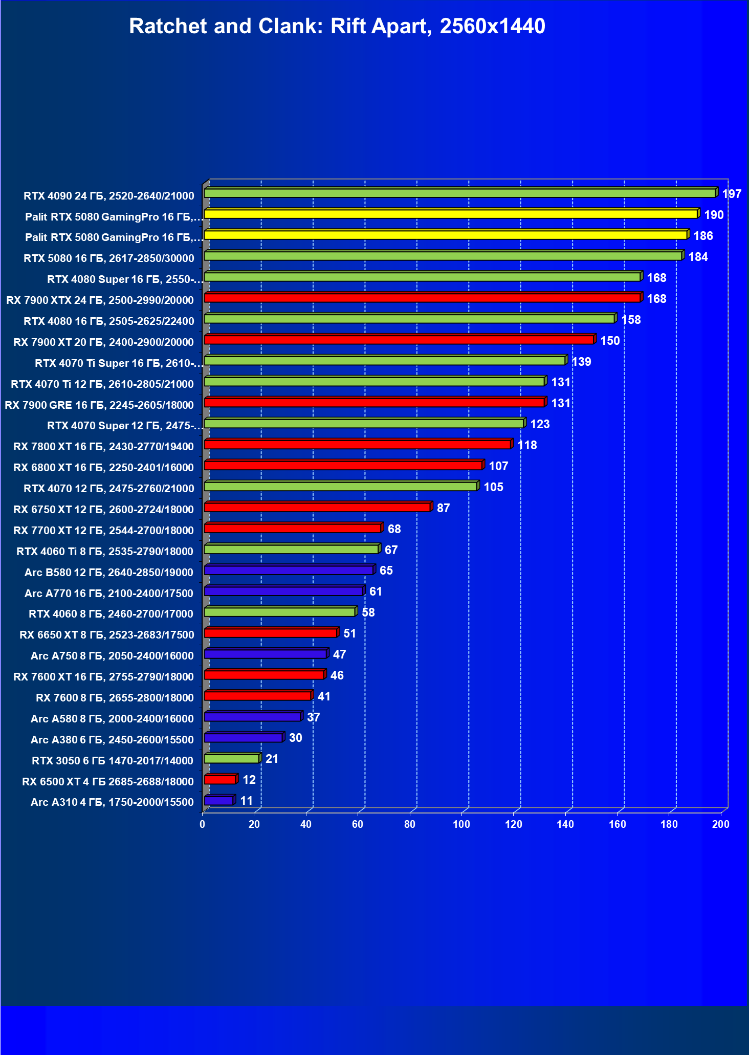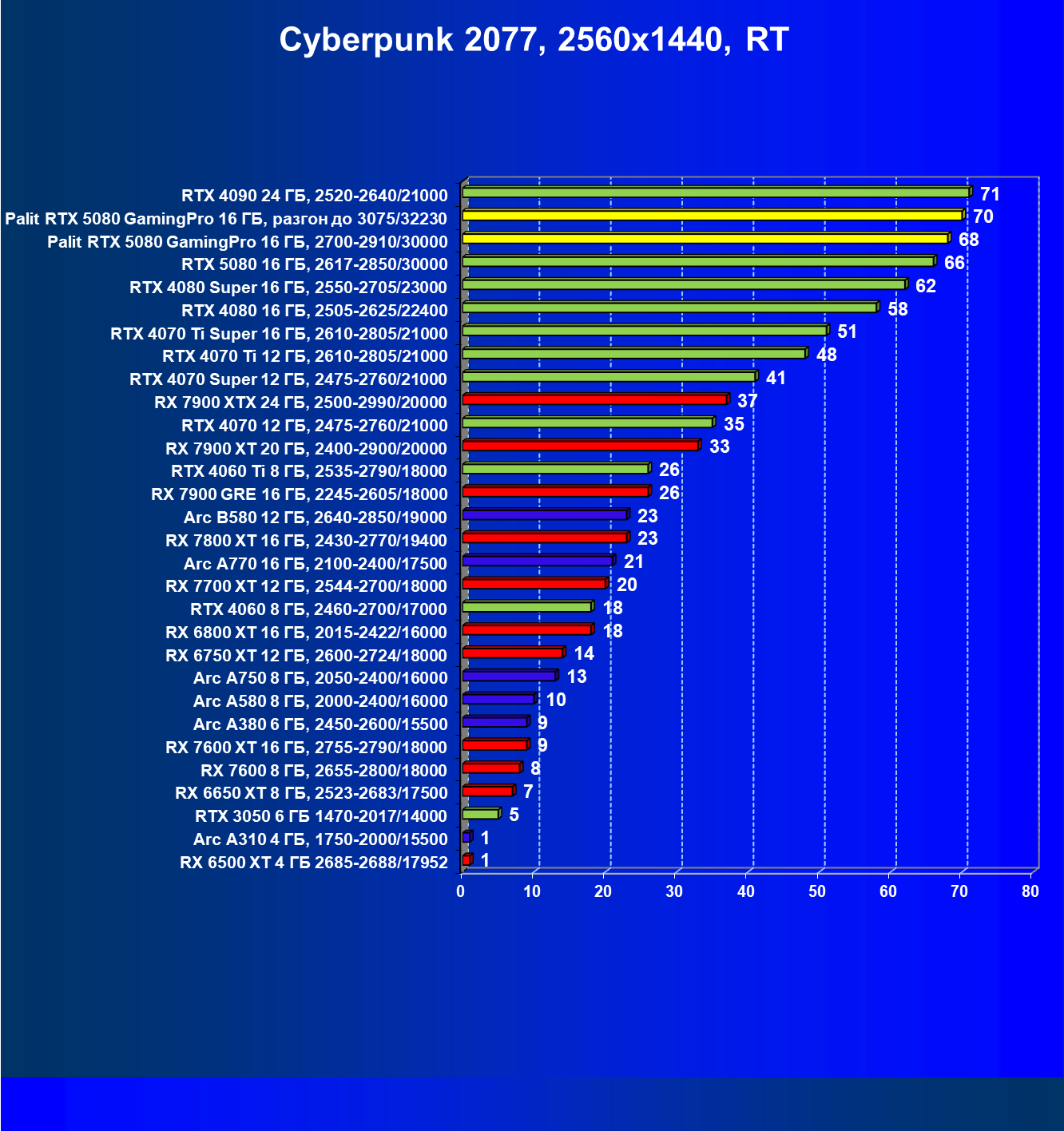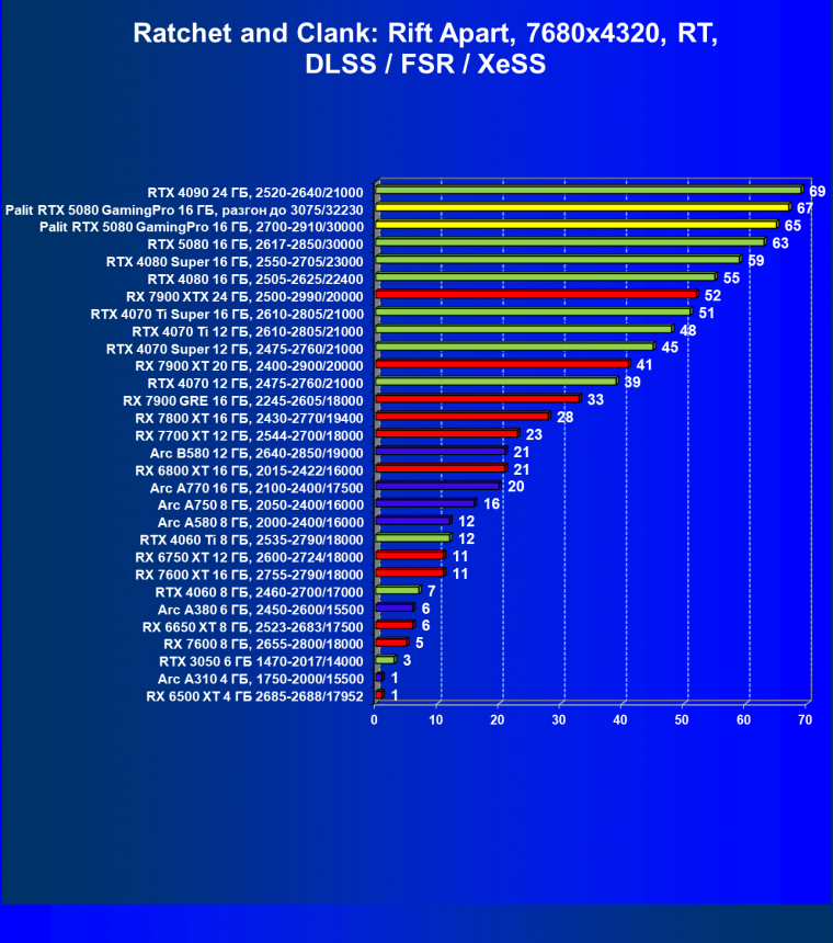С учетом новизны GeForce RTX 5080, а также приличного дефицита таких карт их цены сильно завышены (напомним, что рекомендованная цена Nvidia — 1000 долларов). К тому же, большинство продвинутых пользователей, отдавших огромные деньги за такую видеокарту для игр, при наличии поддержки RT и/или технологий динамического масштабирования в игре обязательно будут использовать эти технологии, так что сейчас обращать внимание на этот рейтинг, наверное, не имеет смысла.