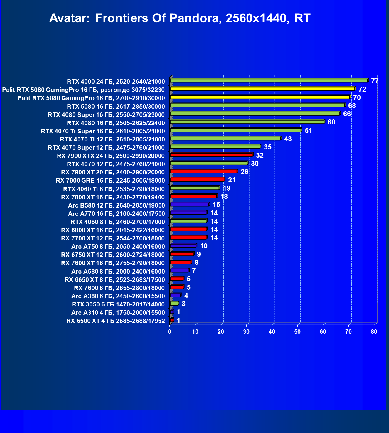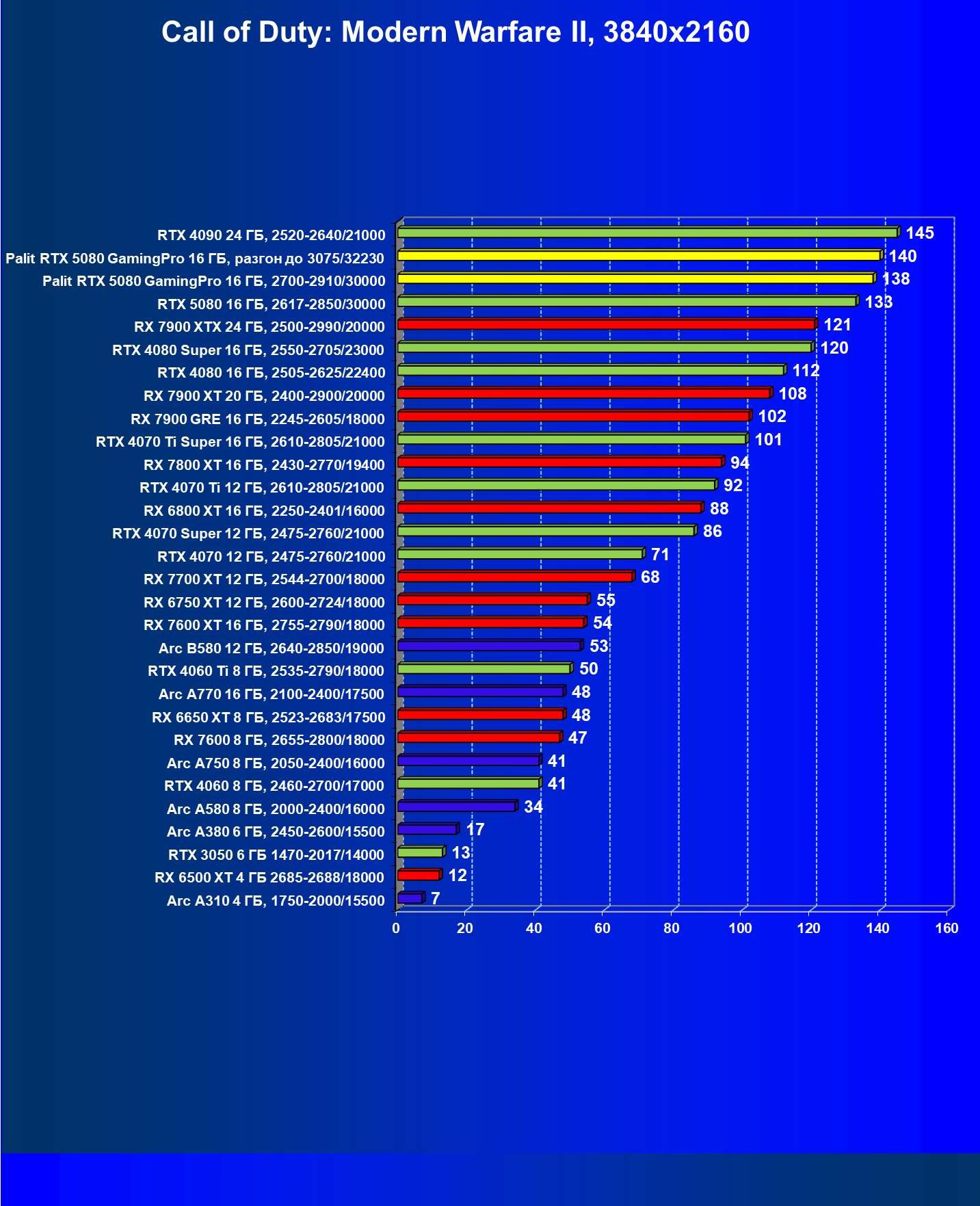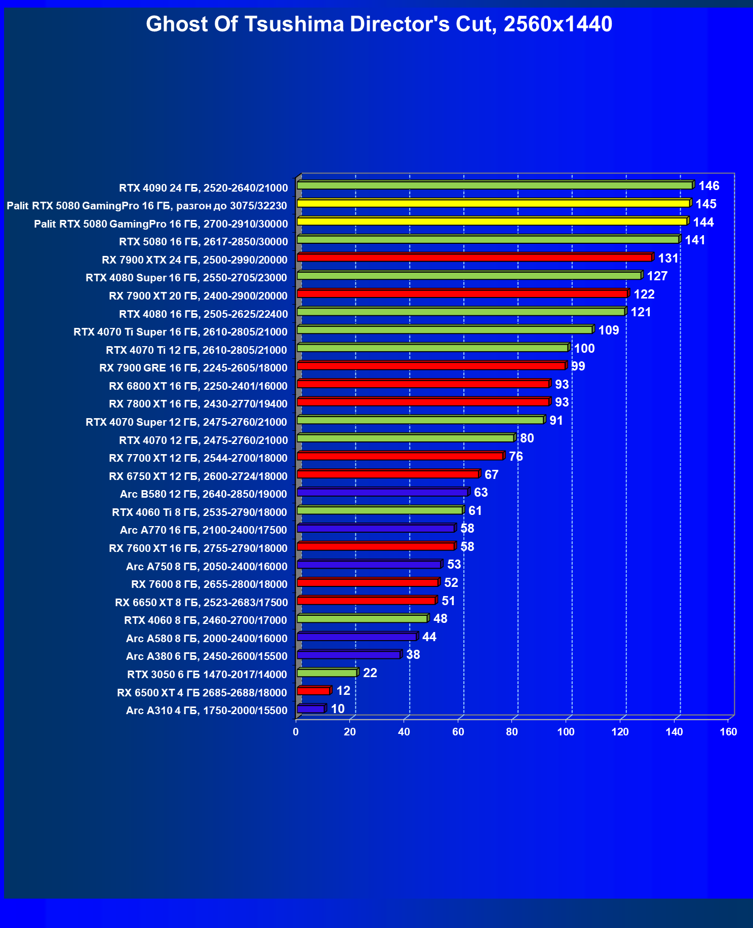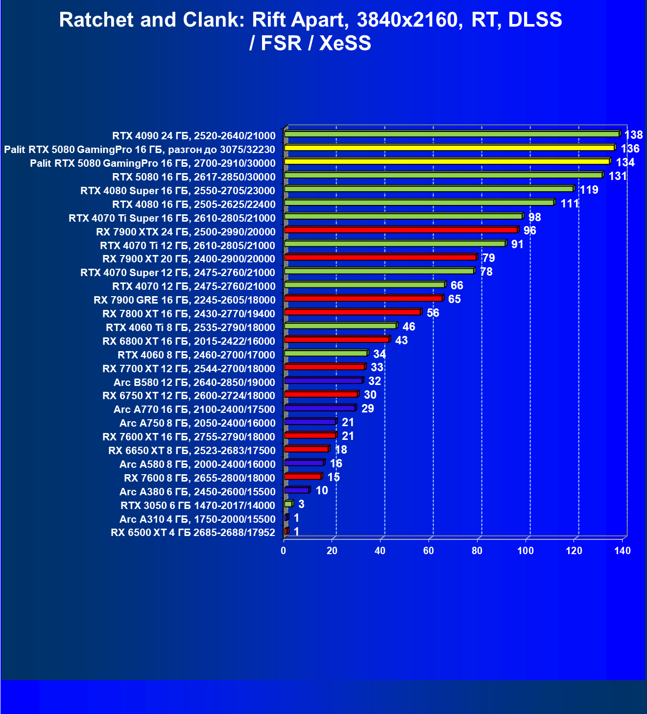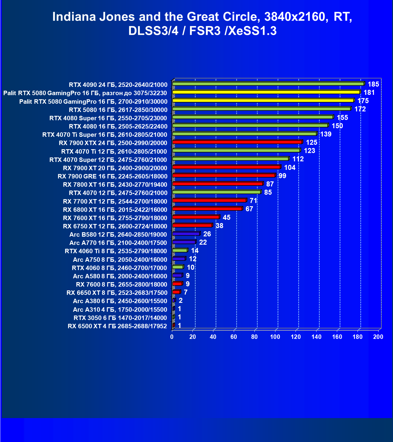 С учетом новизны GeForce RTX 5080, а также приличного дефицита таких карт их цены сильно завышены (напомним, что рекомендованная цена Nvidia — 1000 долларов). К тому же, большинство продвинутых пользователей, отдавших огромные деньги за такую видеокарту для игр, при наличии поддержки RT и/или технологий динамического масштабирования в игре обязательно будут использовать эти технологии, так что сейчас обращать внимание на этот рейтинг, наверное, не имеет смысла.