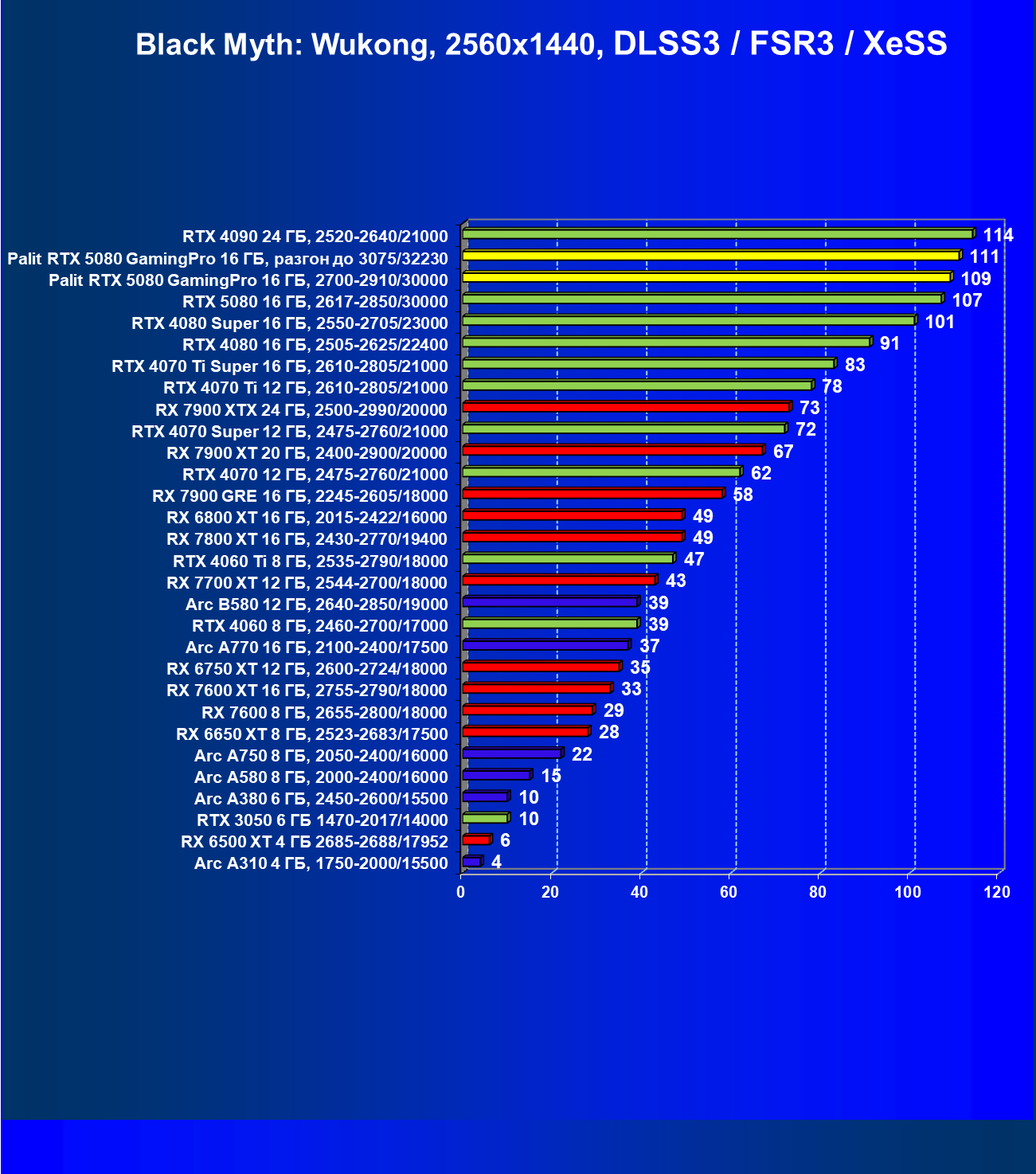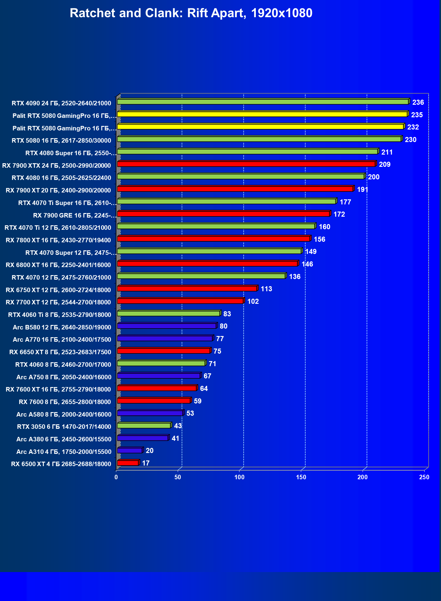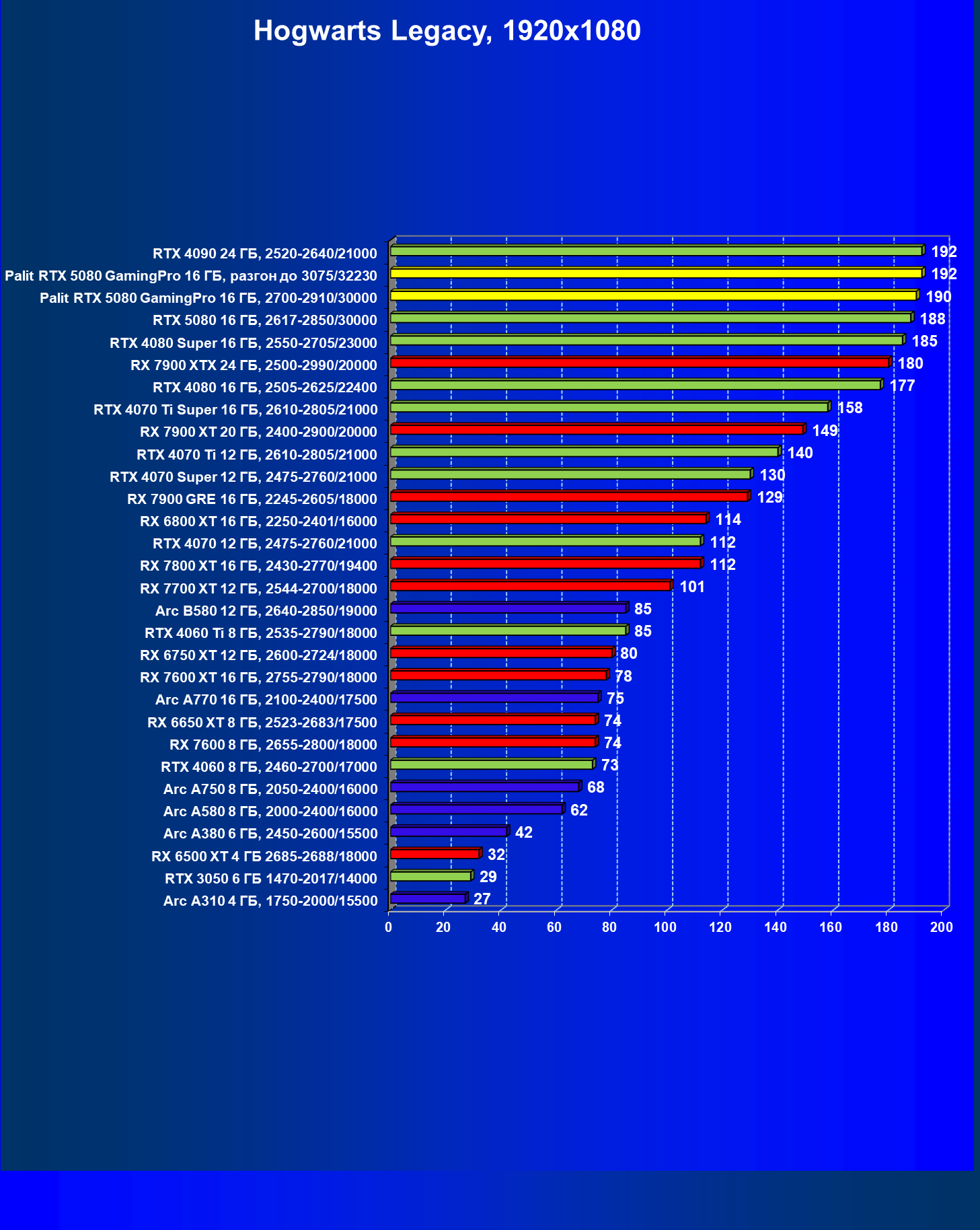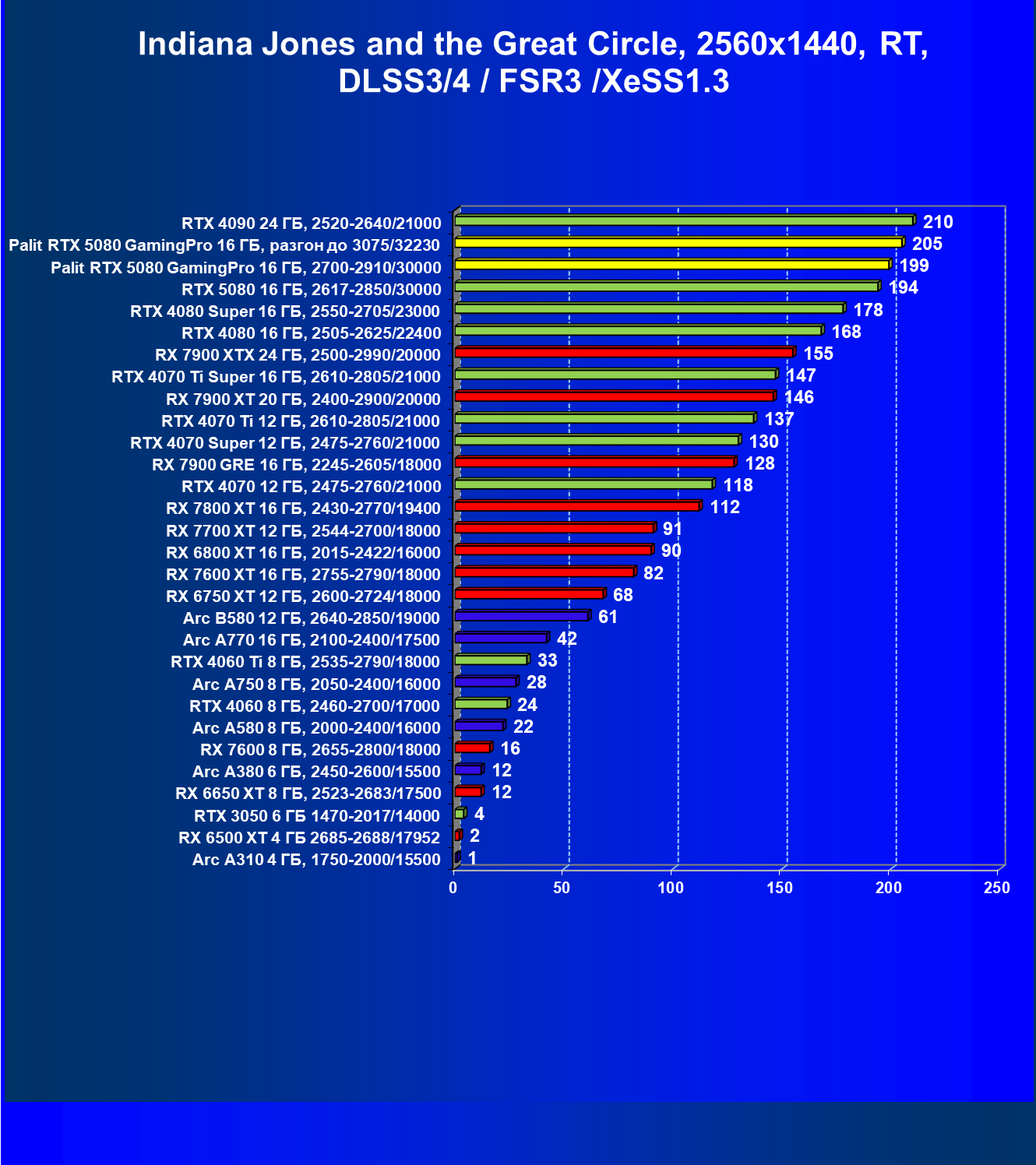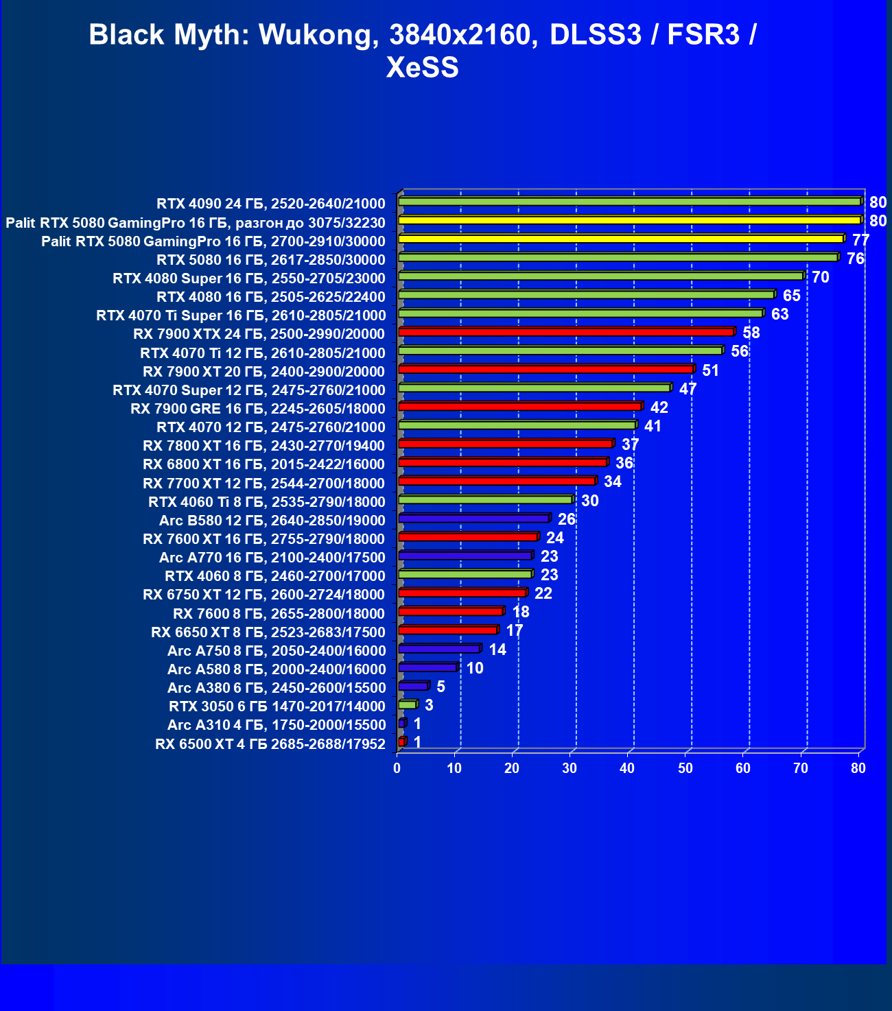С учетом новизны GeForce RTX 5080, а также приличного дефицита таких карт их цены сильно завышены (напомним, что рекомендованная цена Nvidia — 1000 долларов). К тому же, большинство продвинутых пользователей, отдавших огромные деньги за такую видеокарту для игр, при наличии поддержки RT и/или технологий динамического масштабирования в игре обязательно будут использовать эти технологии, так что сейчас обращать внимание на этот рейтинг, наверное, не имеет смысла.