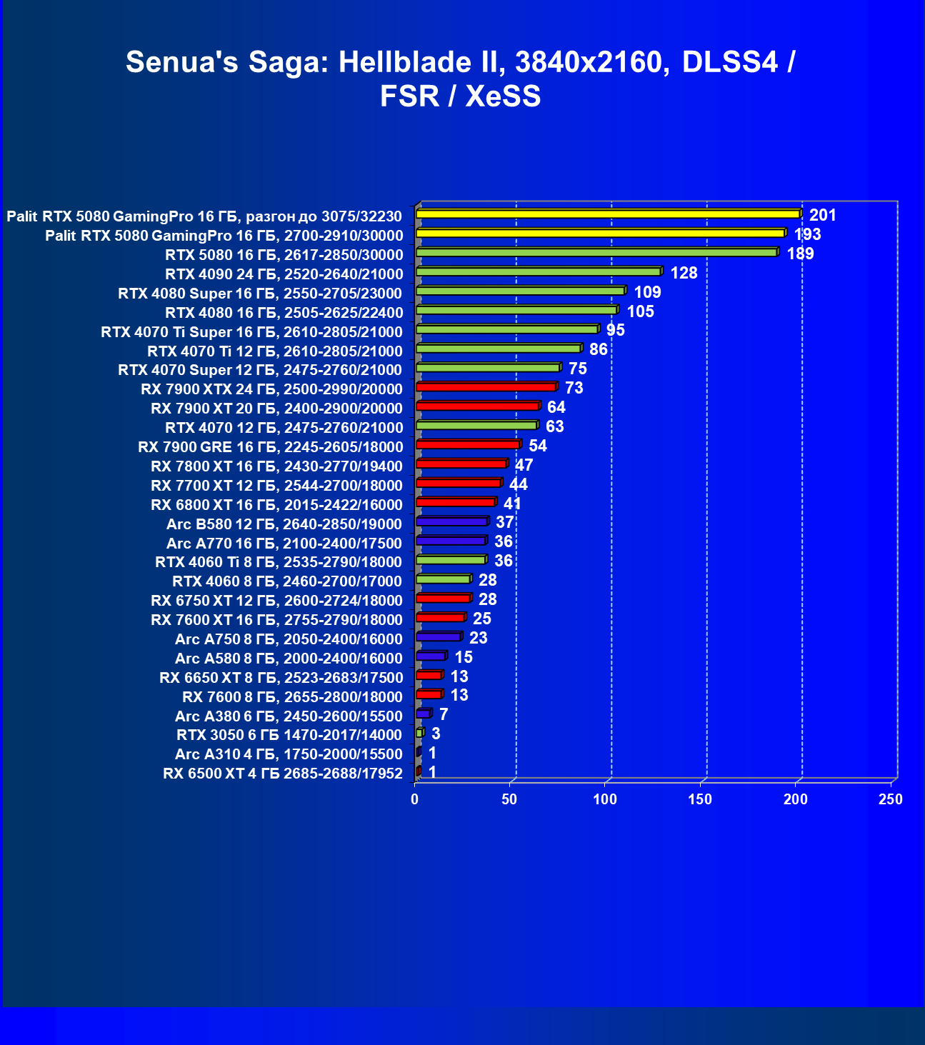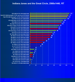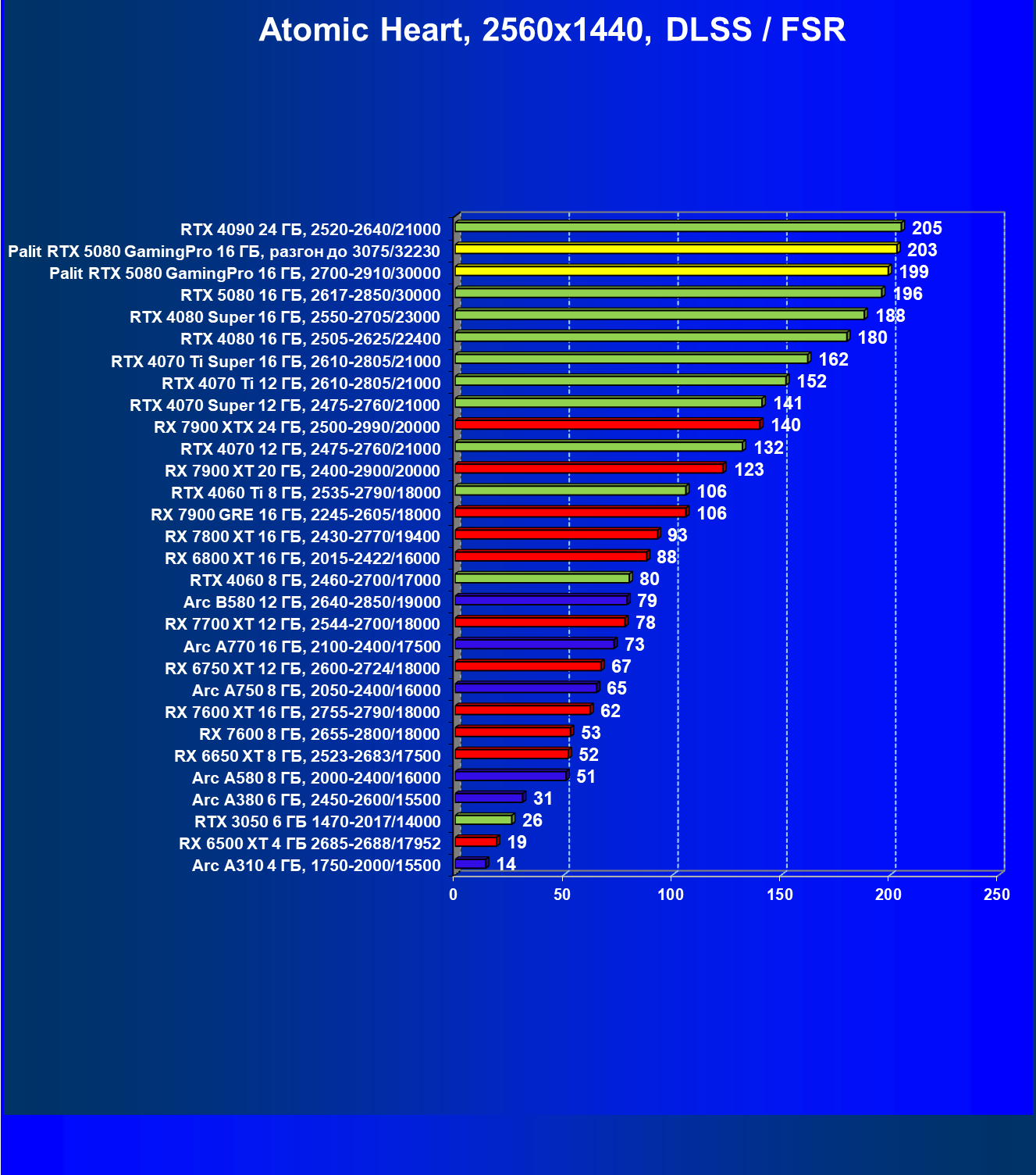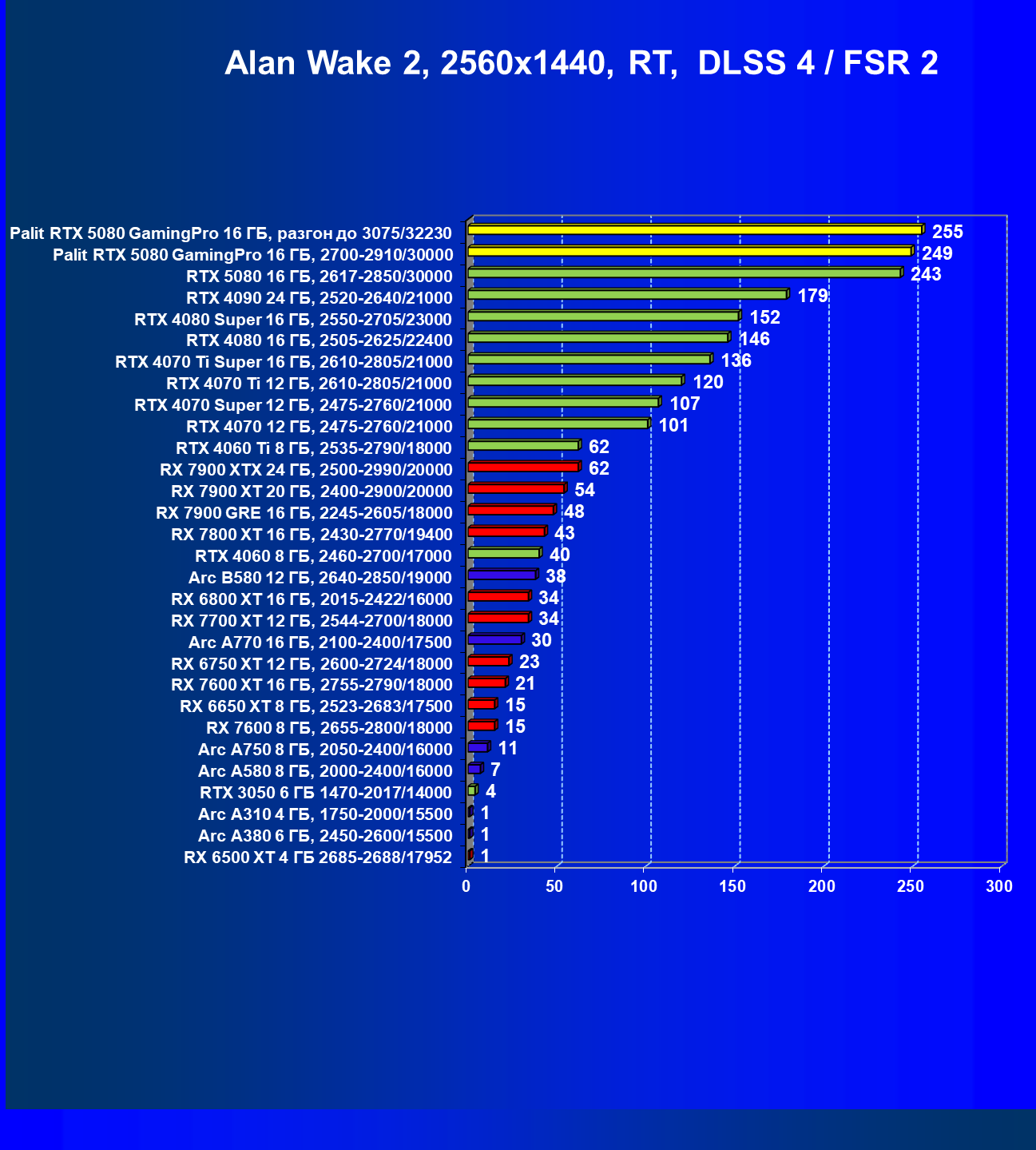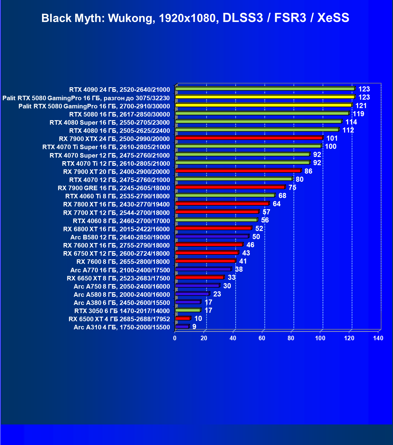 С учетом новизны GeForce RTX 5080, а также приличного дефицита таких карт их цены сильно завышены (напомним, что рекомендованная цена Nvidia — 1000 долларов). К тому же, большинство продвинутых пользователей, отдавших огромные деньги за такую видеокарту для игр, при наличии поддержки RT и/или технологий динамического масштабирования в игре обязательно будут использовать эти технологии, так что сейчас обращать внимание на этот рейтинг, наверное, не имеет смысла.