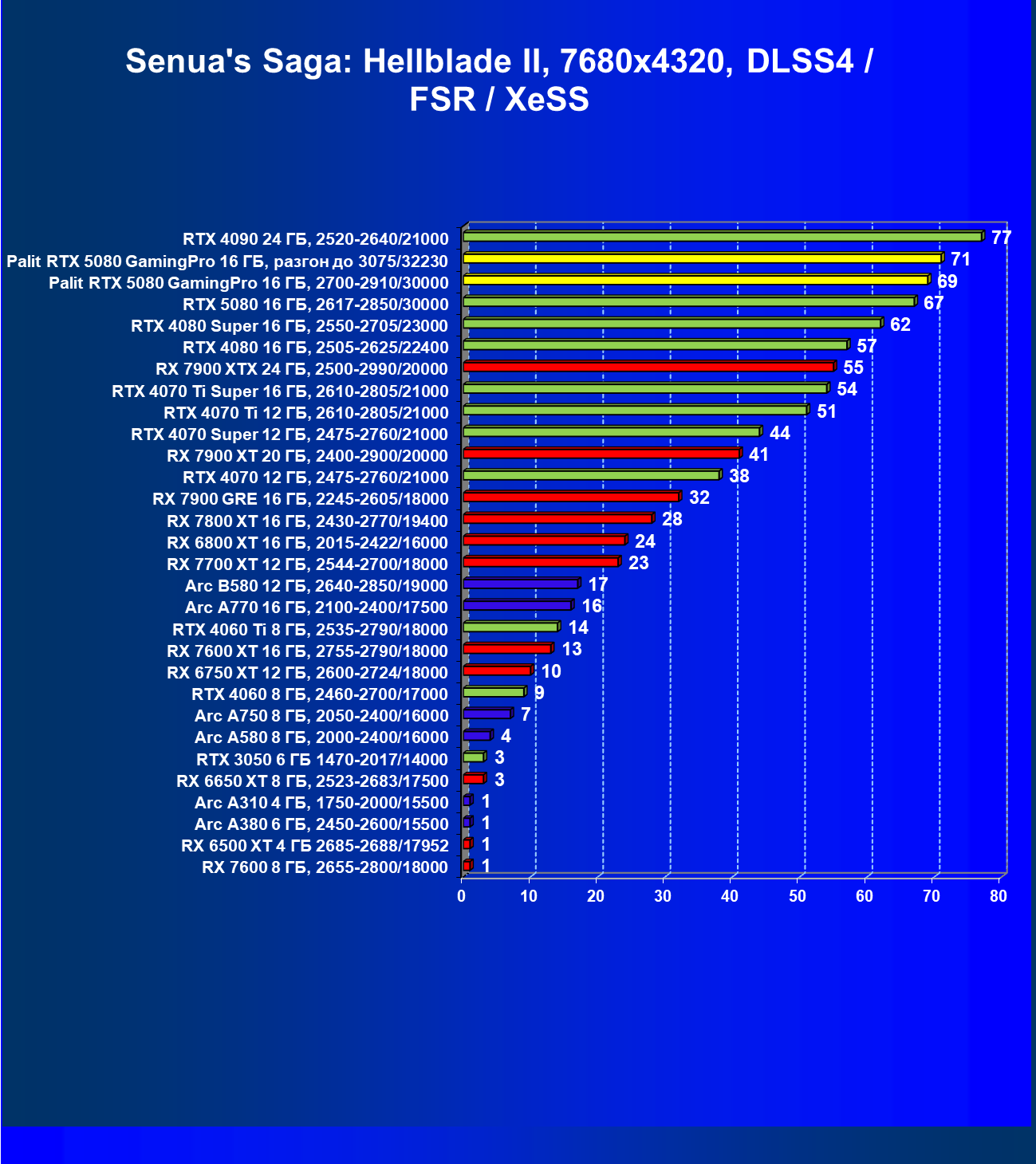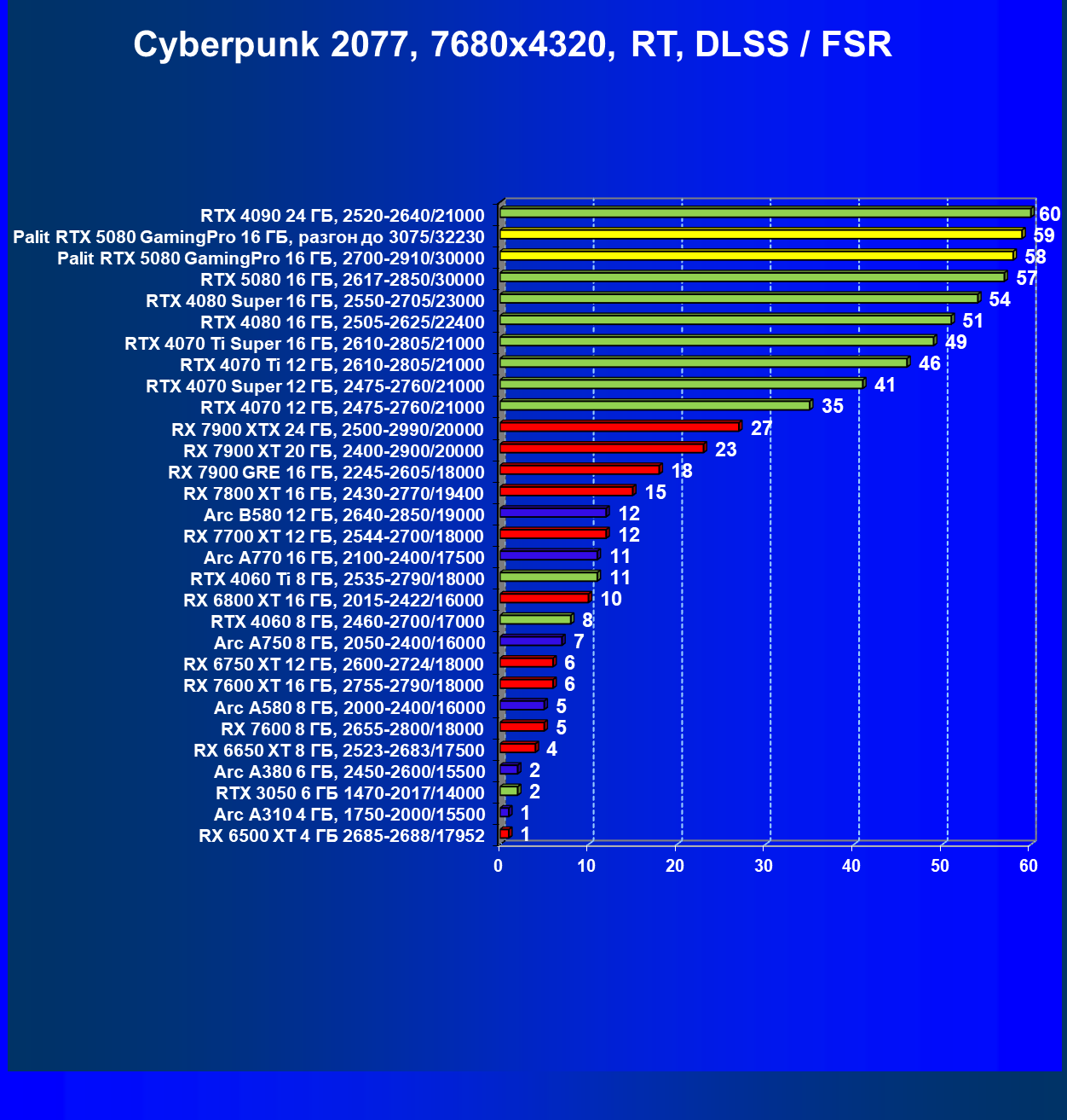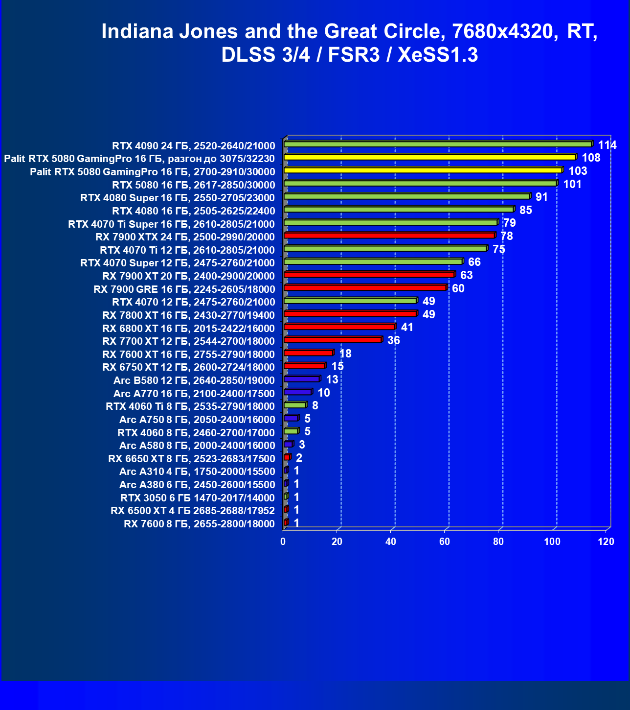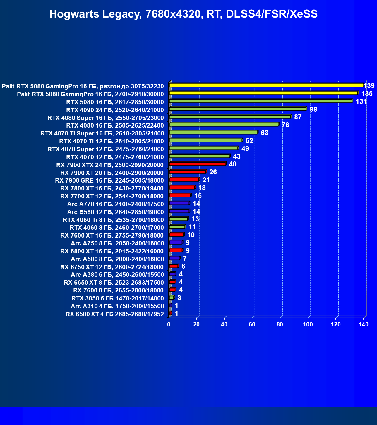 | 25 | RTX 5080 16 ГБ, 2617—2850/30000 | 294 | 4990 | 170 000 |