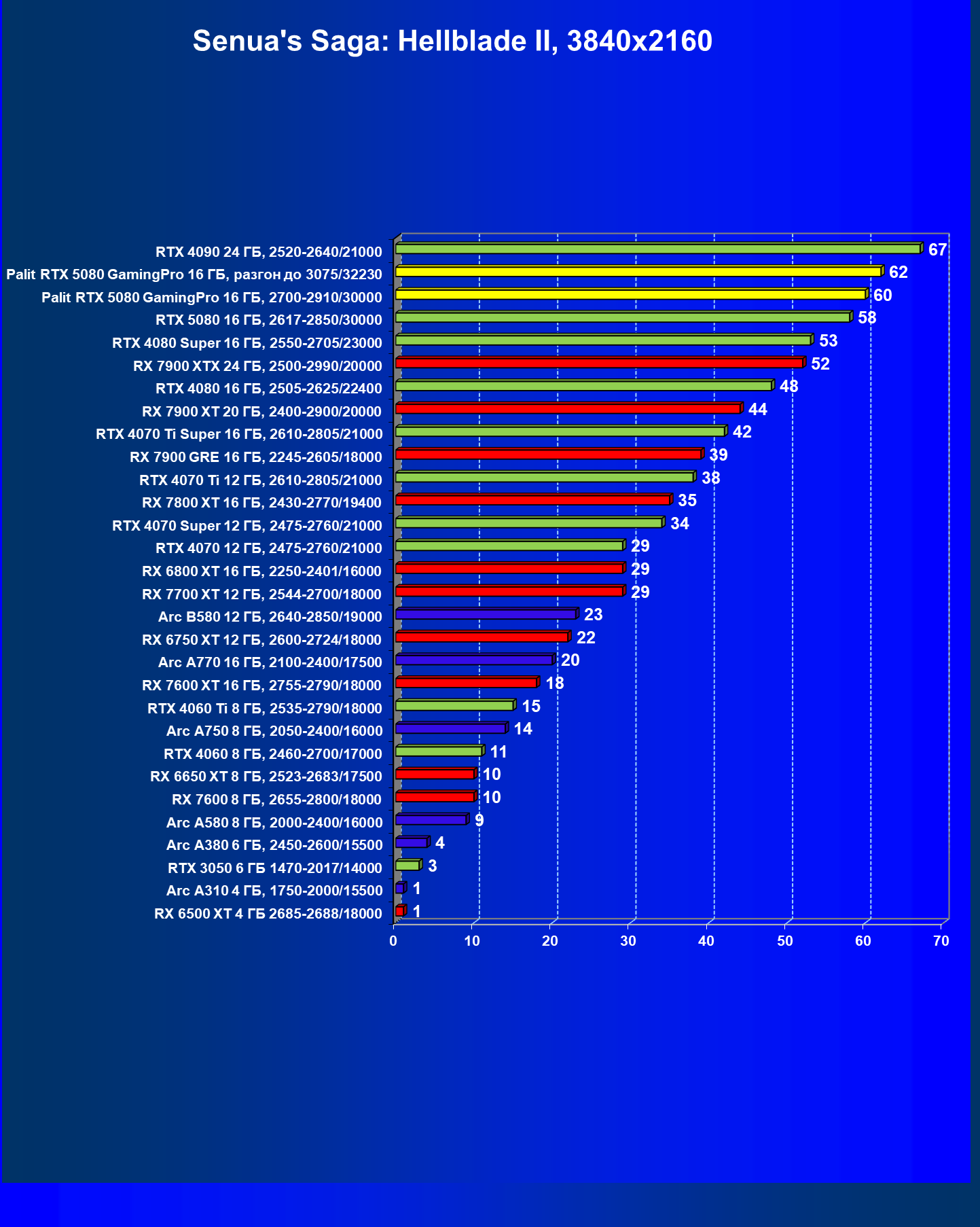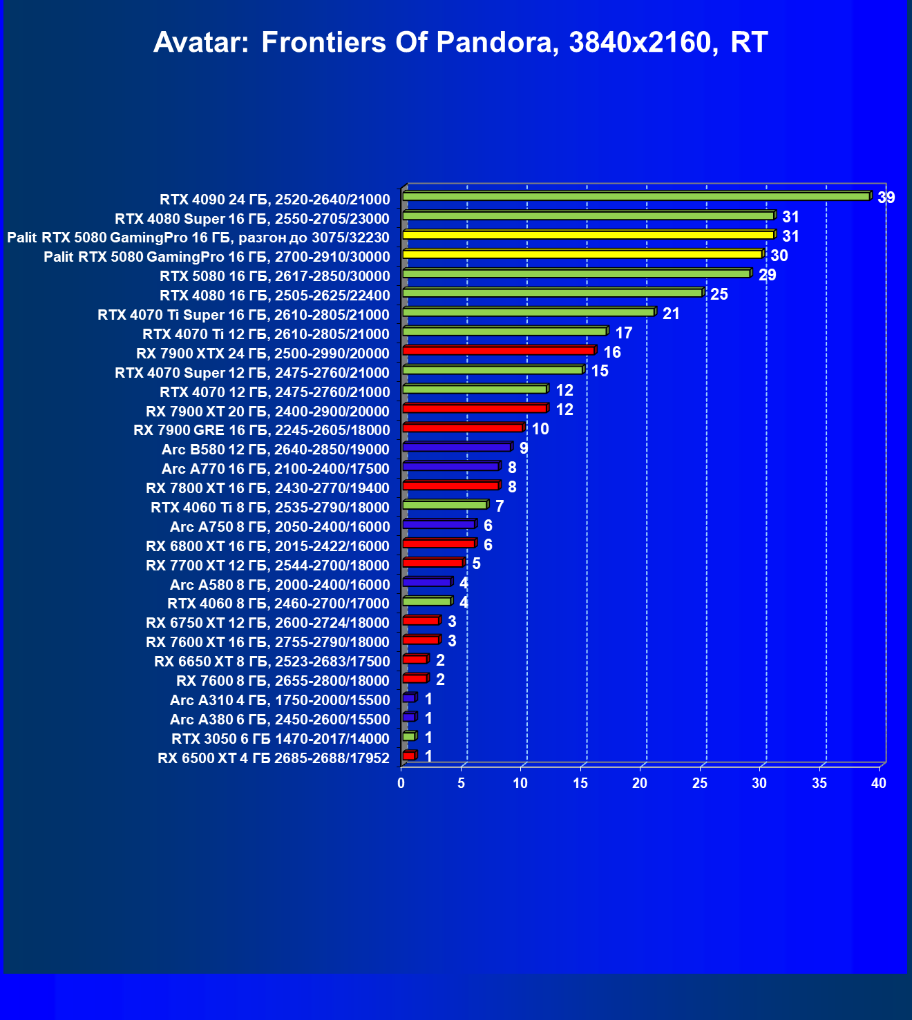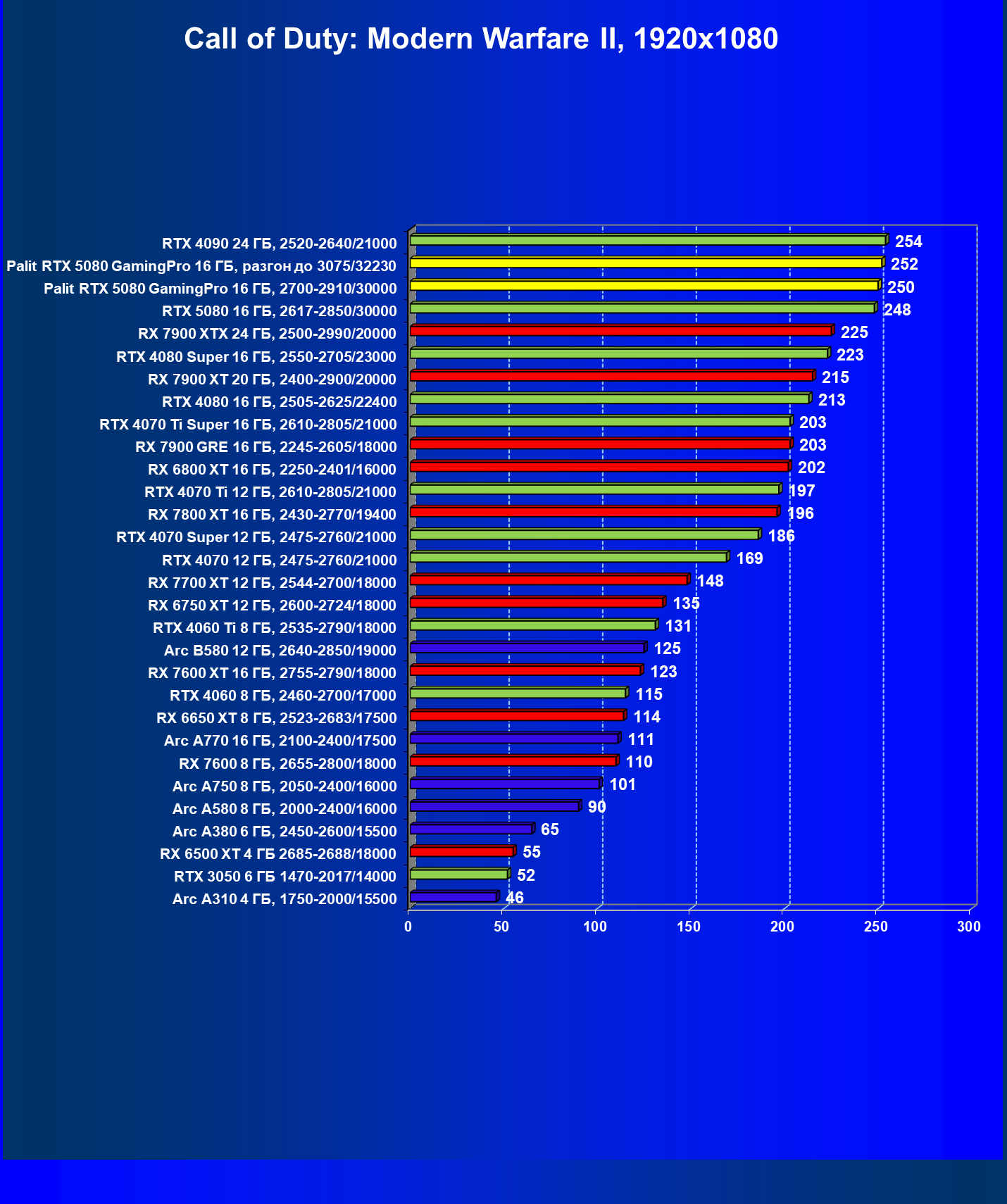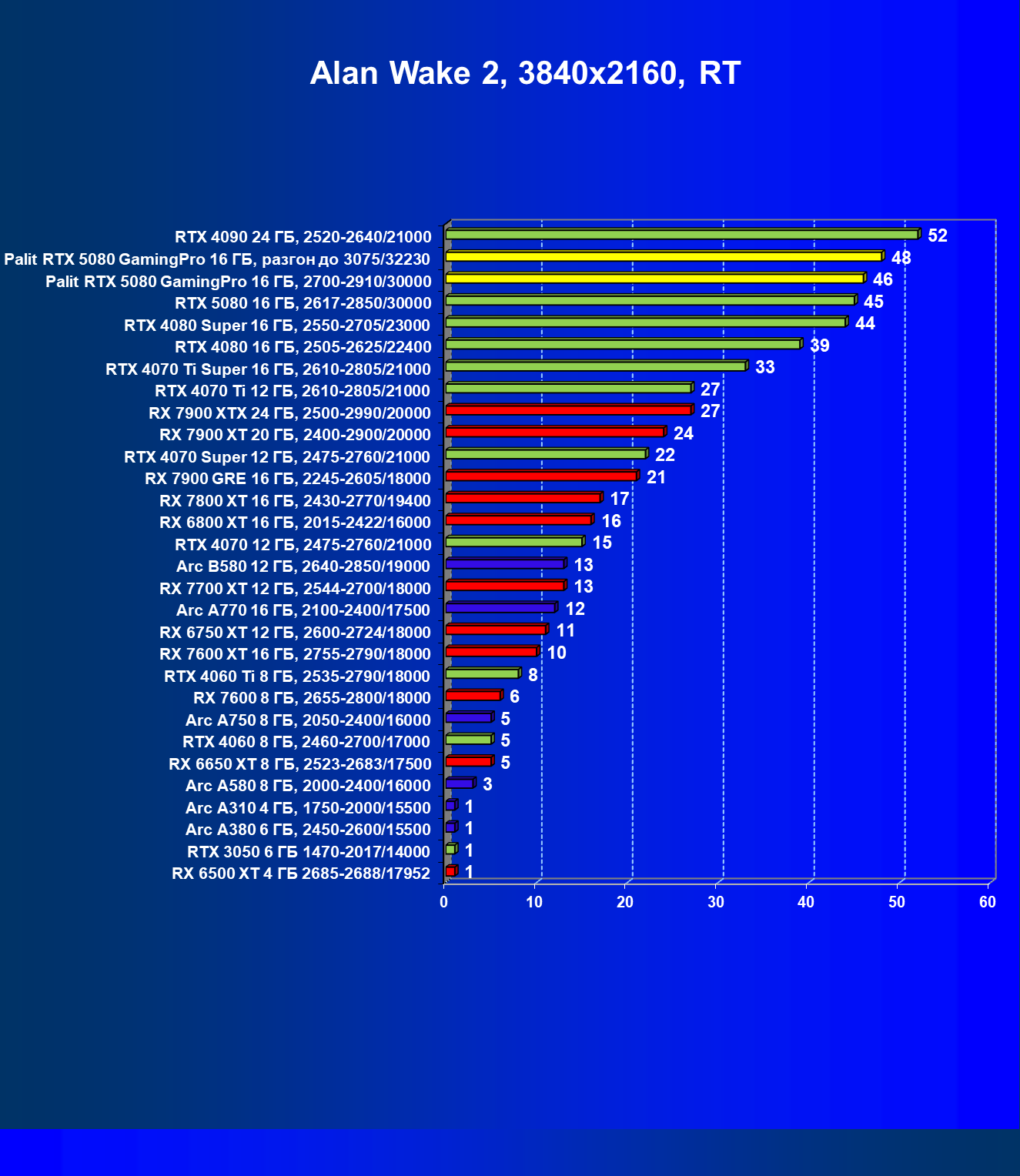 | 24 | Palit RTX 5080 GamingPro 16 ГБ, 2700—2910/30000 | 302 | 5134 | 170 000 |