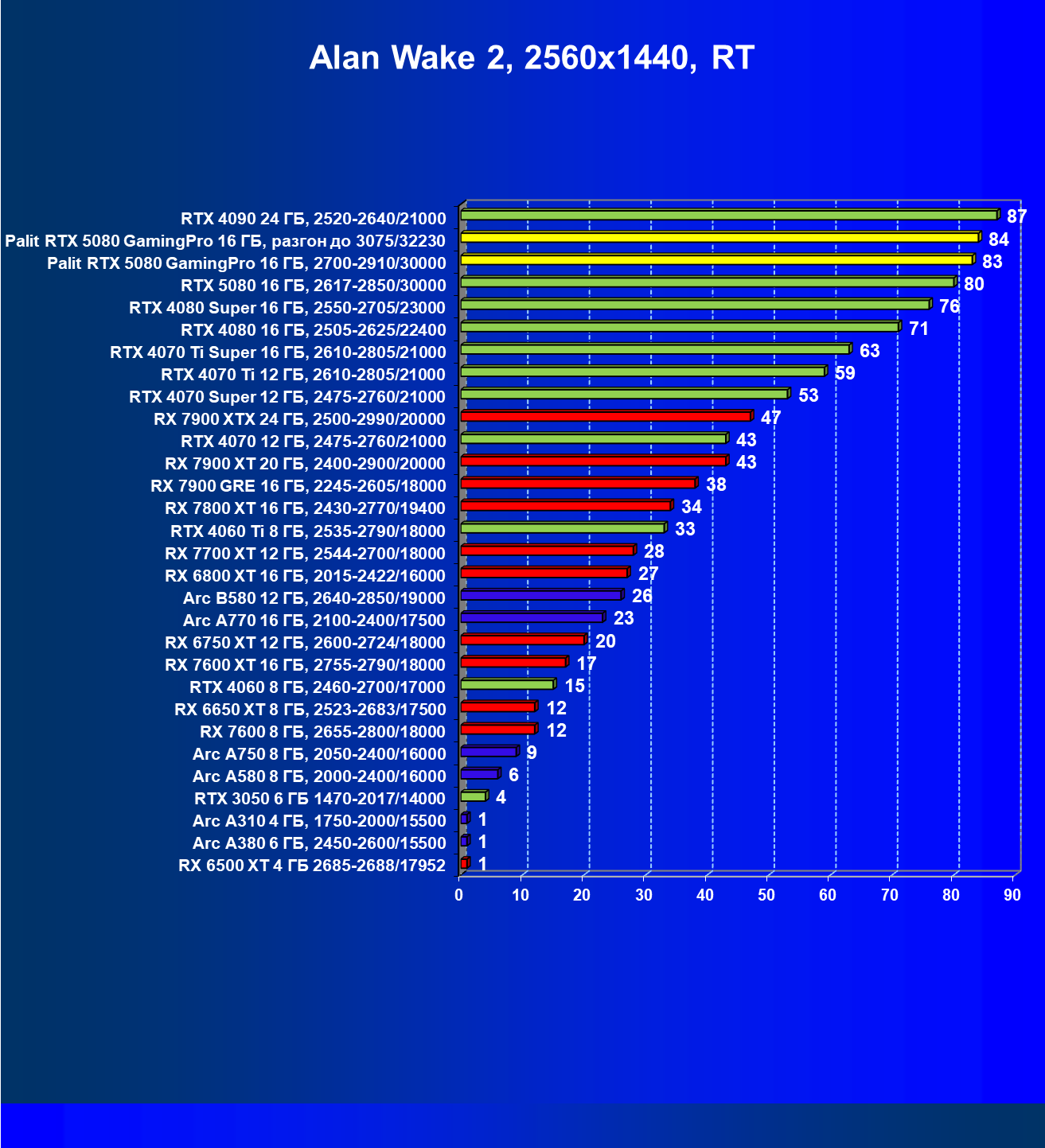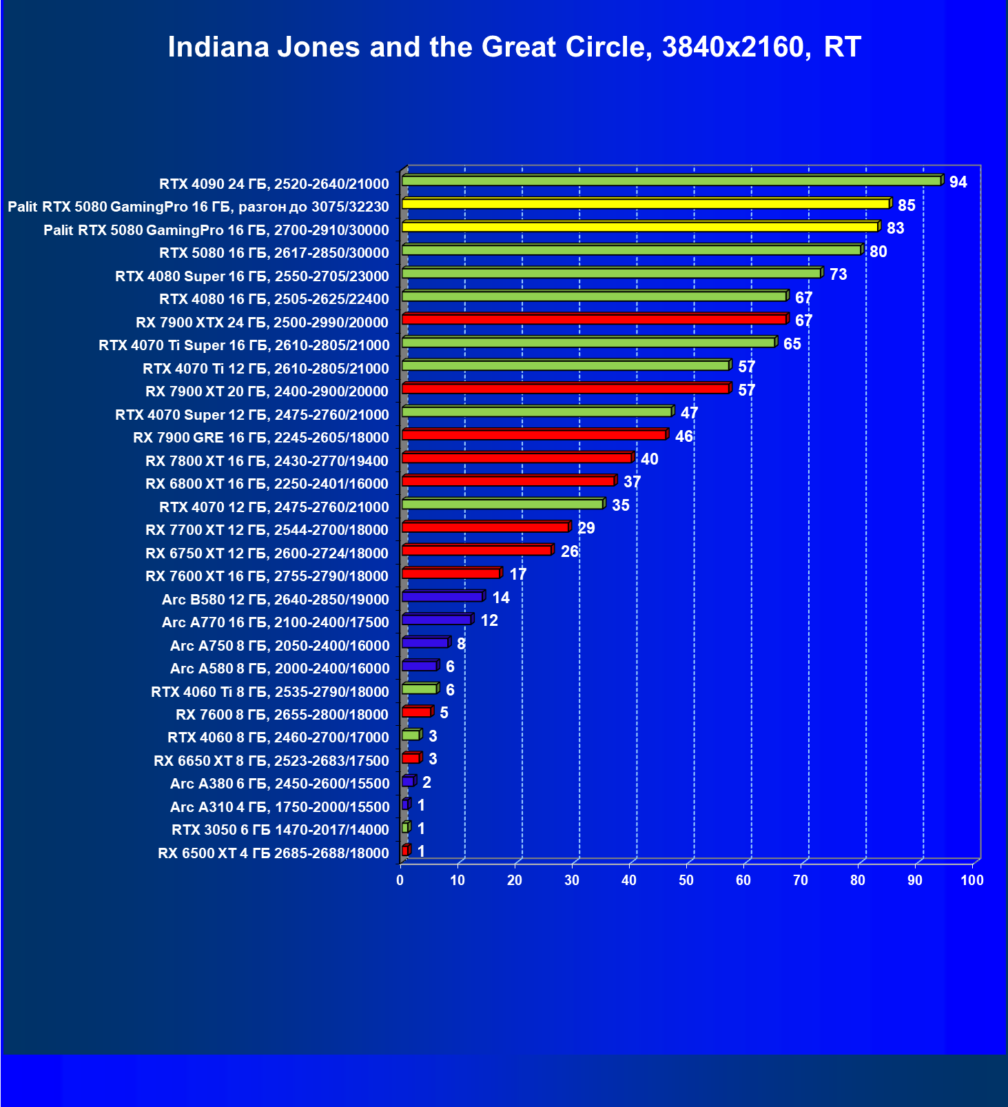 | 03 | Palit RTX 5080 GamingPro 16 ГБ, 2700—2910/30000 | 5134 | 302 | 170 000 |