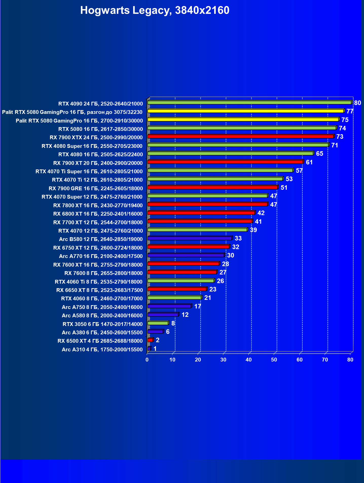 | 06 | Palit RTX 5080 GamingPro 16 ГБ, 2700—2910/30000 | 781 | 13271 | 170 000 |