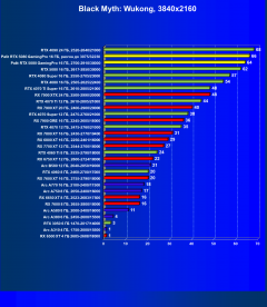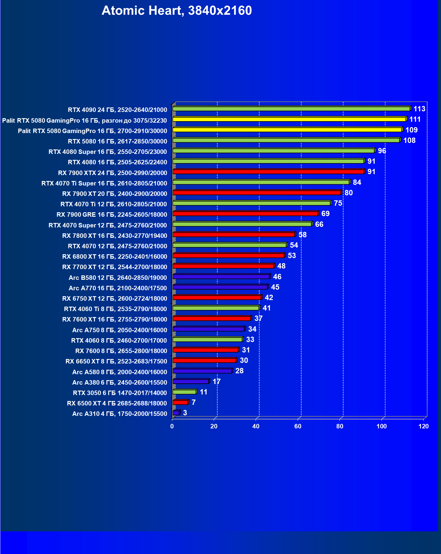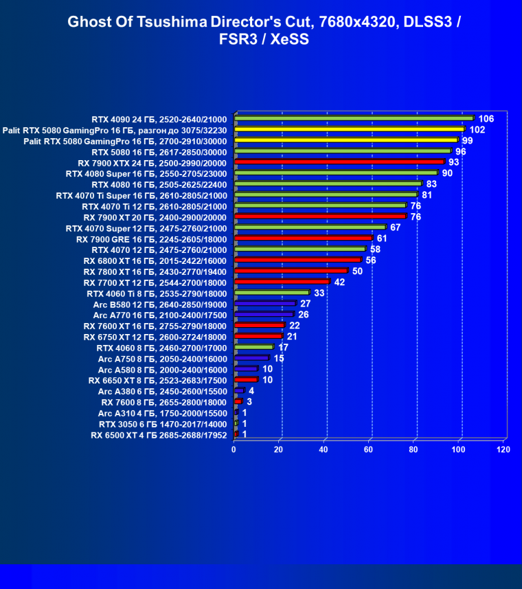 В классических играх в разрешении 4K GeForce RTX 5080 опережает GeForce RTX 4080 Super в среднем на 9%, GeForce RTX 4080 — на 17%, а Radeon RX 7900 XTX — на 13%. При этом GeForce RTX 5080 отстает от флагмана предыдущего поколения GeForce RTX 4090 на 7%. Карта Palit из-за фабрично повышенных частот GPU превосходит референсный вариант на 2,9%, а при ручном разгоне — на 5,3%.