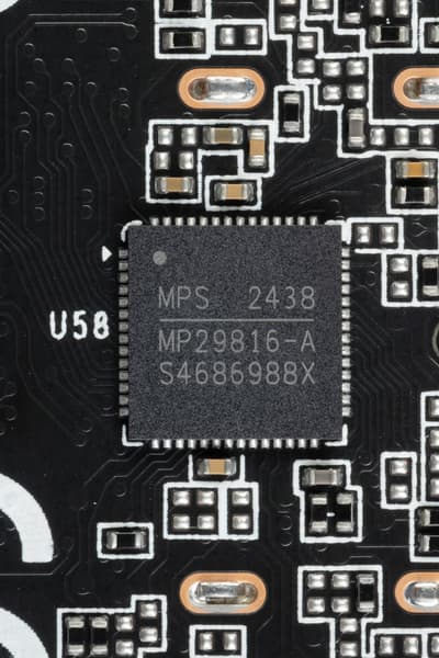 14 фазами питания ядра управляет ШИМ-контроллер MP29816 (Monolithic Power Systems). Он рассчитан максимум на 16 фаз и расположен на тыльной стороне платы.