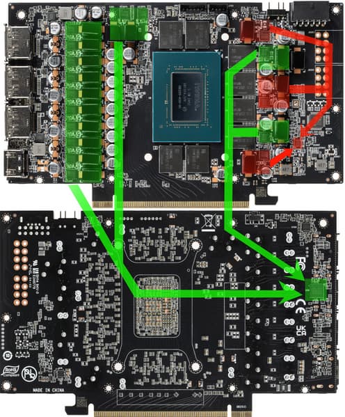 Зеленым цветом отмечена схема питания ядра, красным — памяти.