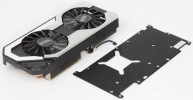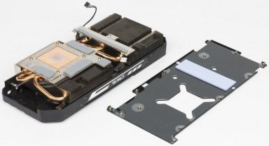 Главной частью кулера являются два пластинчатых никелированных радиатора, соединенные между собой тепловыми трубками, которые впрессованы в медное основание основного радиатора и обеспечивают равномерное распределение тепла по ребрам. Поверх радиаторов установлен кожух с двумя вентиляторами, работающими на одинаковой частоте вращения. Микросхемы памяти охлаждаются основным радиатором, а для охлаждения силовых транзисторов на втором радиаторе есть особая подошва с термоинтерфейсом. С оборотной стороны карта прикрывается специальной пластиной, которая не только обеспечивает жесткость печатной платы, но и участвует в охлаждении, прижимаясь к PCB со стороны силовых элементов через термоинтерфейс.