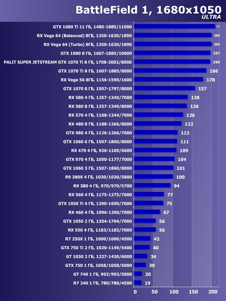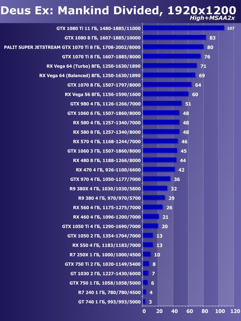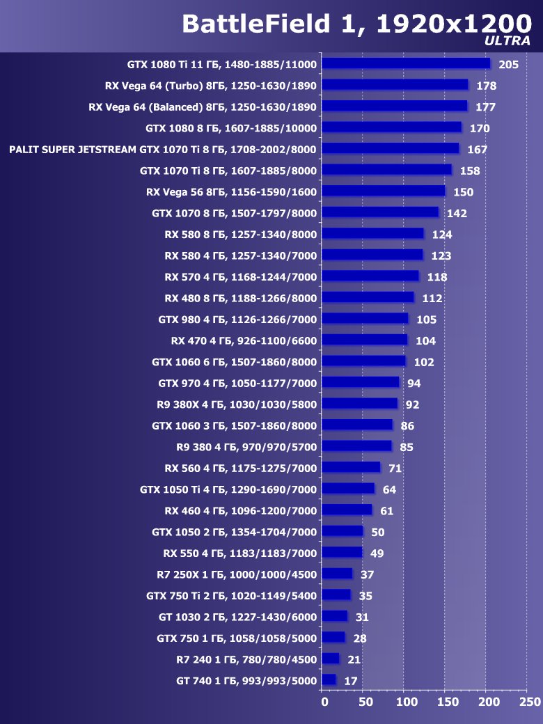 | 14 | Palit Super Jetstream GTX 1070 Ti 8 ГБ, 1708—2002/8000 | 613 | 2390 | 39 000 |