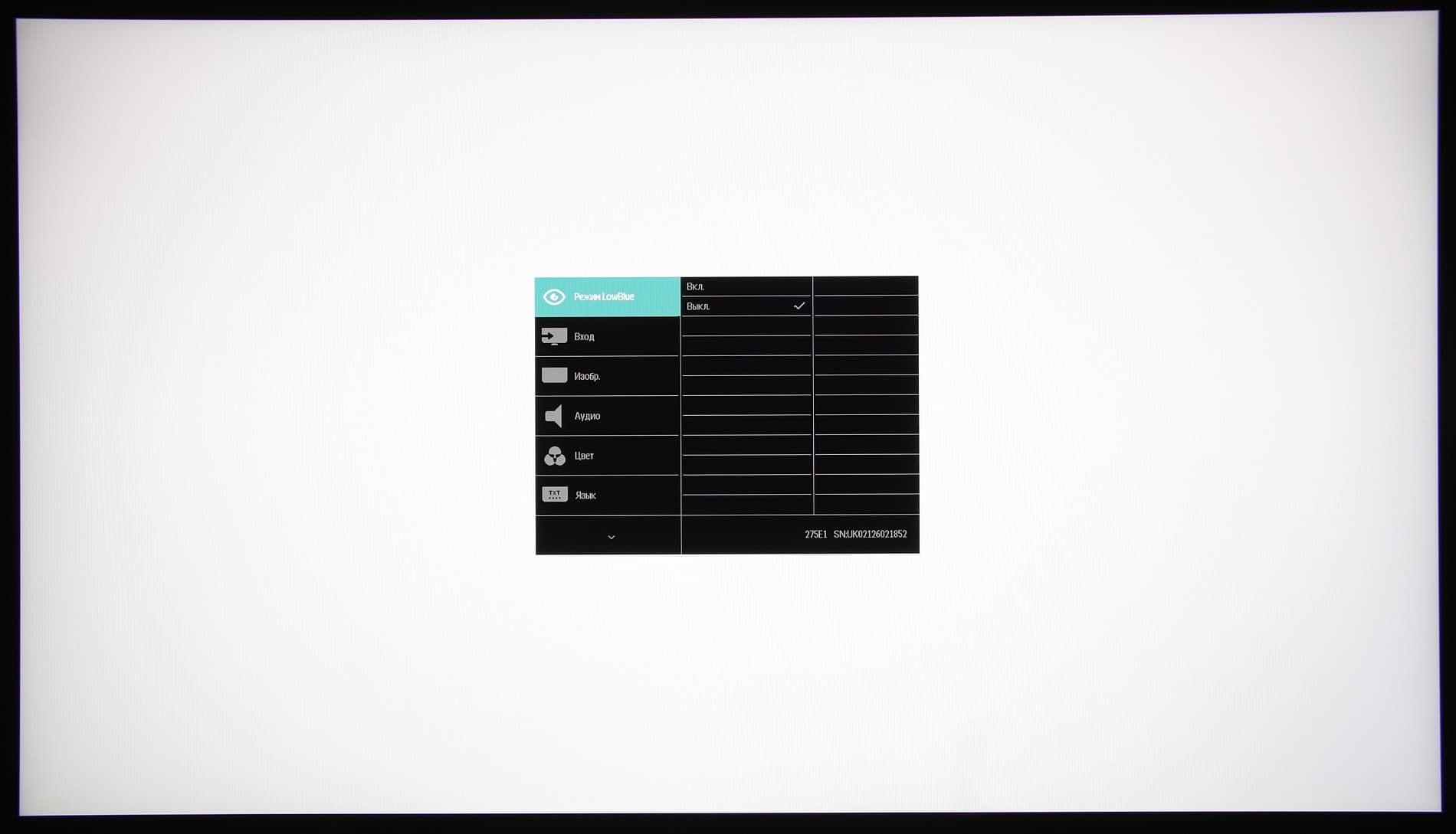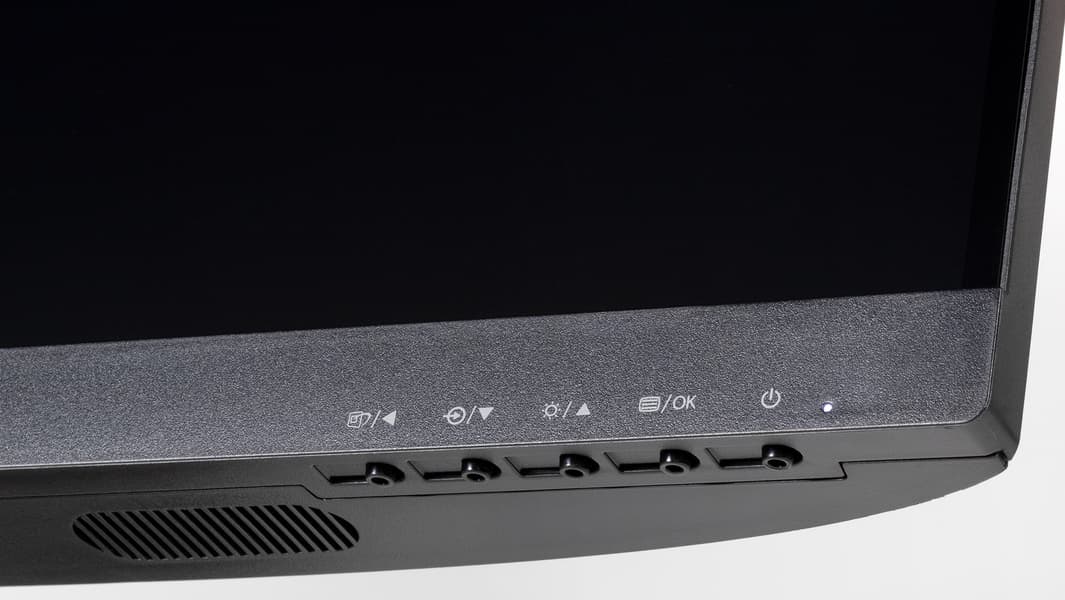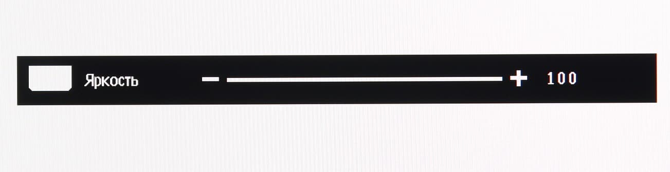 Индикатор питания при работе неярко светится белым, в режиме ожидания — медленно мигает белым и не горит, если монитор условно (механического выключателя питания, к сожалению, нет) выключен. Когда на экране нет меню, то при первом нажатии на первую (если слева направо) кнопку выводится меню выбора профили изображения, на вторую — меню выбора входа, на третью — окошко с бегунком яркости, на четвертую — главное меню с настройками. Меню достаточно крупное, надписи читаемые.
