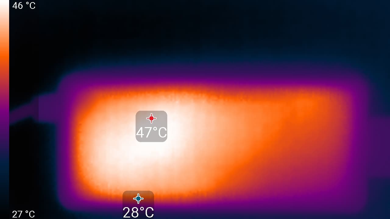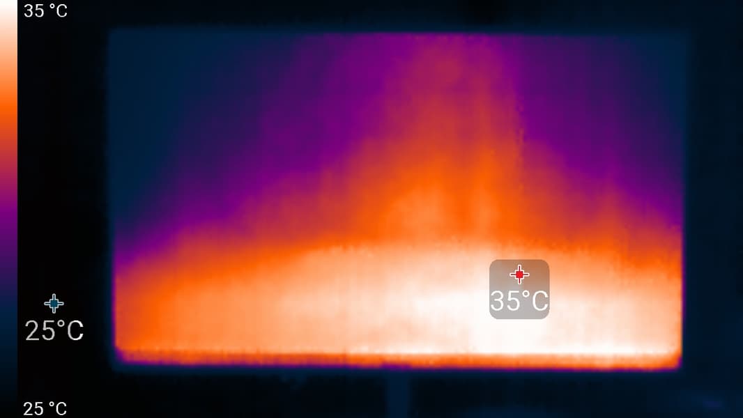 Нагрев умеренный. Повышенный нагрев нижнего края экрана показывает, что внизу находится светодиодная линейка подсветки экрана. Корпус БП нагрелся до 47 °C, что немало, но еще не критично: