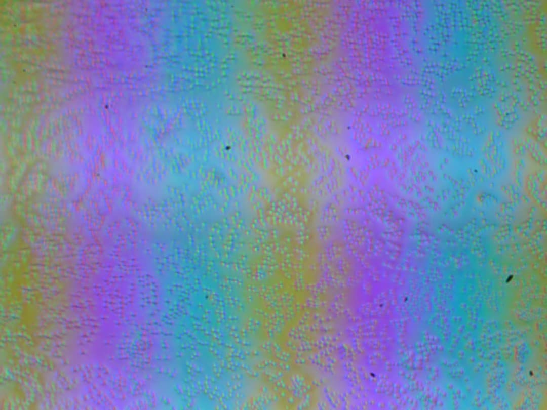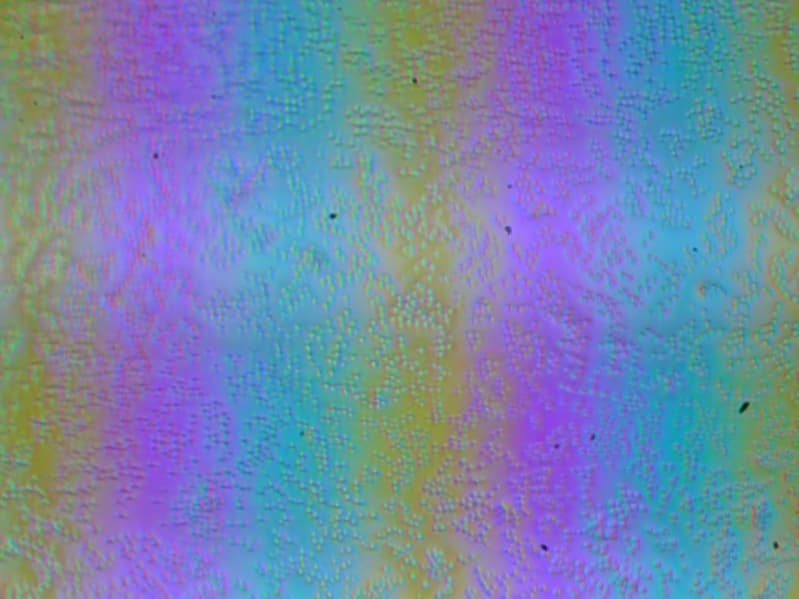 Зерно этих дефектов в несколько раз меньше размеров субпикселей (масштаб этих двух фотографий одинаковый), поэтому фокусировка на микродефектах и «перескок» фокуса по субпикселям при изменении угла зрения выражены слабо, из-за этого нет и «кристаллического» эффекта.