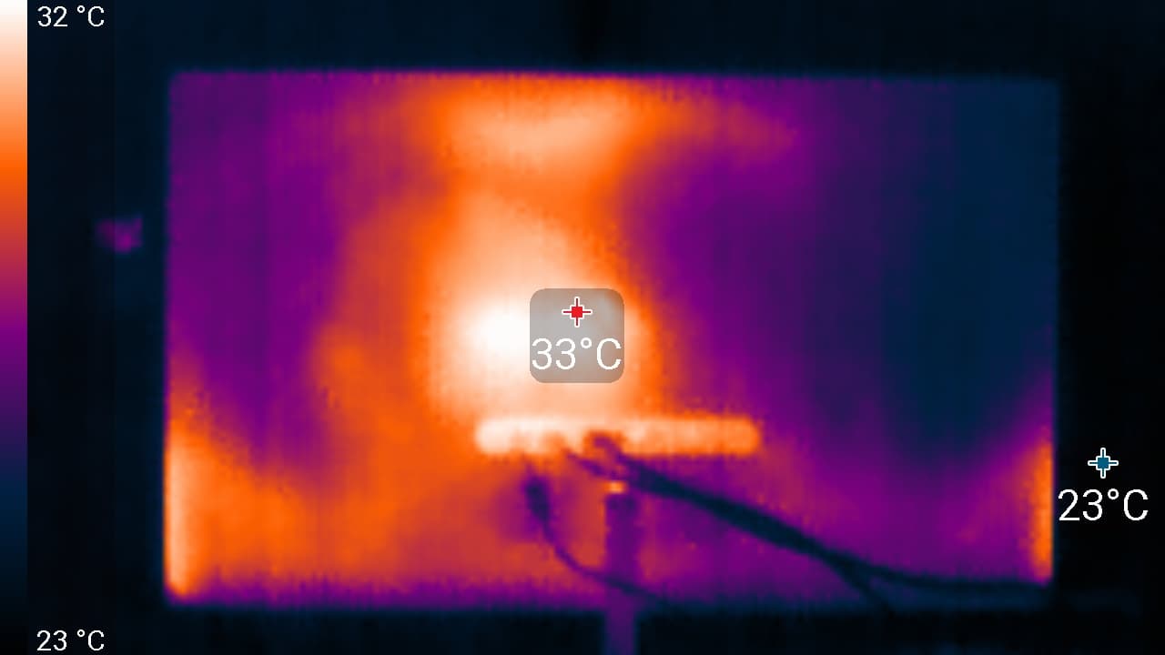 Нагрев монитора можно оценить по приведенным снимкам с ИК-камеры, полученным после долговременной работы монитора на максимальной яркости в помещении с температурой примерно 24 °C: