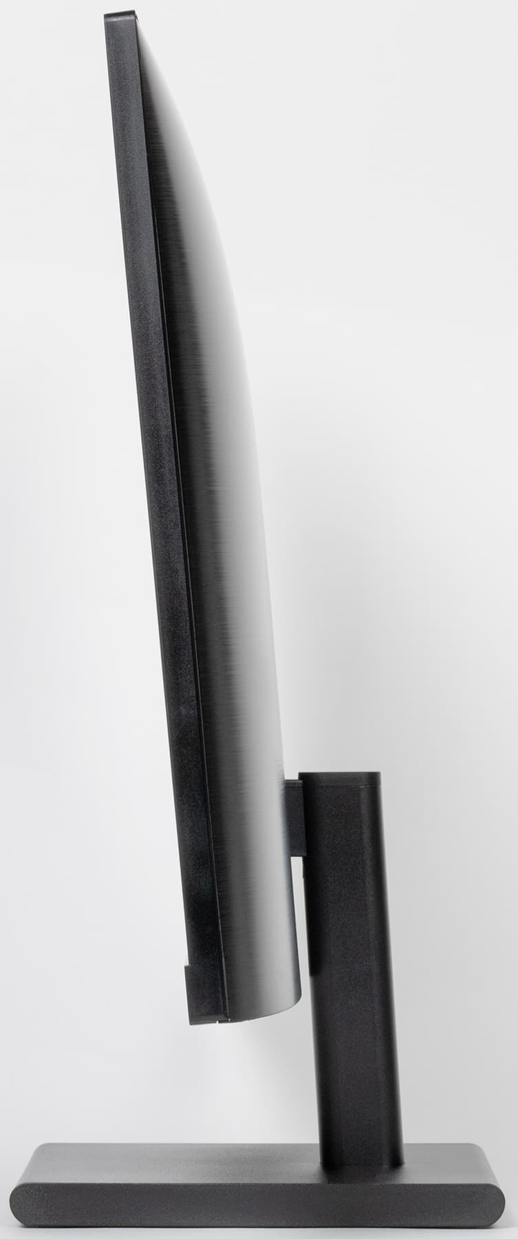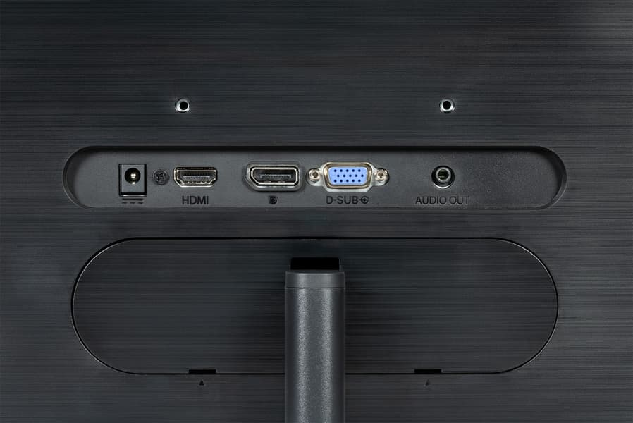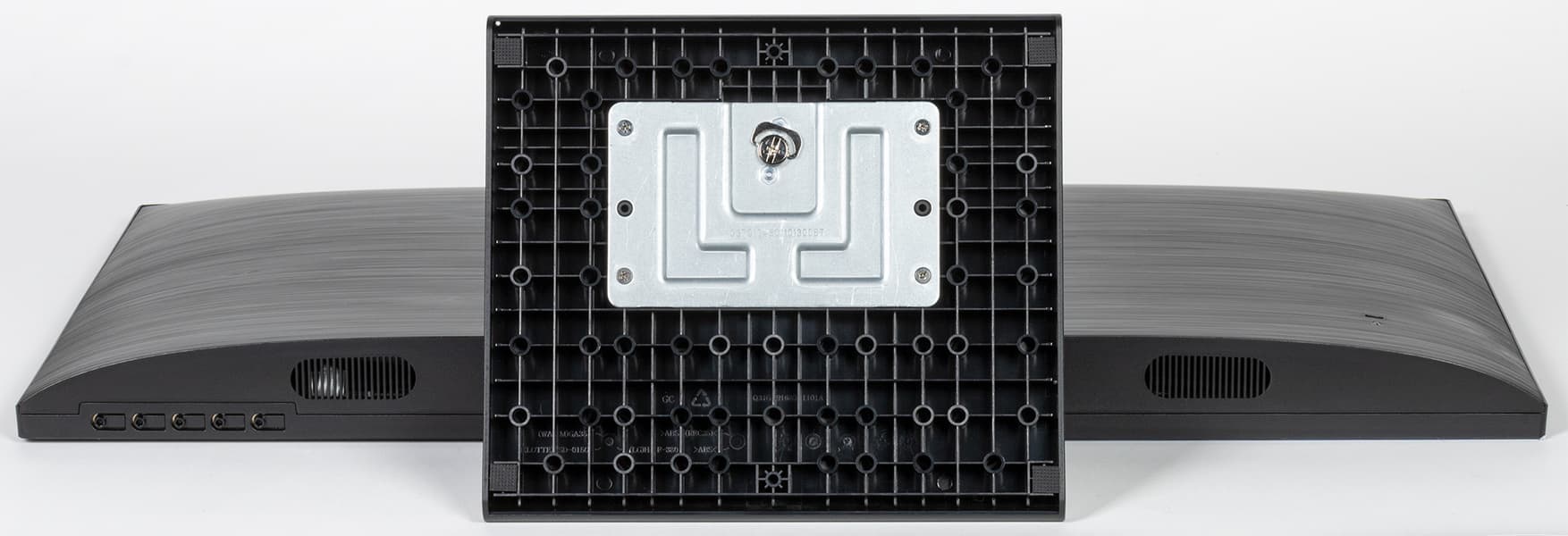 Панели и кожухи блока экрана и подставки изготовлены из пластика в основном с матовой поверхностью черного цвета. Внешняя поверхность матрицы черная, полуматовая. Экран выглядит как монолитная поверхность, ограниченная снизу пластиковой планкой, а сверху и с боков — узкой пластиковой окантовкой. Выведя изображение, можно увидеть, что между планкой и окантовкой и собственно областью отображения есть неширокие поля (сверху и с боков по 5,5 мм, а снизу — 1,5 мм). По центру фронтальной планки и на задней панели есть логотипы производителя. Первый выполнен серебристой краской, а второй образован слегка вдавленными участками с глянцевой поверхностью.