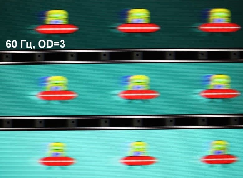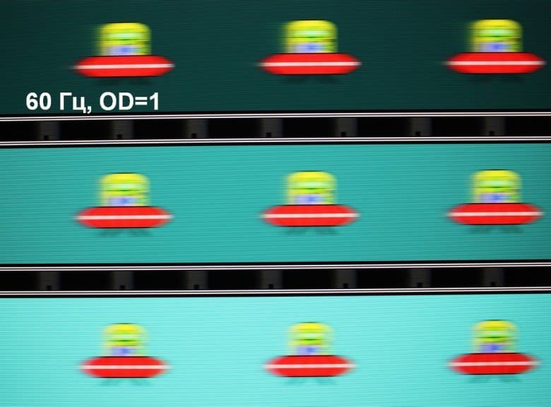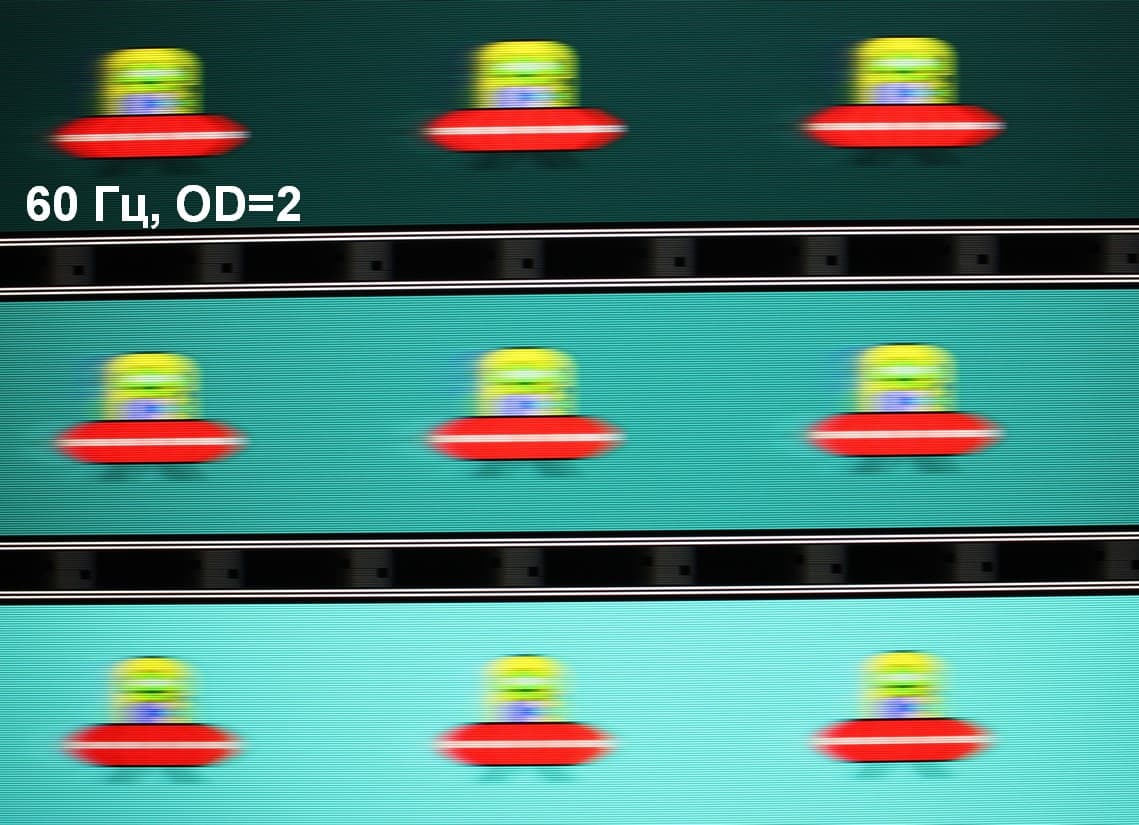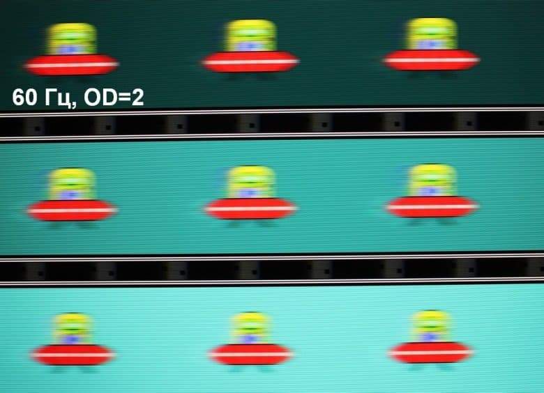 Видно, что при прочих равных условиях четкость изображения повышается по мере роста частоты обновления (в данном случае незначительно) и степени разгона, но на максимальном разгоне артефакты (шлейф позади тарелки) уже очень заметные.
