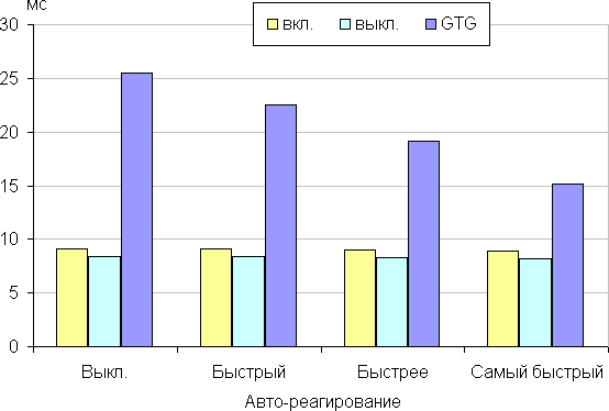 Время отклика зависит от значения настройки Авто-реагирование, которая управляет разгоном матрицы. Ступеней регулировки четыре. Диаграмма ниже показывает, как меняется время включения и выключения при переходе черный-белый-черный (столбики «вкл.» и «выкл.»), а также среднее суммарное время для переходов между полутонами (столбики GTG):