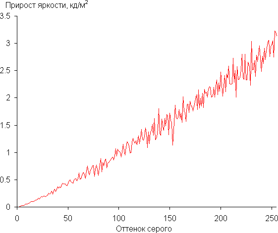 Реальная гамма-кривая ближе всего к стандартной при Gamma = 2.2, поэтому далее мы измерили яркость 256 оттенков серого (от 0, 0, 0 до 255, 255, 255) при этом значении. График ниже показывает прирост (не абсолютное значение!) яркости между соседними полутонами: