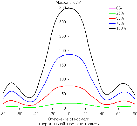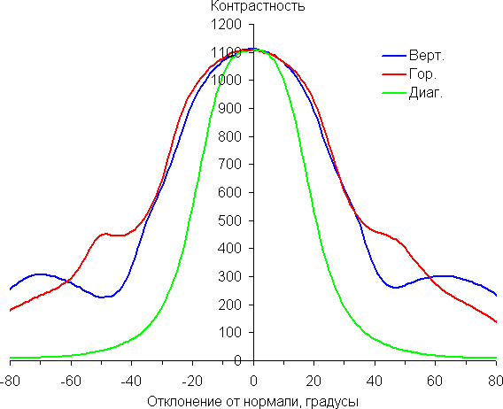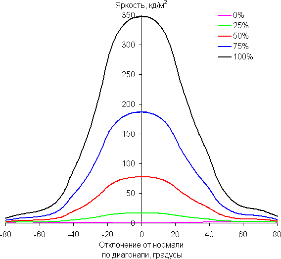 По скорости снижения яркости углы обзора не очень широкие, что для матрицы типа IPS нехарактерно. При отклонении в диагональном направлении яркость черного поля начинает резко возрастать уже при 20°-30° отклонения от перпендикуляра к экрану. Если сидеть не очень далеко от экрана, то черное поле по углам будет заметно светлее, чем в центре (оставаясь условно нейтрально-серым). Контрастность в диапазоне углов ±82° в случае отклонения по диагонали приближается к отметке 10:1 и опускается ниже при −75° и +74°.
