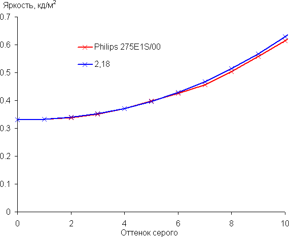 Однако визуально первый оттенок серого все же не отличим по яркости от черного цвета. Аппроксимация полученной гамма-кривой дала показатель 2,18, что близко к стандартному значению 2,2. При этом реальная гамма-кривая почти не отклоняется от аппроксимирующей степенной функции: