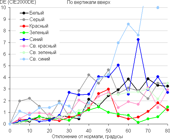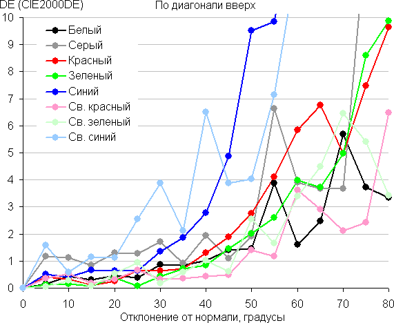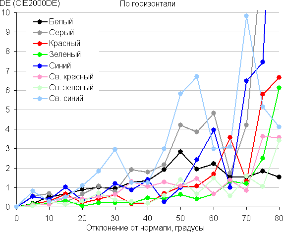 Для количественной характеристики изменения цветопередачи мы провели колориметрические измерения для белого, серого (127, 127, 127), красного, зеленого и синего, а также светло-красного, светло-зеленого и светло-синего полей во весь экран с использованием установки, подобной той, что применялась в предыдущем тесте. Измерения проводились в диапазоне углов от 0° (датчик направлен перпендикулярно к экрану) до 80° с шагом в 5°. Полученные значения интенсивностей были пересчитаны в ΔE относительно замера каждого поля при перпендикулярном положении датчика относительно экрана. Результаты представлены ниже: