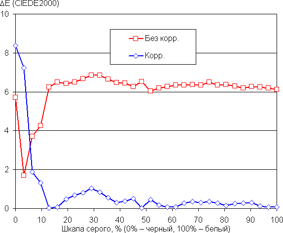 Самый близкий к черному диапазон можно не учитывать, так как в нем цветопередача не так важна, а погрешность измерения цветовых характеристик высокая. Ручная коррекция улучшила баланс до уровня профессиональных моделей, но с практической точки зрения цветовой баланс достаточно хороший даже просто при выборе профиля Особый без коррекции (прилагаем цветовой профиль, созданный нами во время тестирования с помощью ПО DisplayCAL для этого варианта).