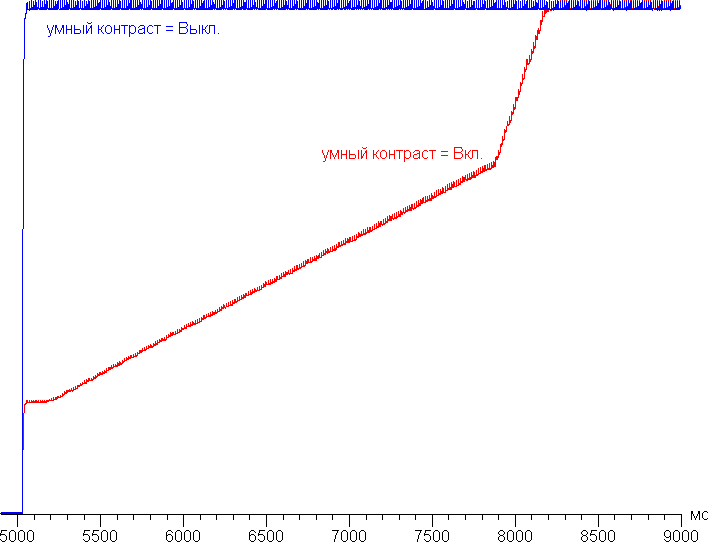 При включении режима с динамическим управлением яркости установившаяся междукадровая контрастность формально возрастает, но не до бесконечности, так как даже на черном поле во весь экран подсветка совсем не выключается. График ниже показывает, как увеличивается яркость (вертикальная ось) при переключении с черного поля во весь экран (после 5 секунд выдержки) на белое поле во весь экран при выключенной и включенной динамической подстройке яркости: